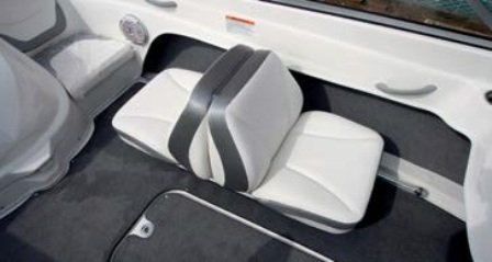 В носовом кокпите — привычный V-образный диван, под секциями которого обустроены рундуки. Такие же рундуки — под кормовыми креслами. А самый большой, для водных лыж или вейкборда — в центральном проходе, под ковриком. Кстати, в отличие от прежних моделей верфи с приклеенным к пайолу ковролином, здесь мягкие покрытия отстегиваются, их можно помыть и почистить вне лодки.