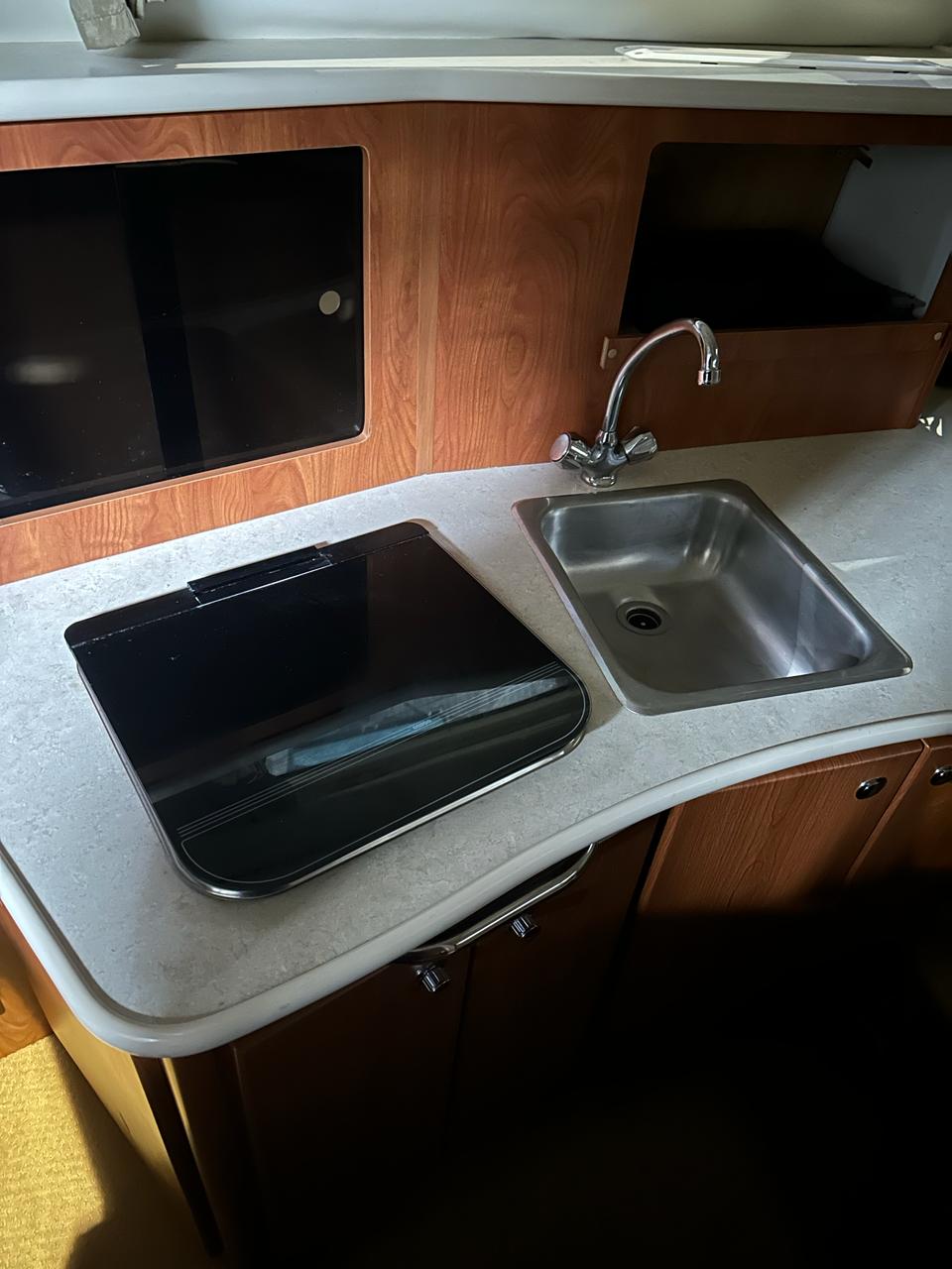 Это настоящий круизный катер с каютой, где можно встать во весь рост, стационарным камбузом и санузлом со всем необходимым, а обеденное место в салоне трансформируется в дополнительное спальное место.