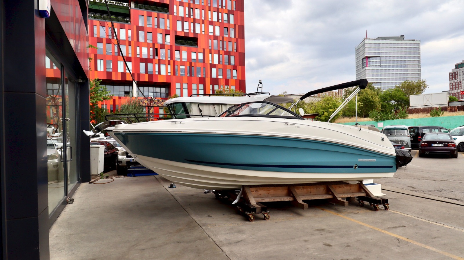 Серо-синий китовый цвет, белое днище, темно-синяя полоса по ватерлинии, полный ходовой тент, пакет необходимое оборудование без ковров, камбуз в кокпите, обивка песочного цвета, тик в кокпите, тик на плавательной платформе, якорная лебёдка, гидравлические транцевые плиты, прокачной туалет, масератор, буксировочный рым, покрытие днища необрастайкой