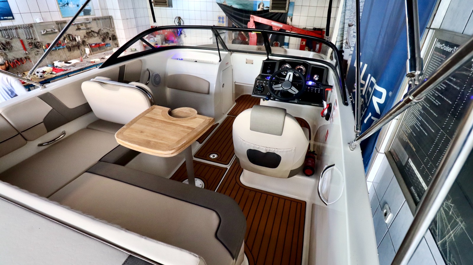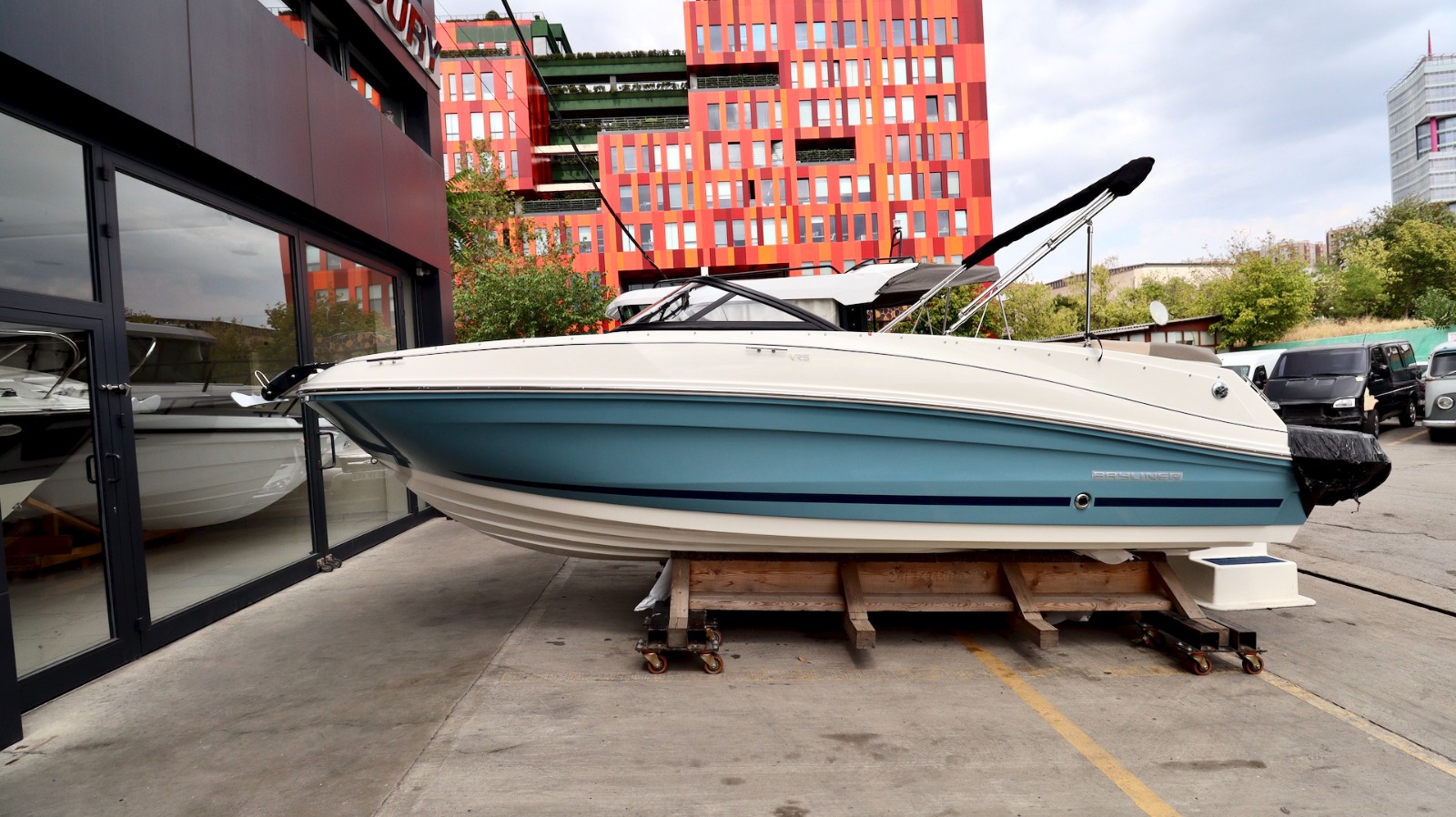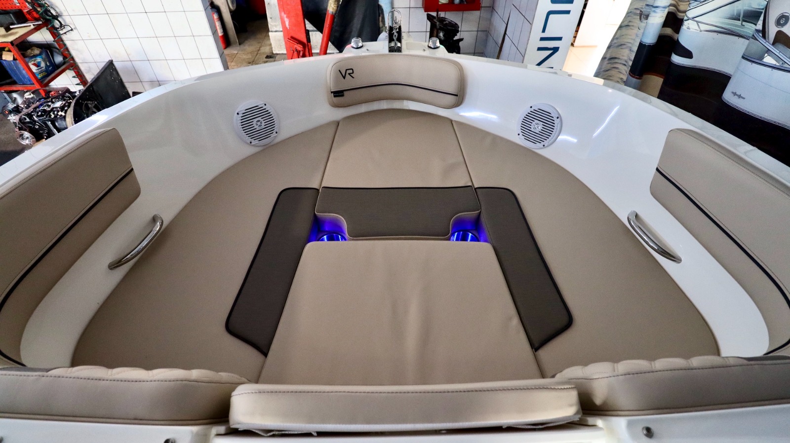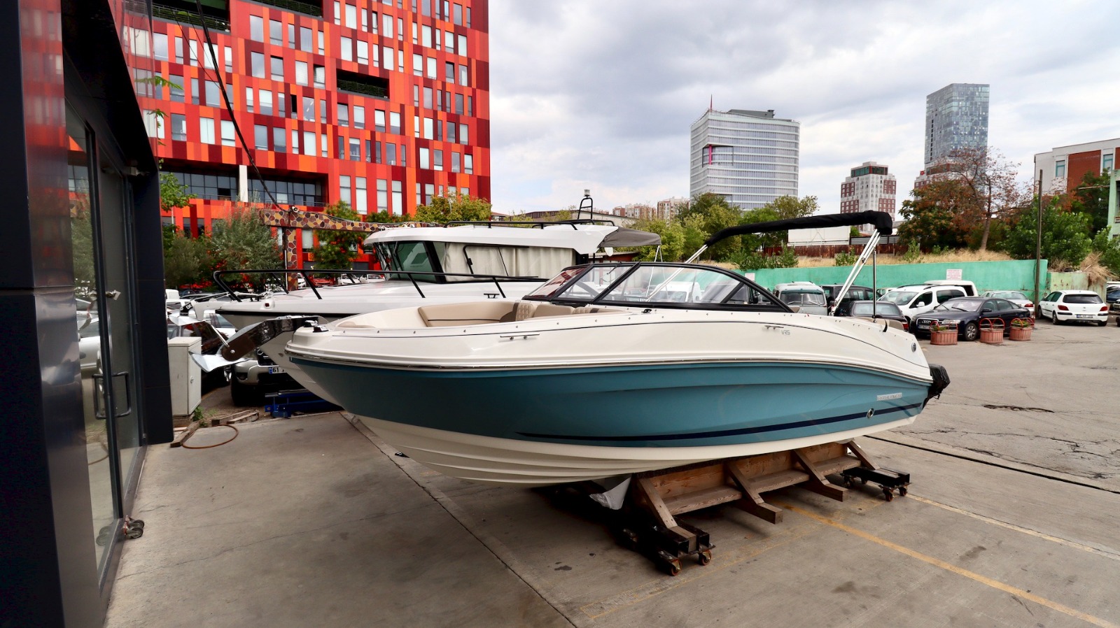 8 550 000 ₽Серо-голубой (китовый) цвет, темно-синяя полоса по ватерлинии, комплект тента бимини, пакет необходимое оборудование без ковров, обивка песочного цвета, комплект подушек, неопреновое покрытие платформы для купания под тик, неопреновое покрытие кокпита под тик, душ на транце, буксировочный пилон для водных лыж, ящик-холодильник, якорная лебедка, динамики в носовой части