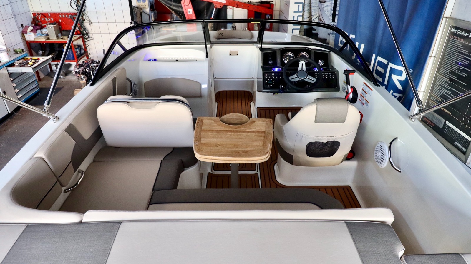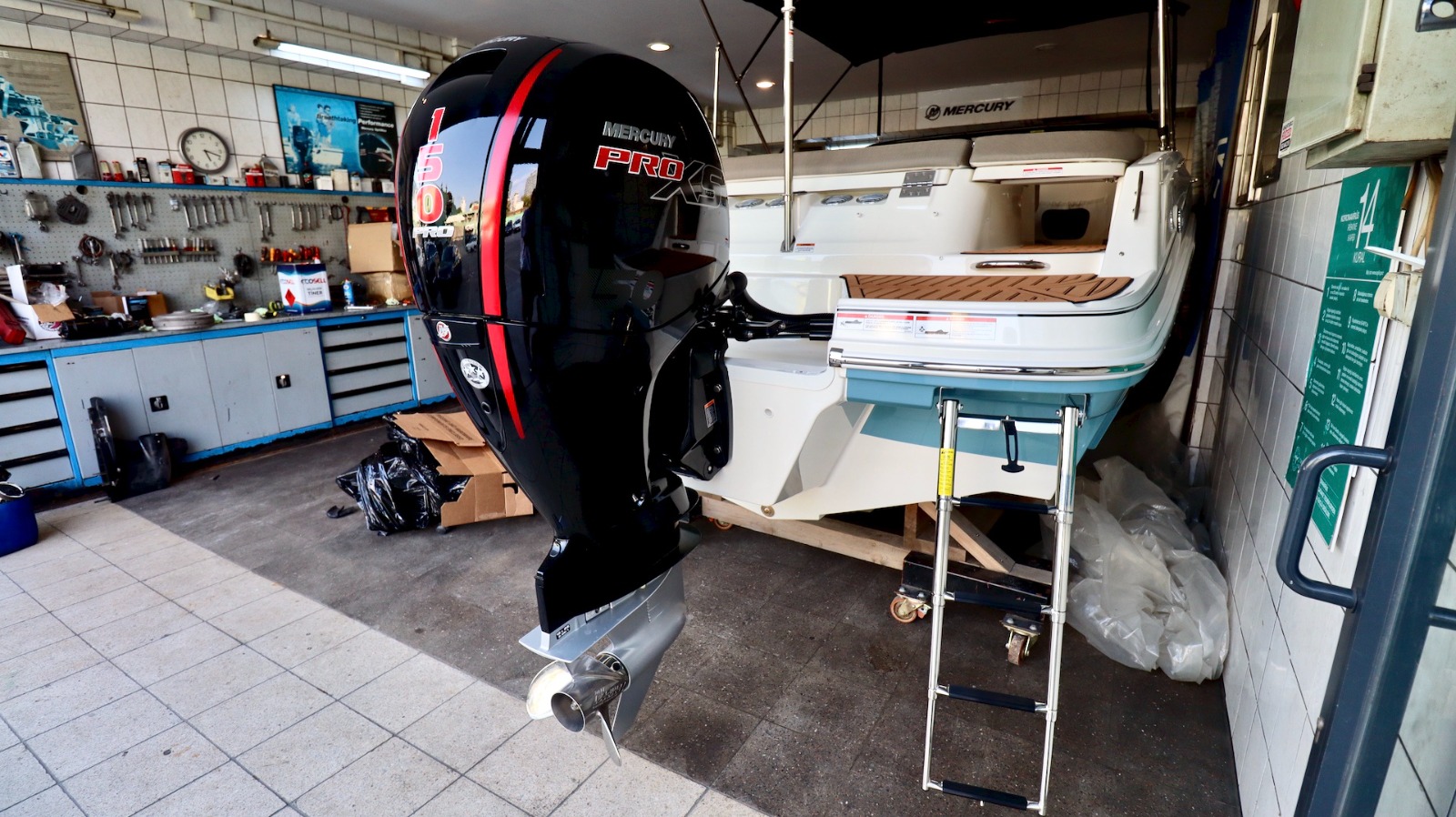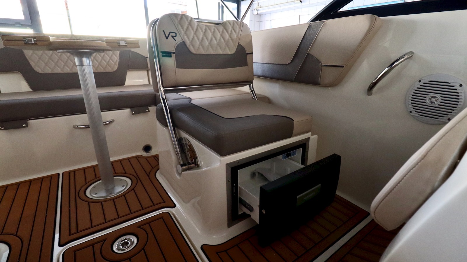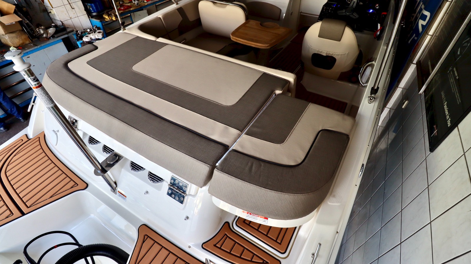 8 550 000 ₽Серо-голубой (китовый) цвет, темно-синяя полоса по ватерлинии, комплект тента бимини, пакет необходимое оборудование без ковров, обивка песочного цвета, комплект подушек, неопреновое покрытие платформы для купания под тик, неопреновое покрытие кокпита под тик, душ на транце, буксировочный пилон для водных лыж, ящик-холодильник, якорная лебедка, динамики в носовой части