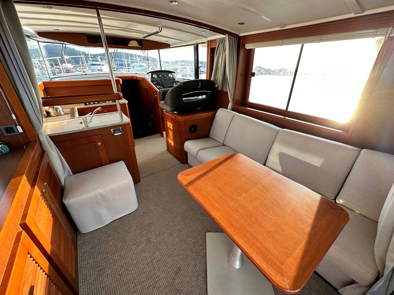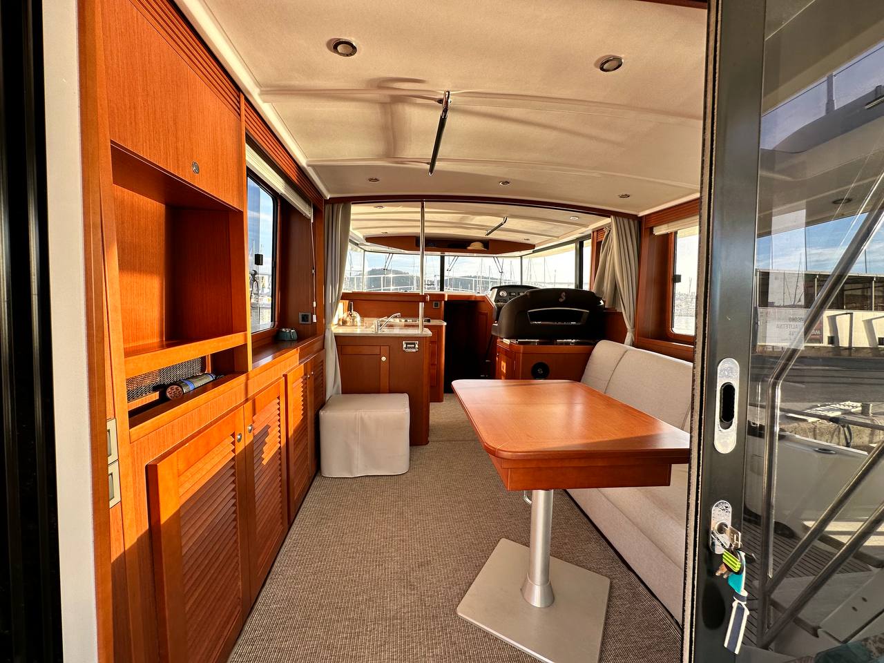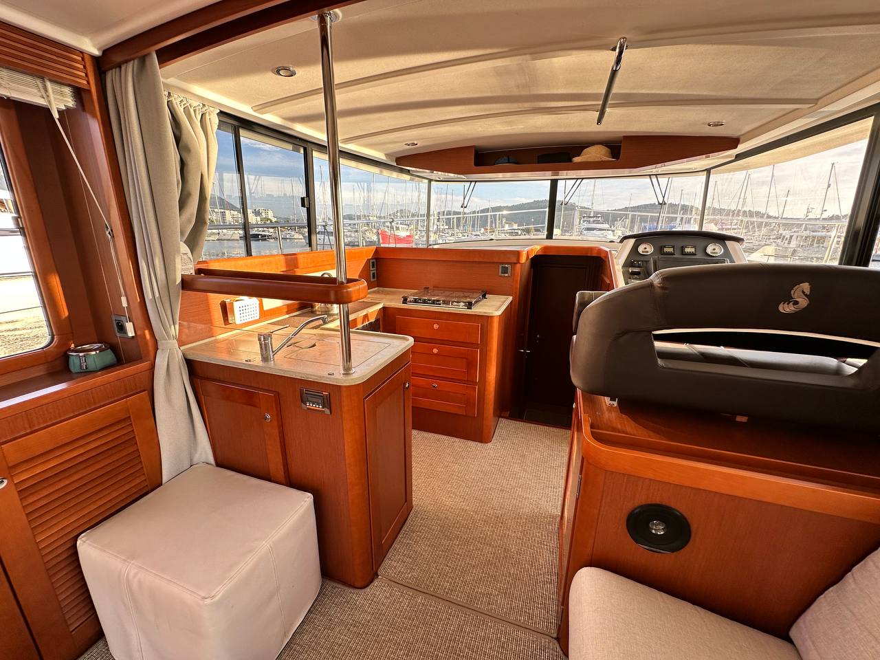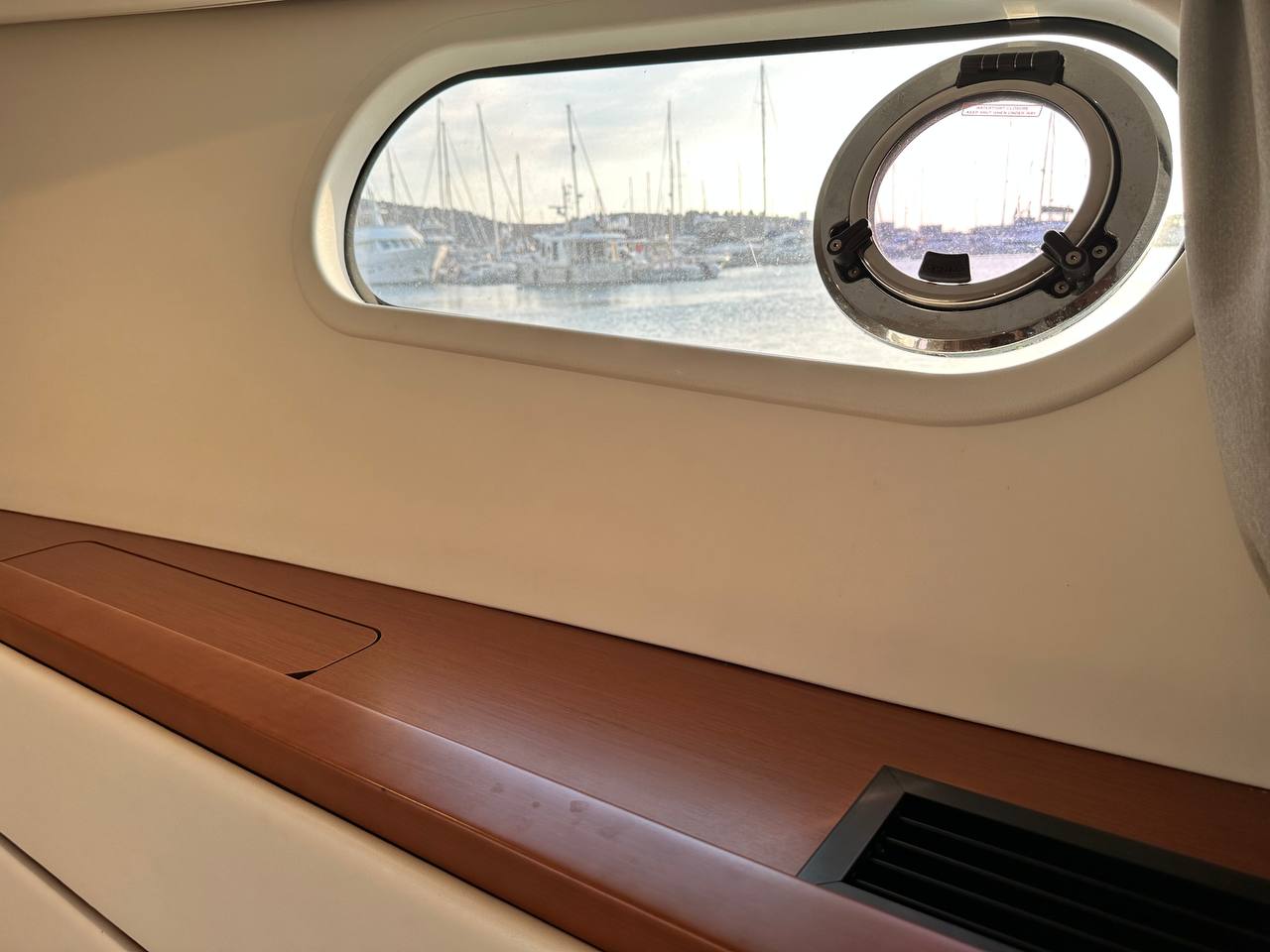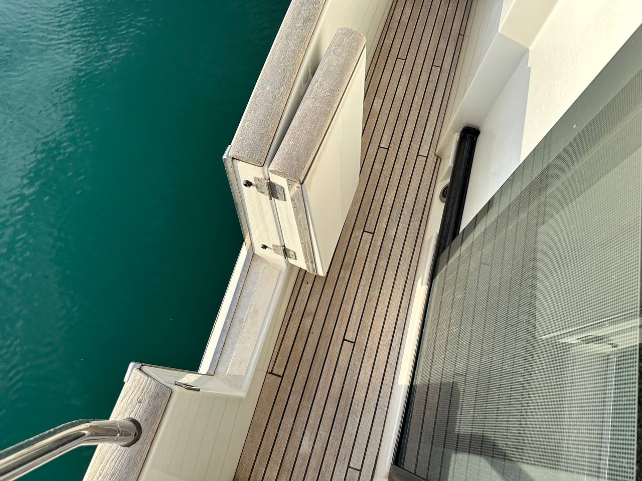- Салон флайбриджа по левому борту, состоящий из Г-образного дивана со встроенными запирающимися шкафчиками, съёмного тикового стола и обивки двухцветного цвета Diamante Storm & Snow PVC
