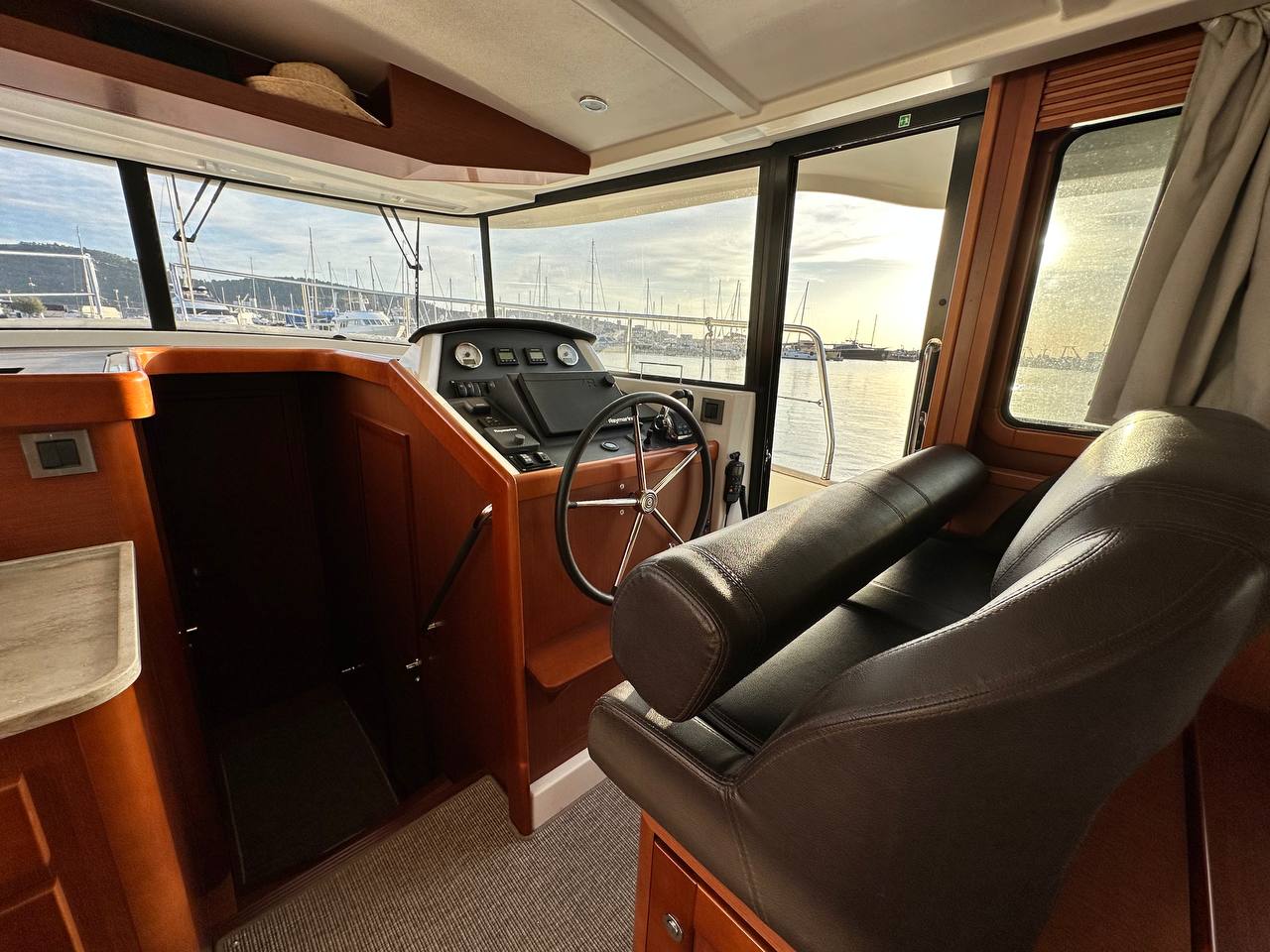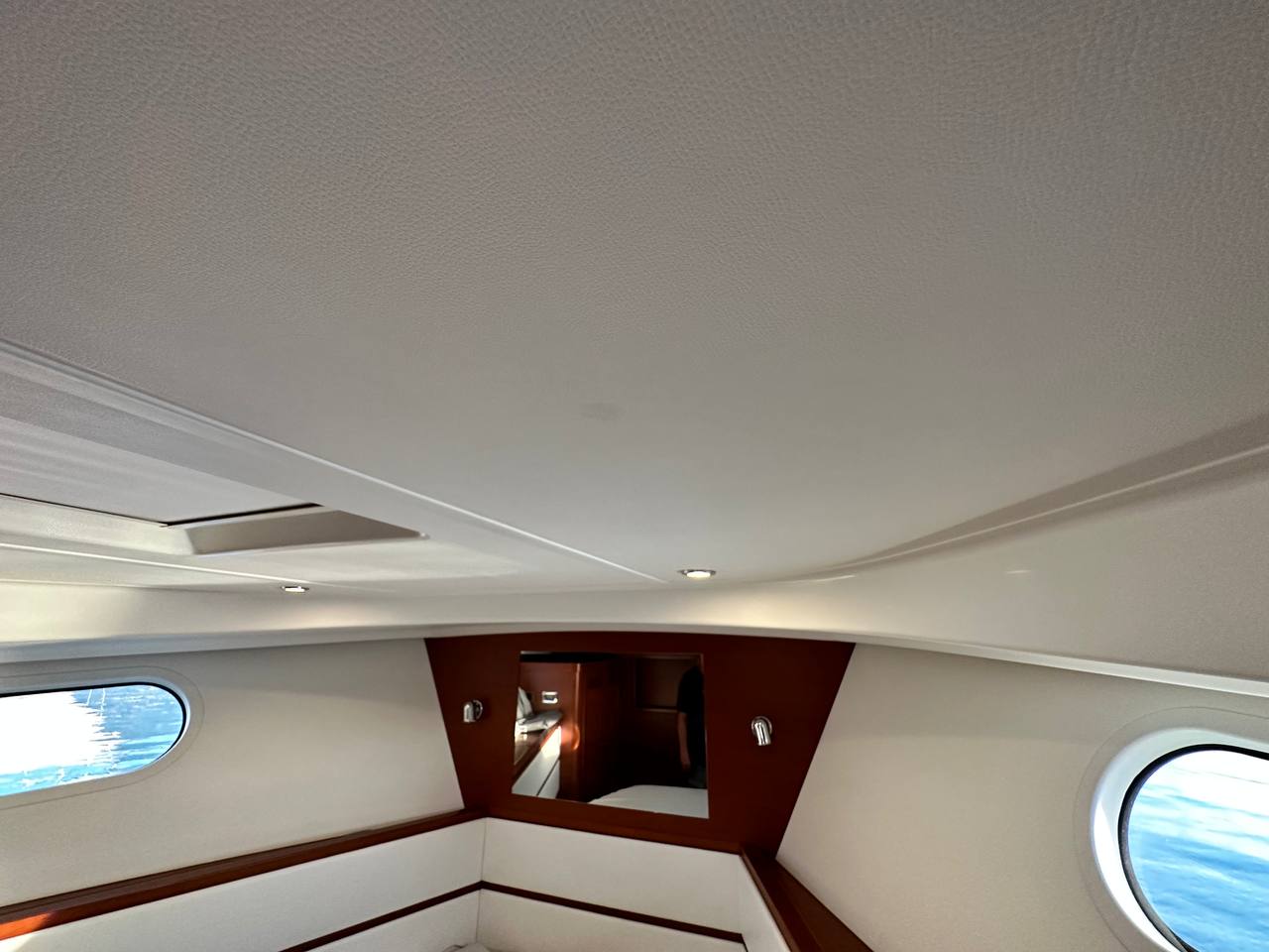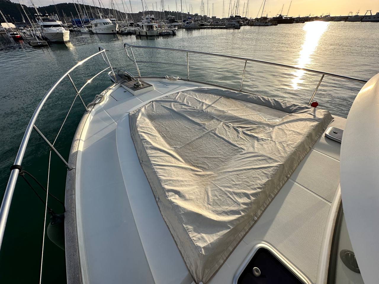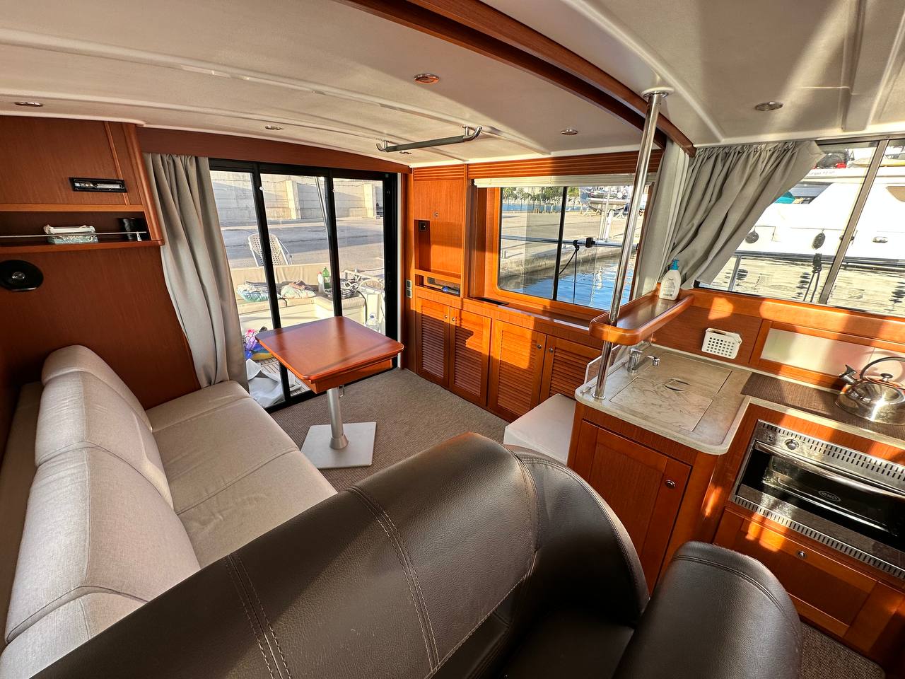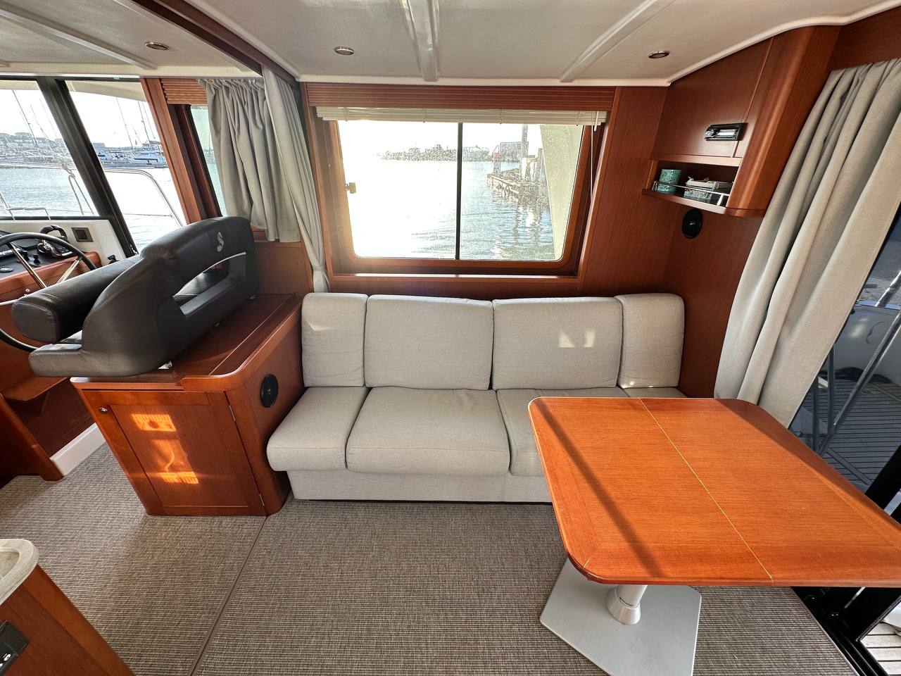 - Салон флайбриджа по левому борту, состоящий из Г-образного дивана со встроенными запирающимися шкафчиками, съёмного тикового стола и обивки двухцветного цвета Diamante Storm & Snow PVC