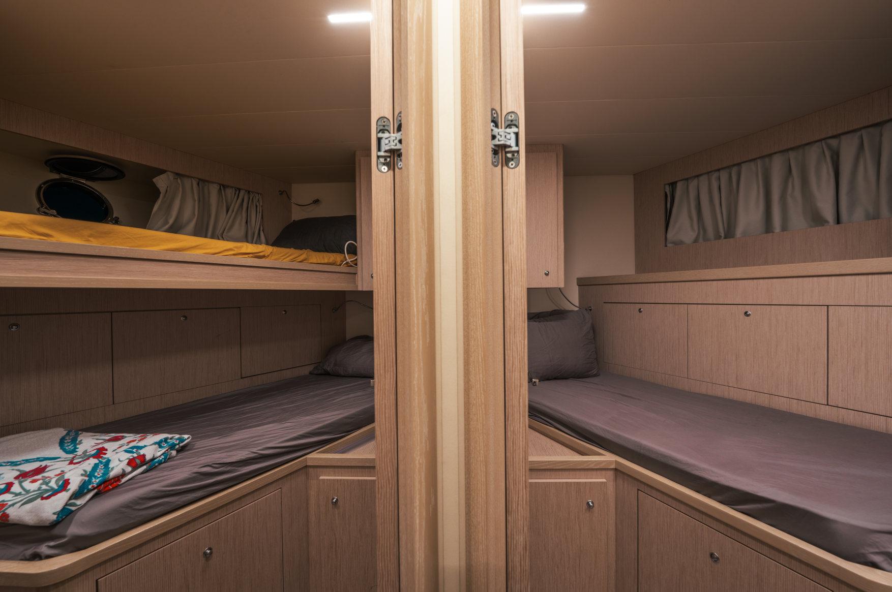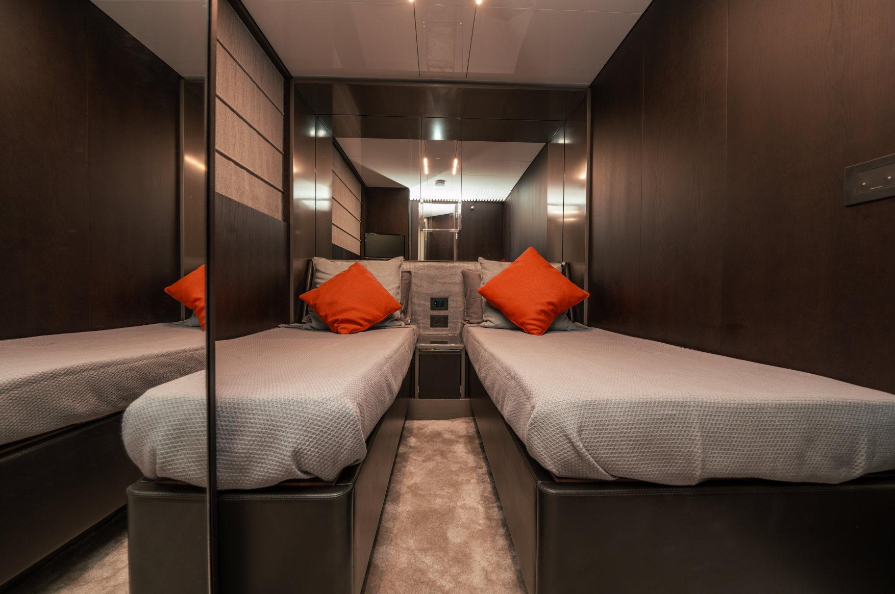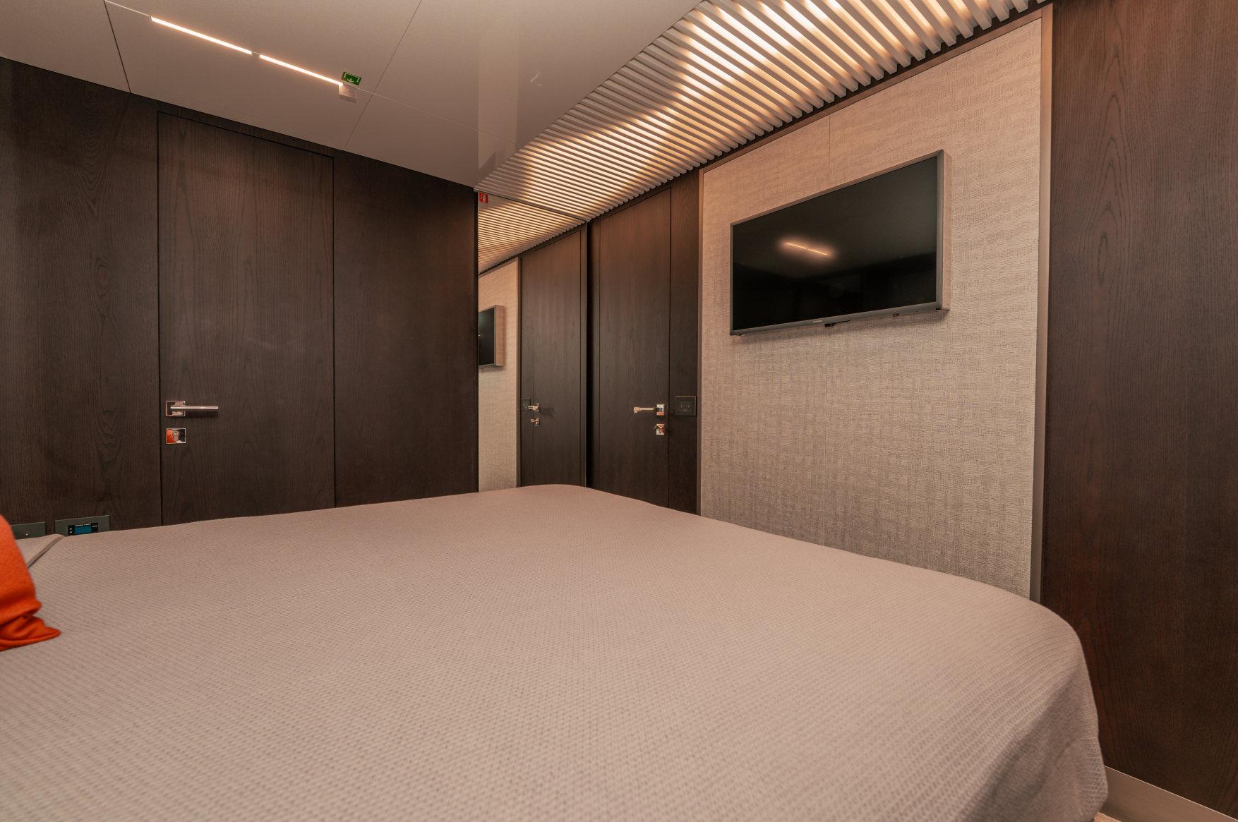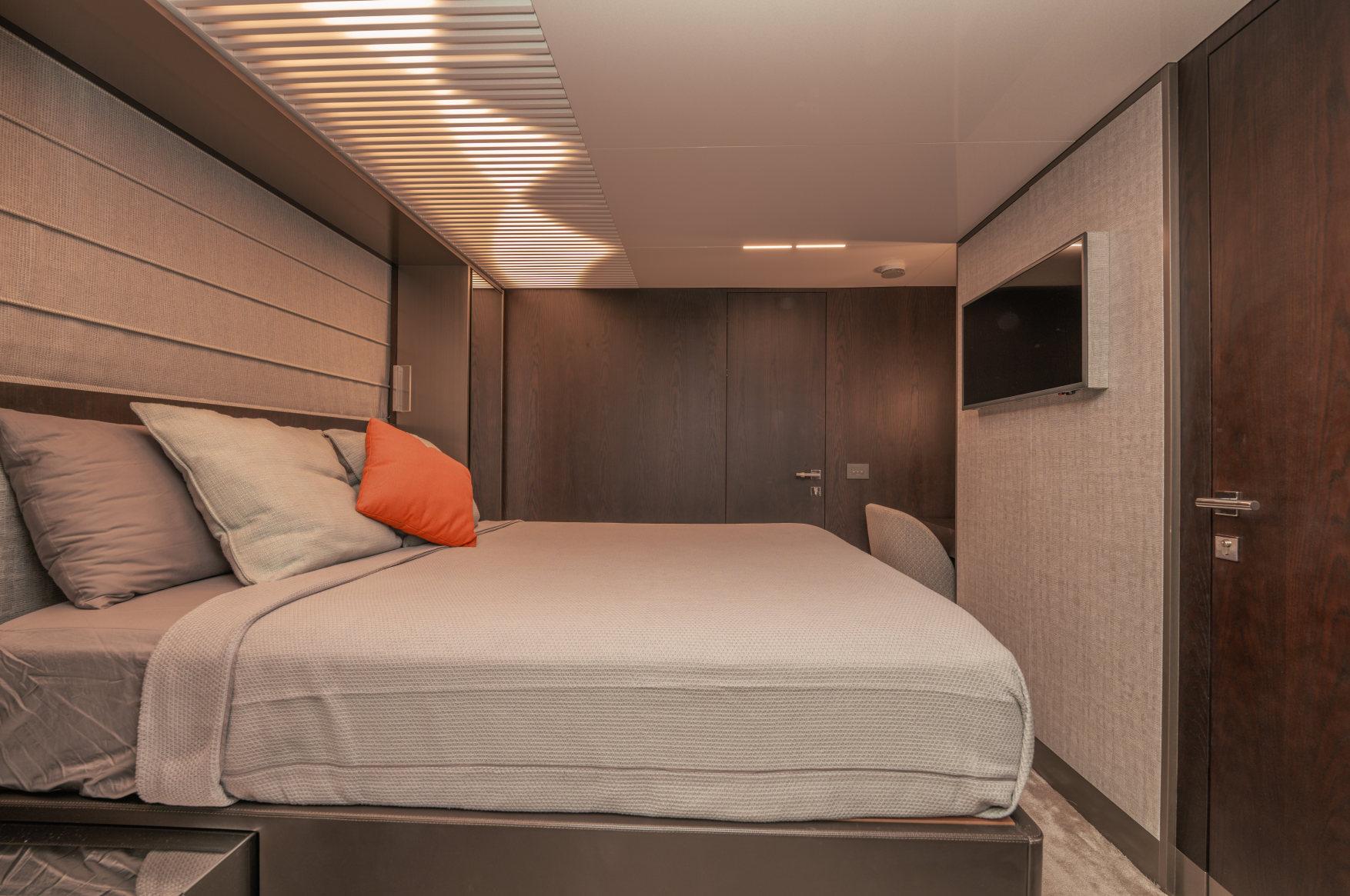 - Каюты: 4 гостевые каюты с собственными санузлами с душем, в том числе полноразмерная мастер-каюта, и 2 каюты для экипажа из 3х человек с одним санузлом с душем.