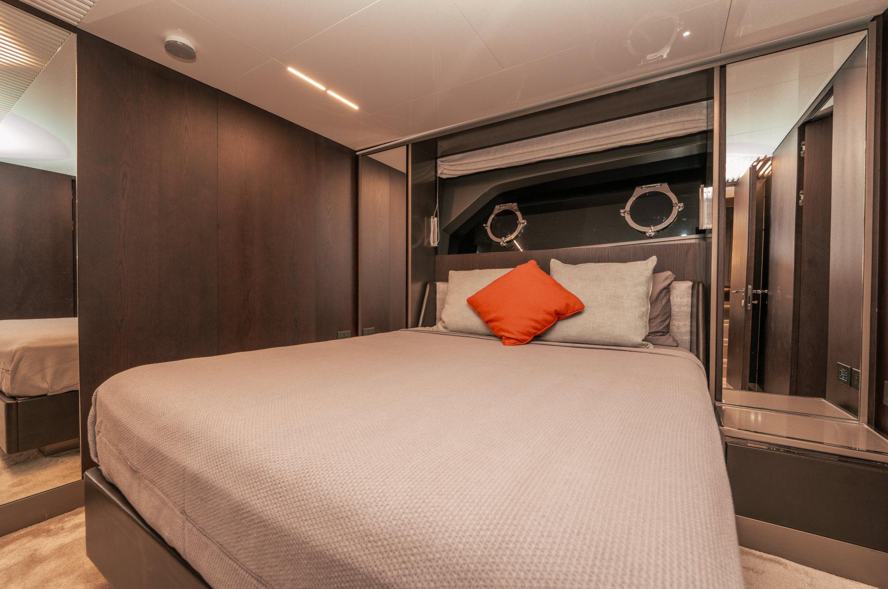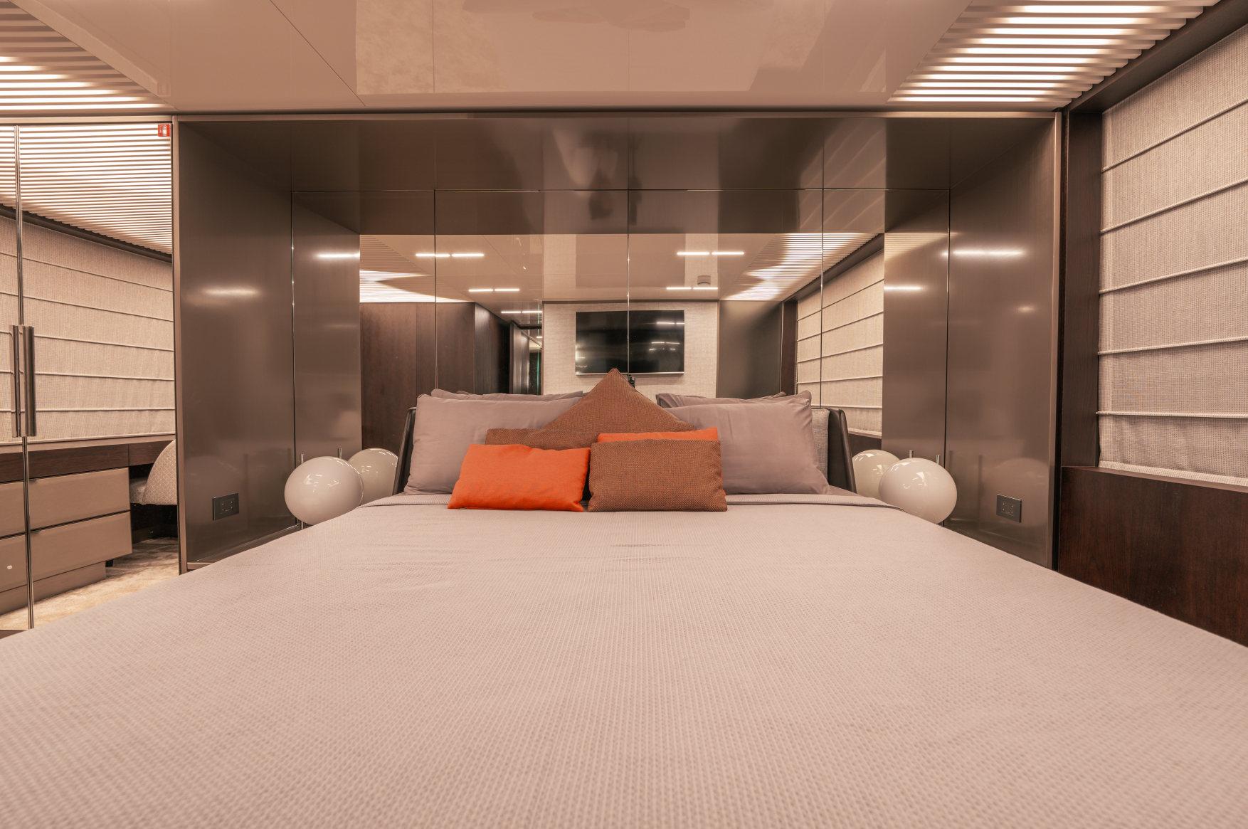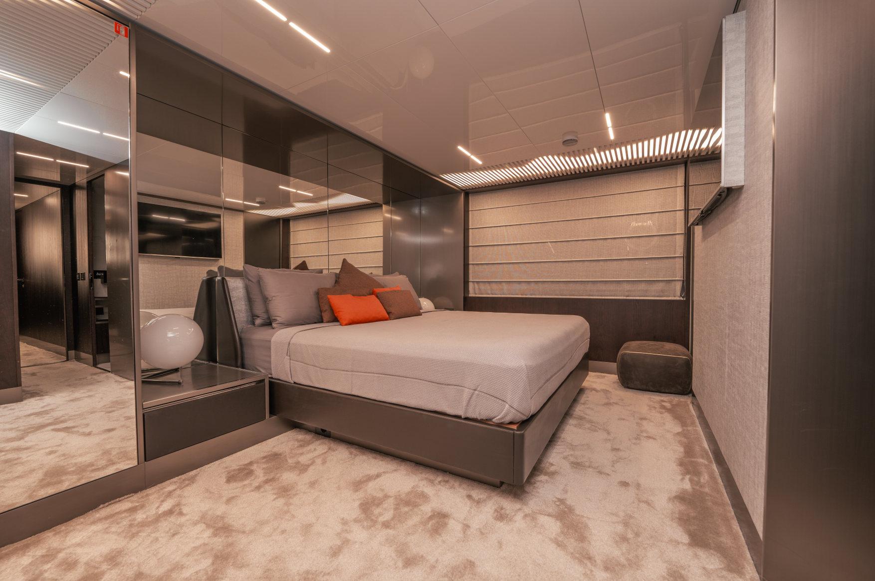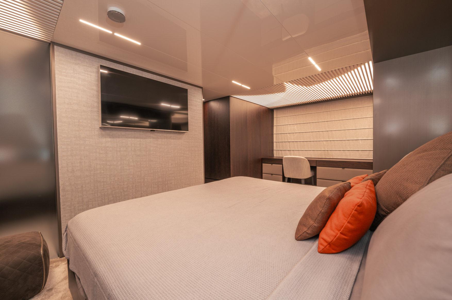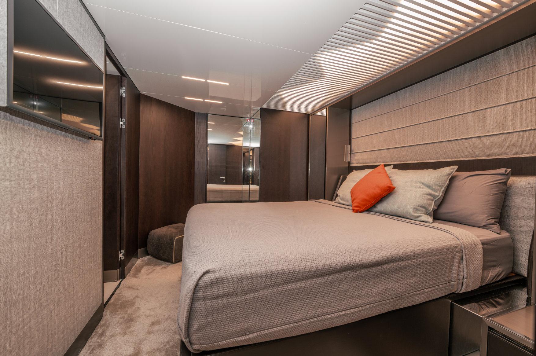 - Каюты: 4 гостевые каюты с собственными санузлами с душем, в том числе полноразмерная мастер-каюта, и 2 каюты для экипажа из 3х человек с одним санузлом с душем.