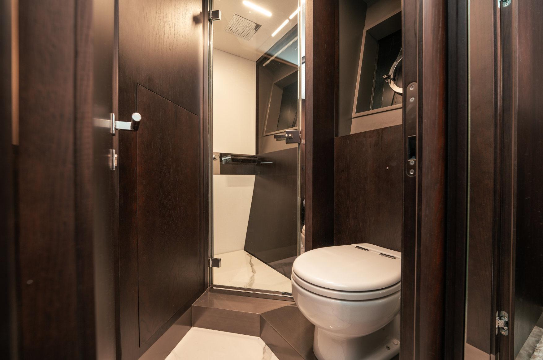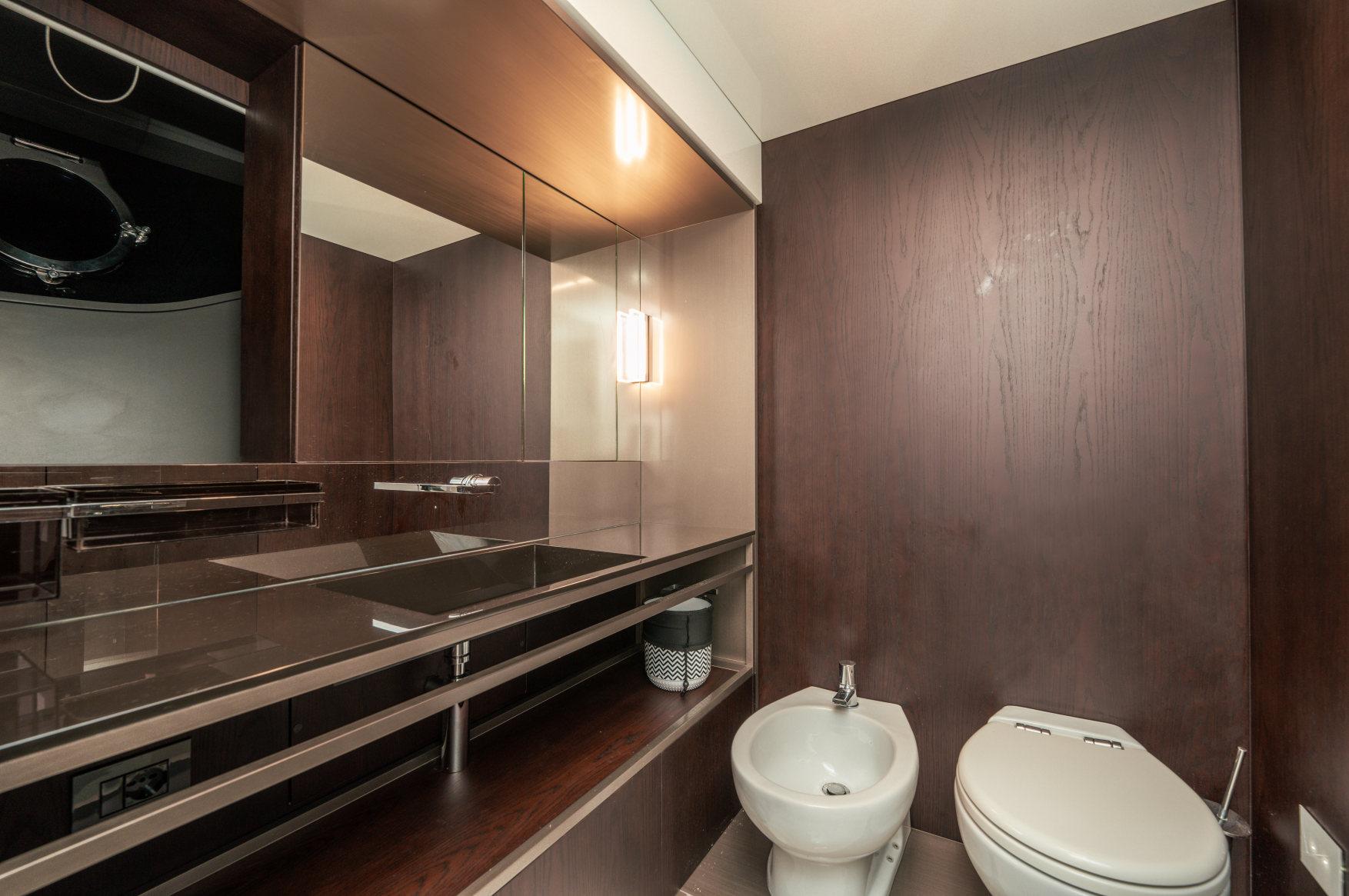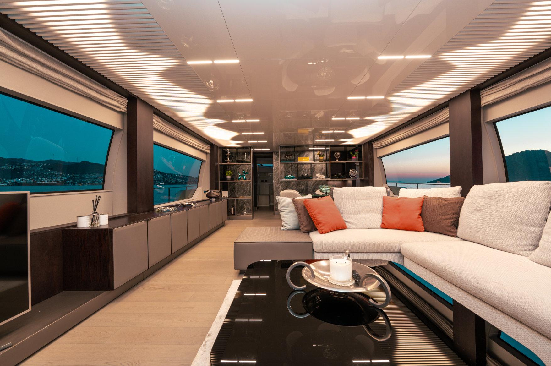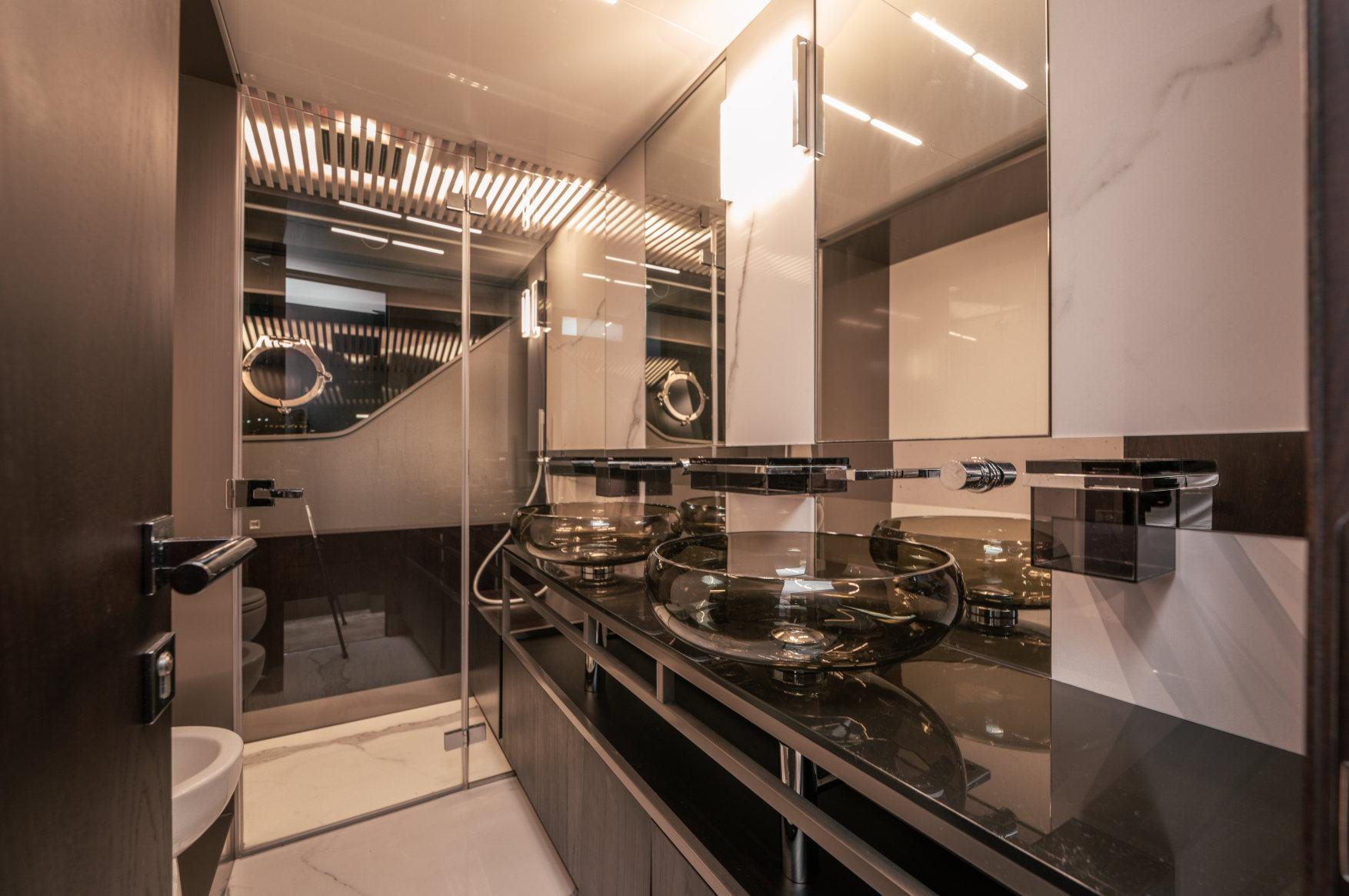 - Каюты: 4 гостевые каюты с собственными санузлами с душем, в том числе полноразмерная мастер-каюта, и 2 каюты для экипажа из 3х человек с одним санузлом с душем.