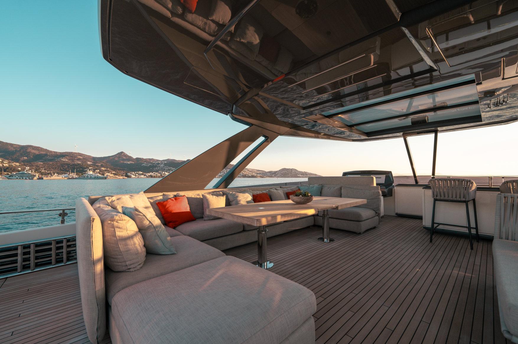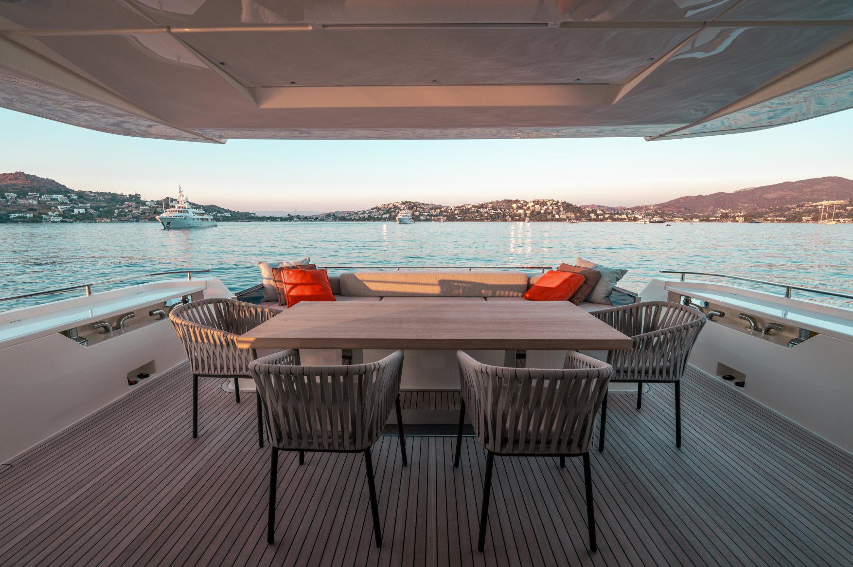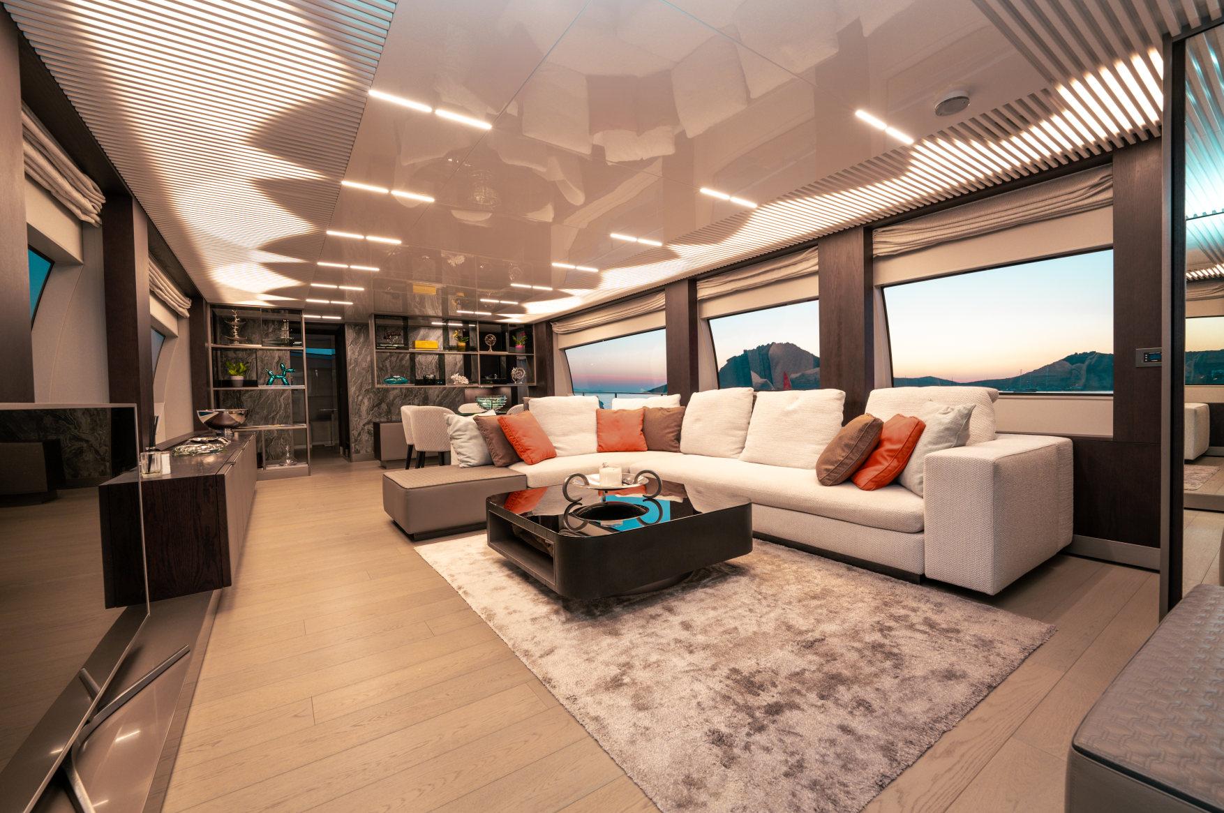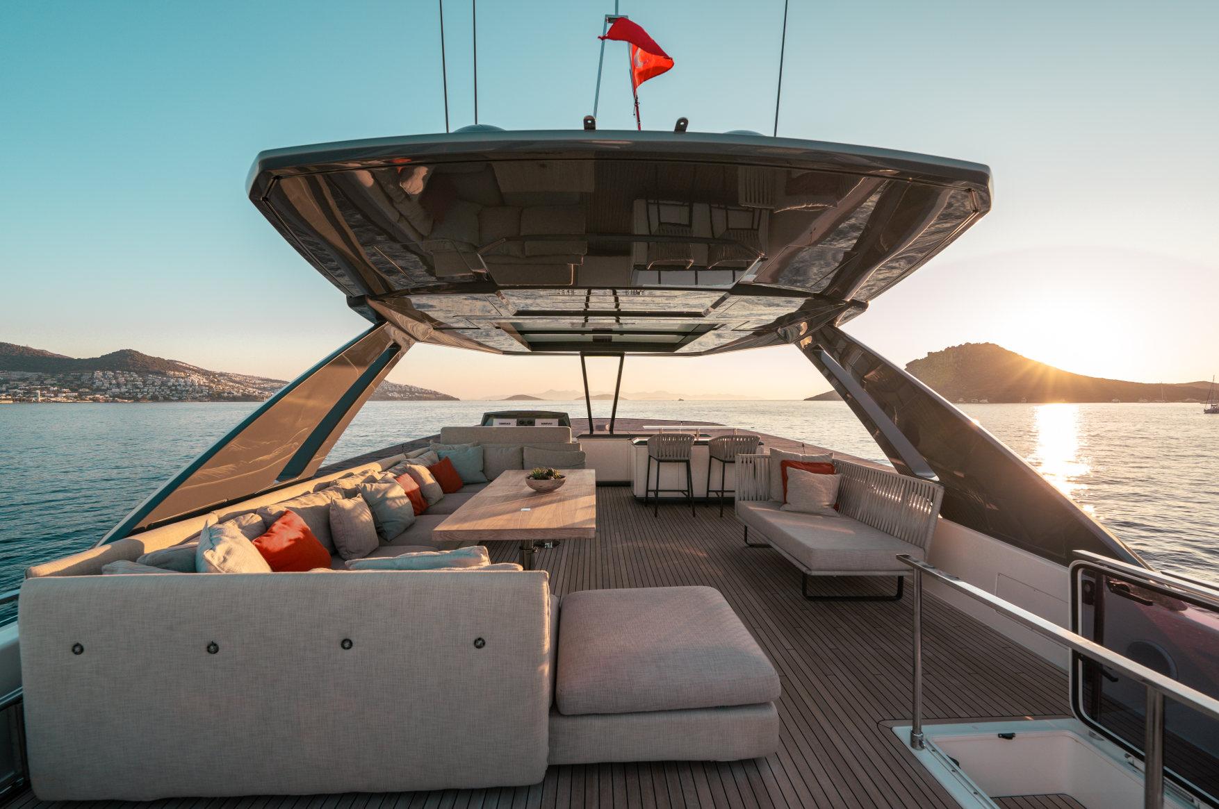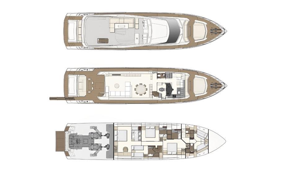 Роскошь, мощь и стиль сочетаются в этой модели с динамичными, плавными линиями, приковывающими взгляд. Эксклюзивность правит волнами. Энергичная и соблазнительная яхта Ferretti 850 покорит ваше сердце с первого взгляда своим угловатым стилем и яркими линиями, излучающими величие и стиль. Два встроенных окна со встроенными иллюминаторами имеют обтекаемую форму, а их огромные размеры наполняют интерьер естественным светом и великолепными видами. Главная палуба усиливает динамичность общего дизайна: единое застекленное пространство охватывает всю надстройку и дополняет продольный жесткий верх над приподнятым постом управления. Дверь гаража открывается с помощью специального механизма, демонстрируя пляжную зону, которая опускается под воду как большая подводная платформа для отдыха гостей (и удобный способ для экипажа управления тендером). Крытые стены, окна от пола до потолка, волнистые шторы и множество отдельно стоящей мебели — вот ключи к концепции, которая является ультрасовременной, но теплой — и все это в непревзойденном стиле Ferretti Yachts.