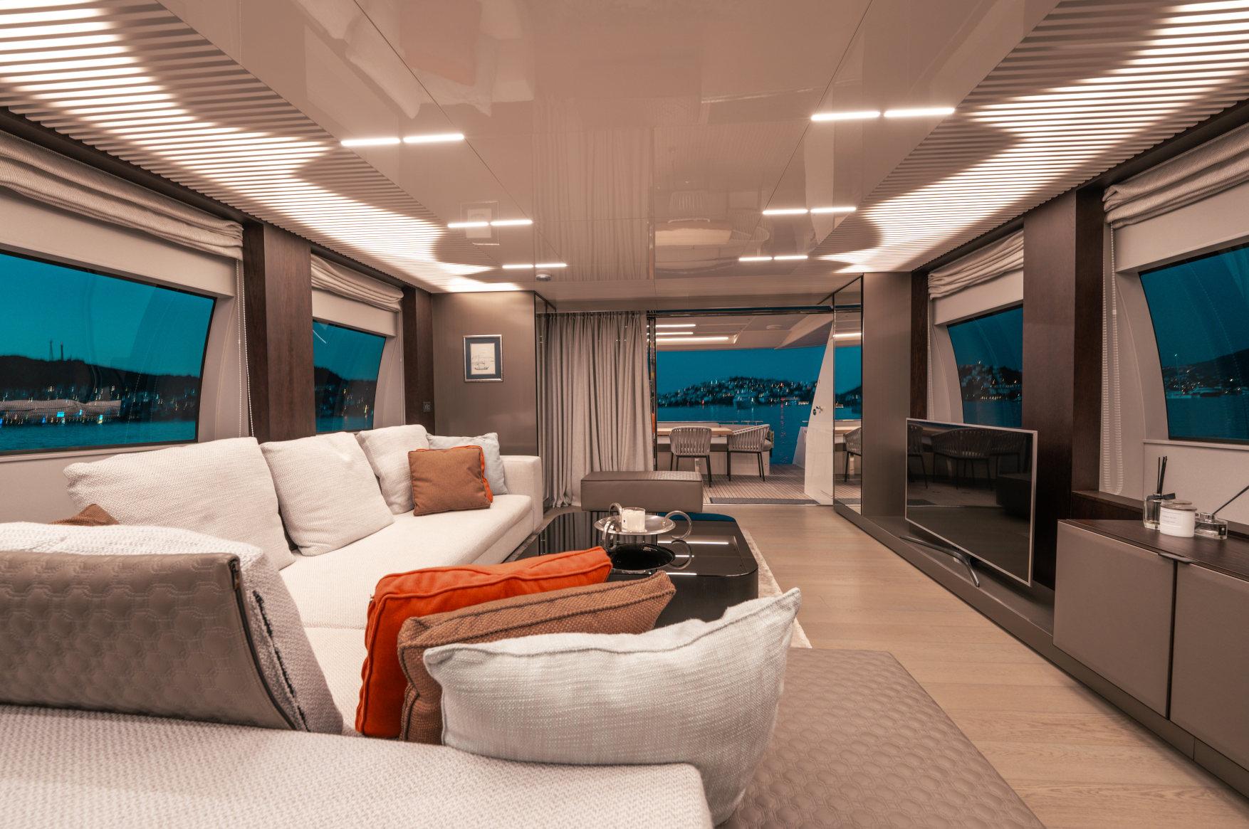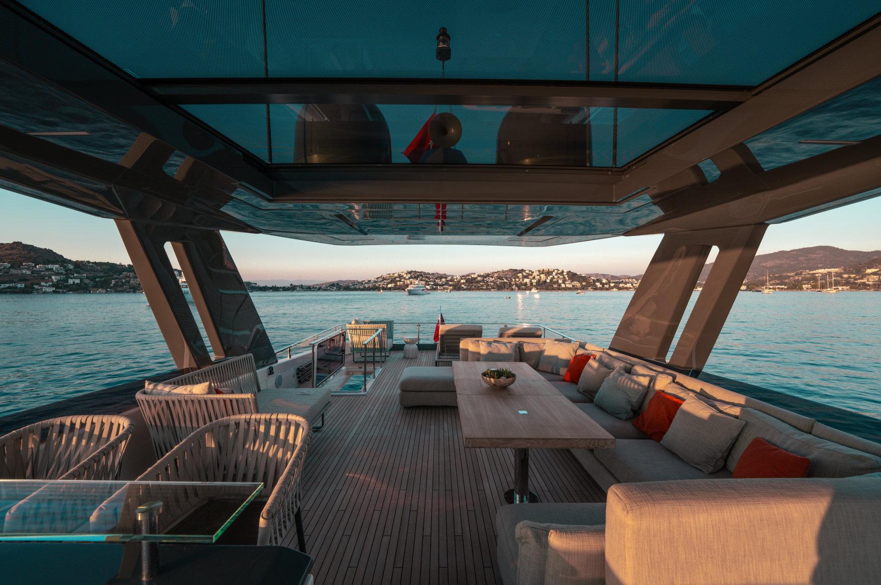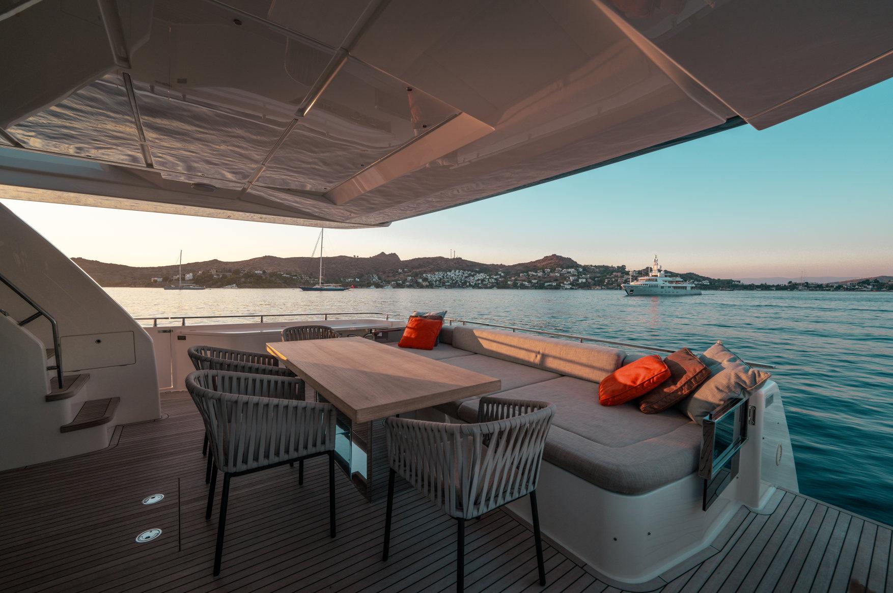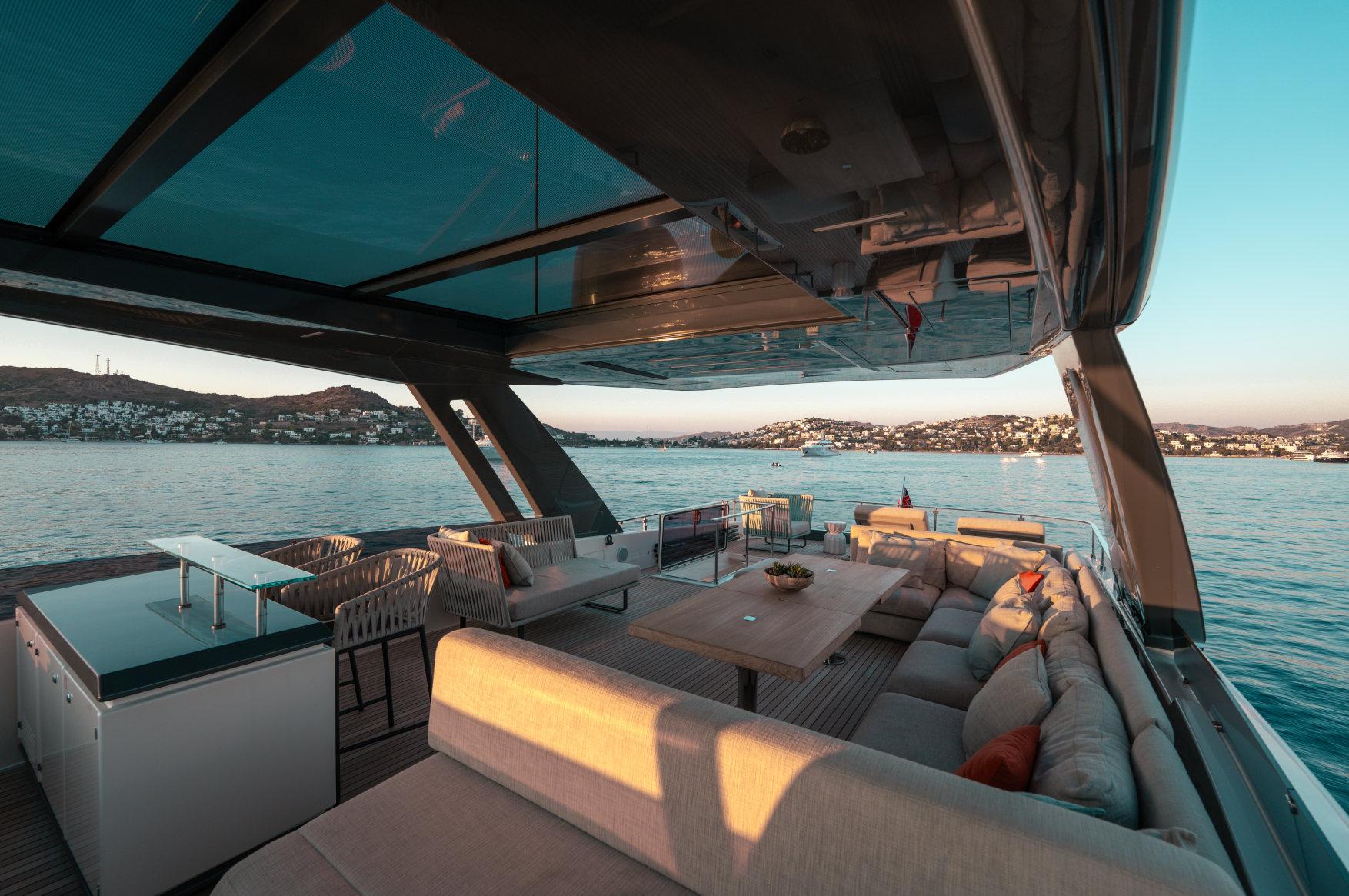 Роскошь, мощь и стиль сочетаются в этой модели с динамичными, плавными линиями, приковывающими взгляд. Эксклюзивность правит волнами. Энергичная и соблазнительная яхта Ferretti 850 покорит ваше сердце с первого взгляда своим угловатым стилем и яркими линиями, излучающими величие и стиль. Два встроенных окна со встроенными иллюминаторами имеют обтекаемую форму, а их огромные размеры наполняют интерьер естественным светом и великолепными видами. Главная палуба усиливает динамичность общего дизайна: единое застекленное пространство охватывает всю надстройку и дополняет продольный жесткий верх над приподнятым постом управления. Дверь гаража открывается с помощью специального механизма, демонстрируя пляжную зону, которая опускается под воду как большая подводная платформа для отдыха гостей (и удобный способ для экипажа управления тендером). Крытые стены, окна от пола до потолка, волнистые шторы и множество отдельно стоящей мебели — вот ключи к концепции, которая является ультрасовременной, но теплой — и все это в непревзойденном стиле Ferretti Yachts.