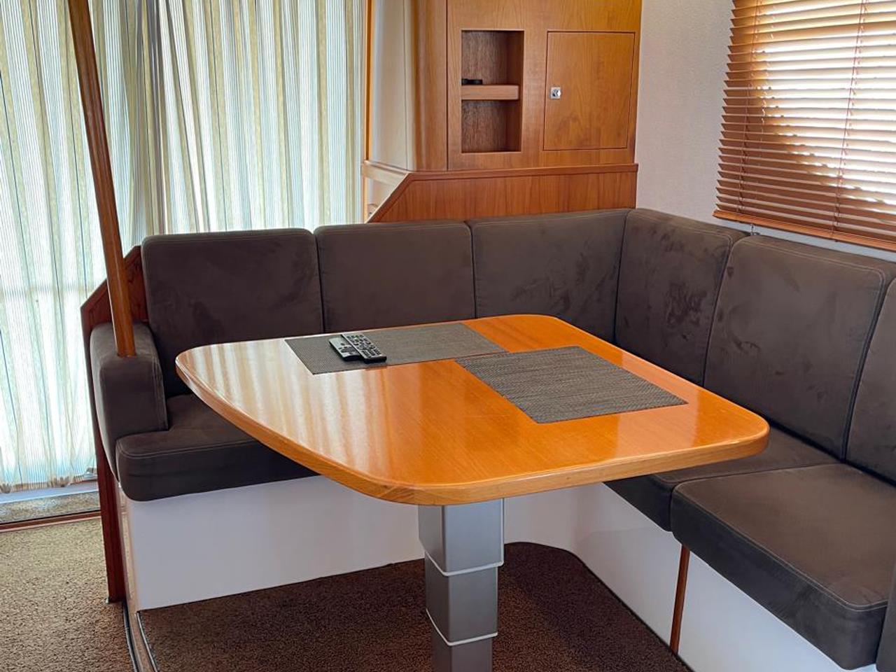 Пост управления экипирован более чем солидно: штурманский стол; снабженное массой регулировок кресло рулевого; удобная подножка; хорошо читаемая приборная панель. При этом часть приборов для комфорта вынесена в нишу над лобовым стеклом. Обзор отсюда открывается отличный, а обратный наклон лобового стекла (как у всех траулеров) улучшает видимость, даже когда вас заливает волной или дождем.