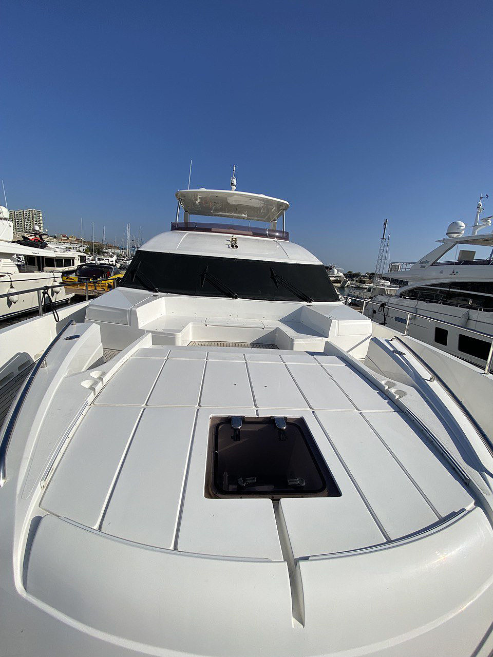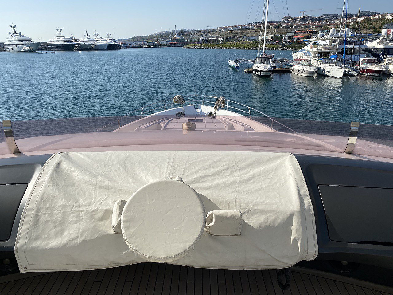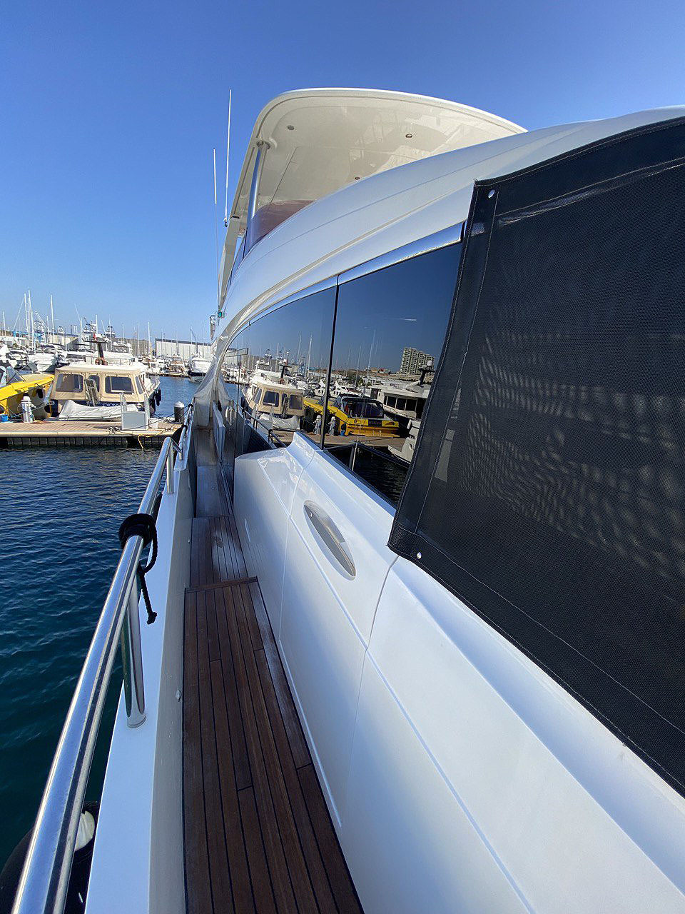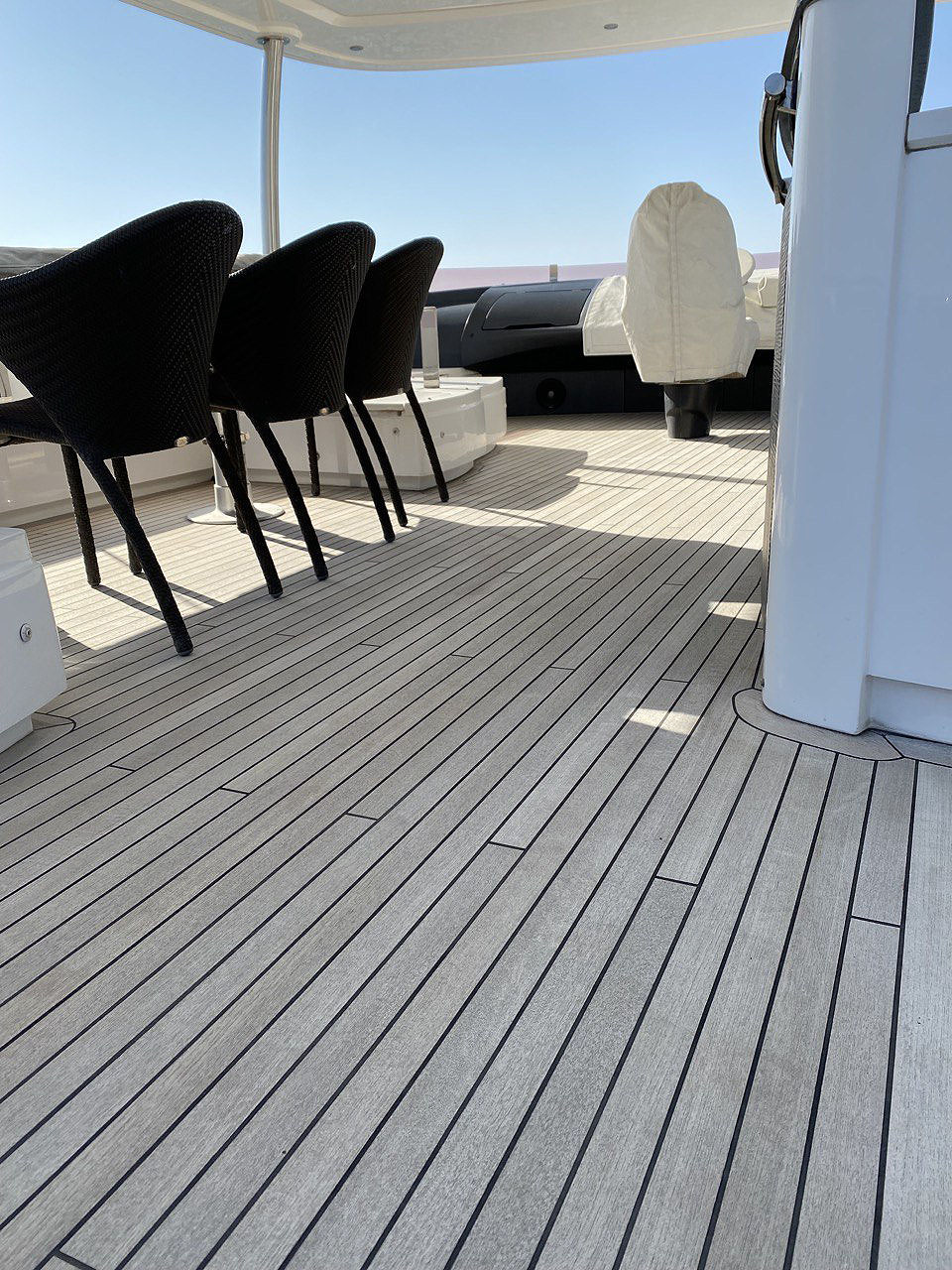 - Обшитые тиком купальная платформа, палуба кокпита, флайбридж, ступени, ведущие на бортовые части палубы и трап на флайбридж, а также проход на бак