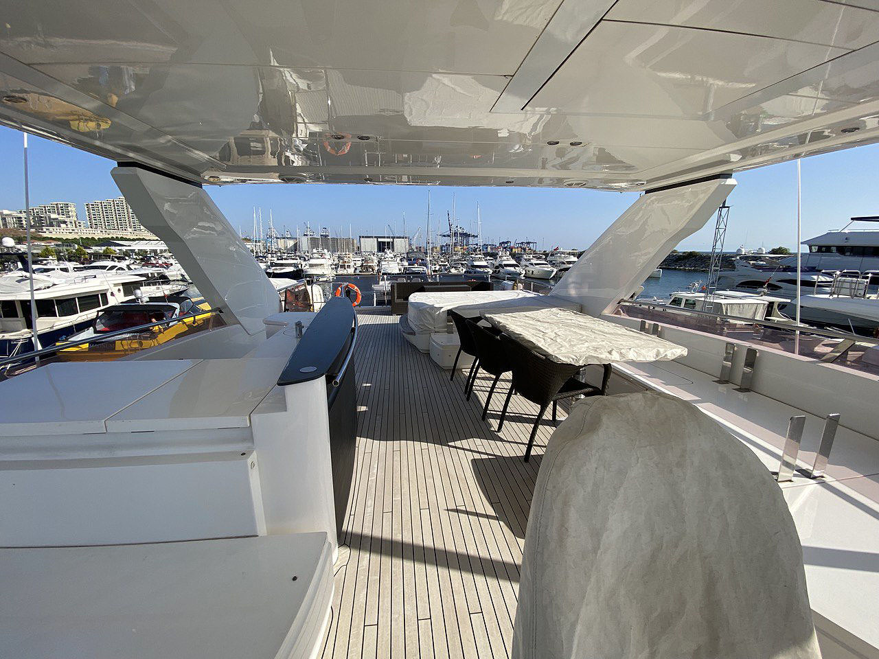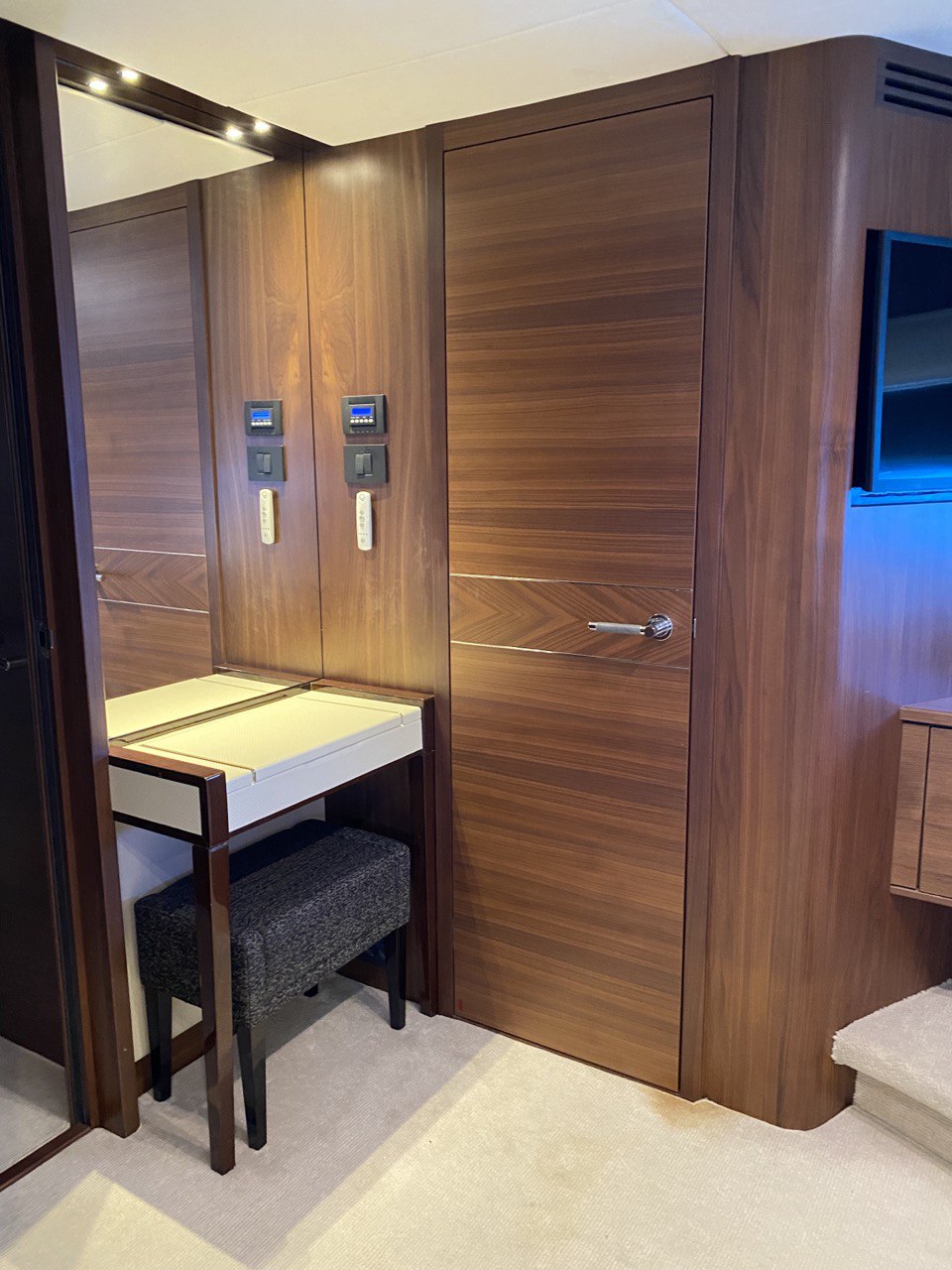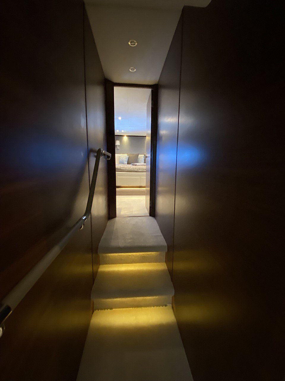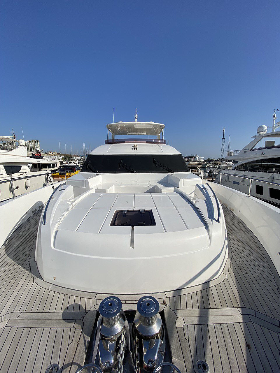 - Обшитые тиком купальная платформа, палуба кокпита, флайбридж, ступени, ведущие на бортовые части палубы и трап на флайбридж, а также проход на бак