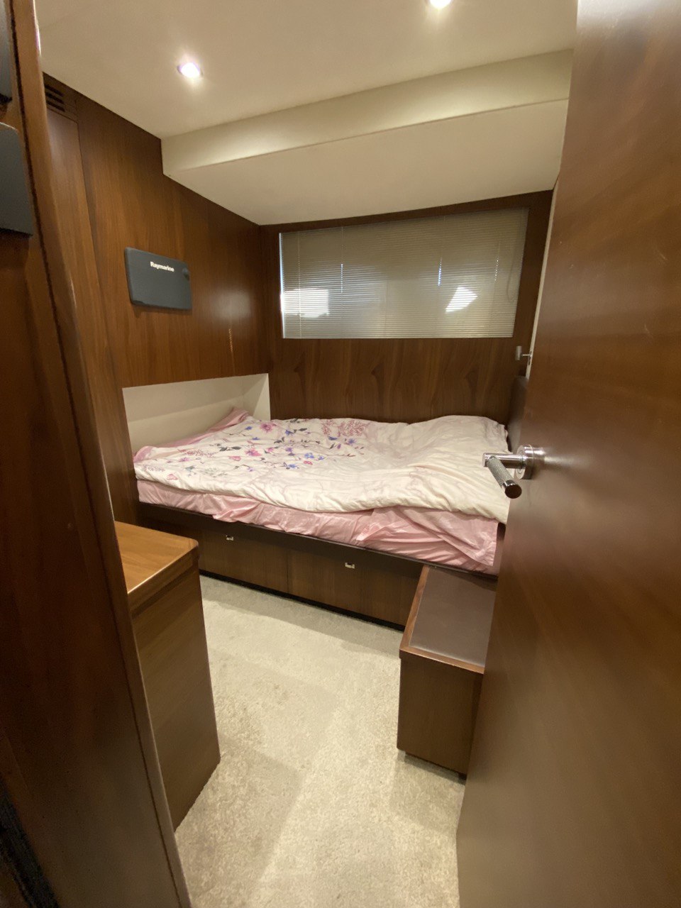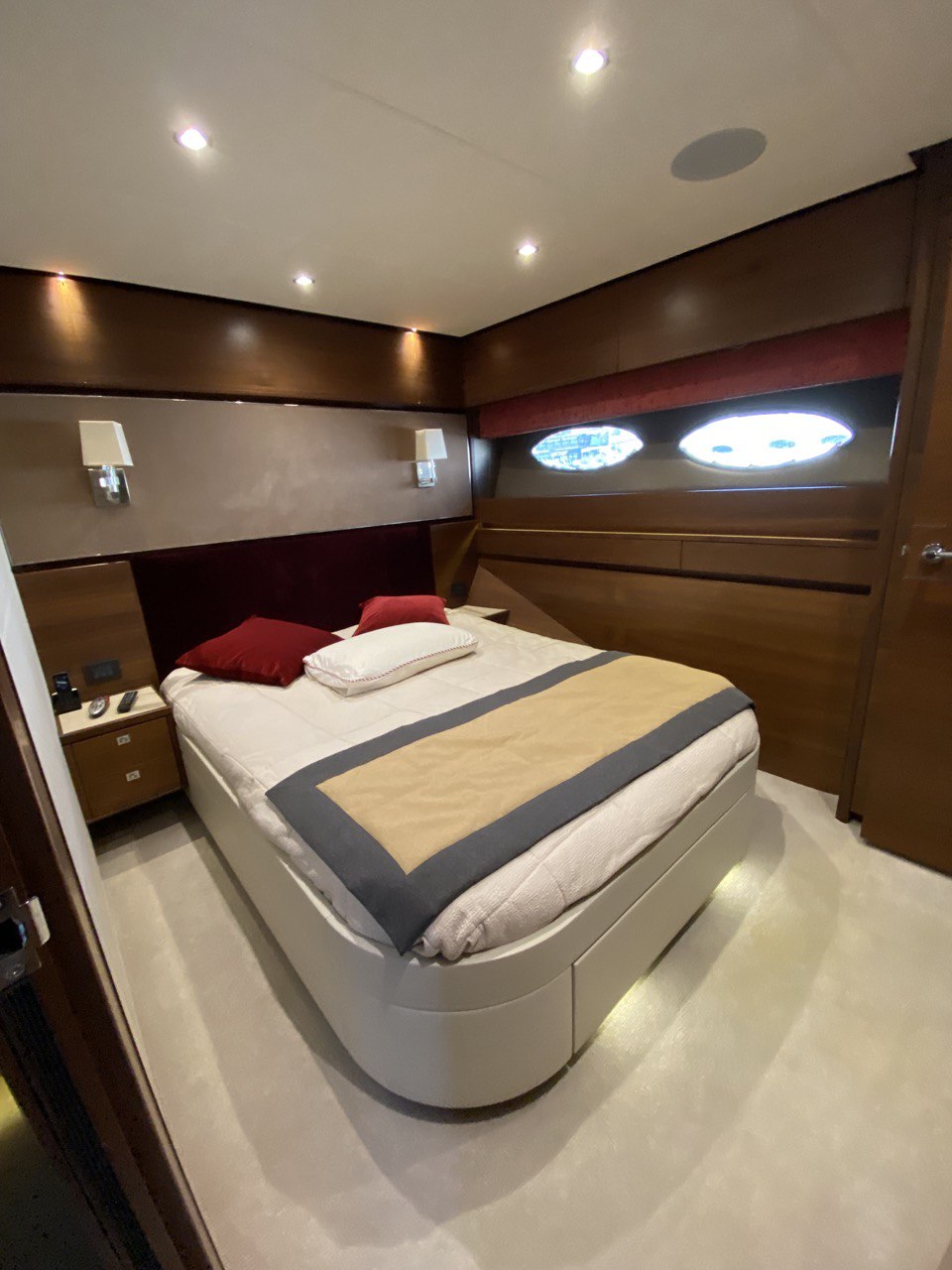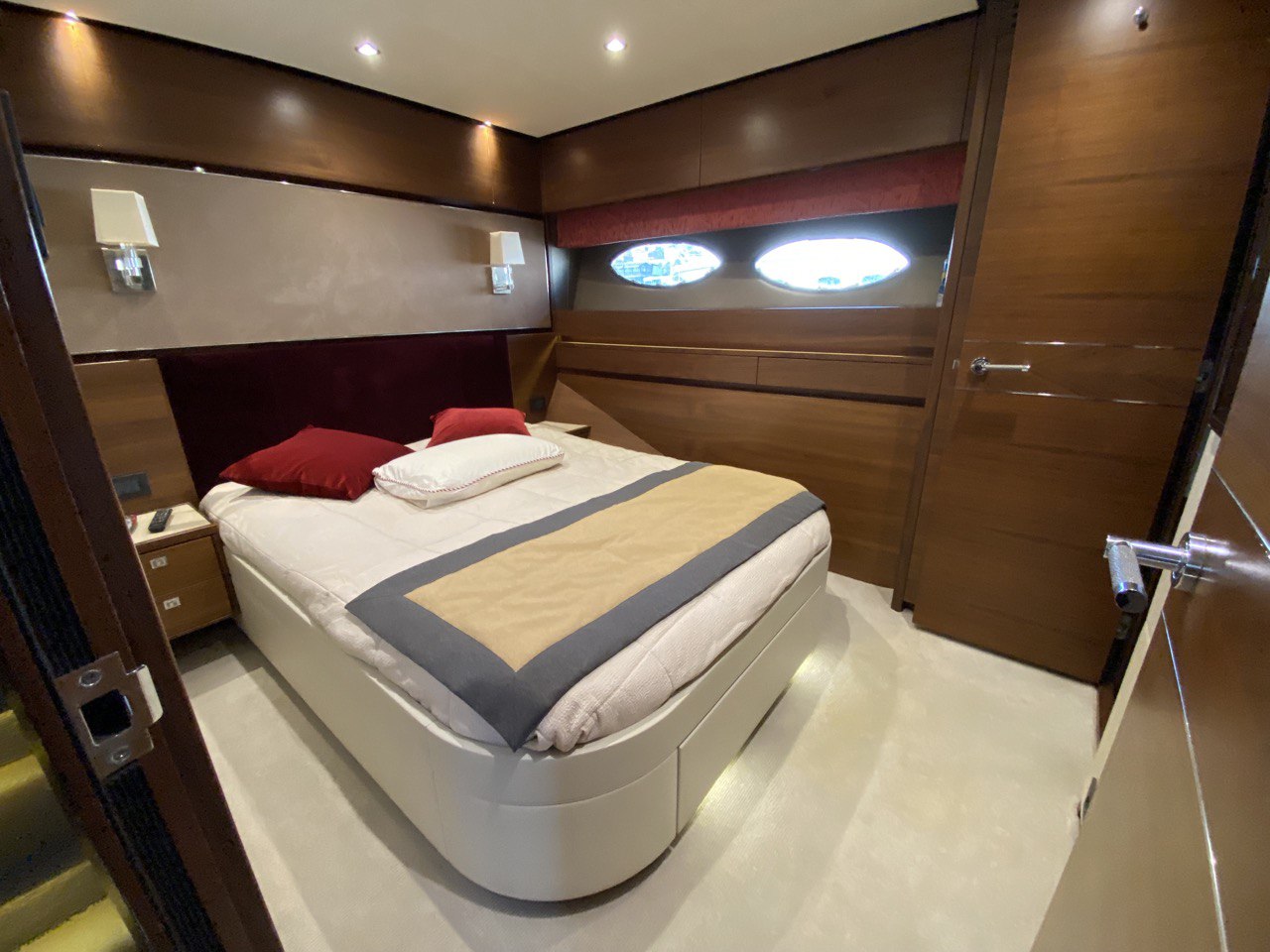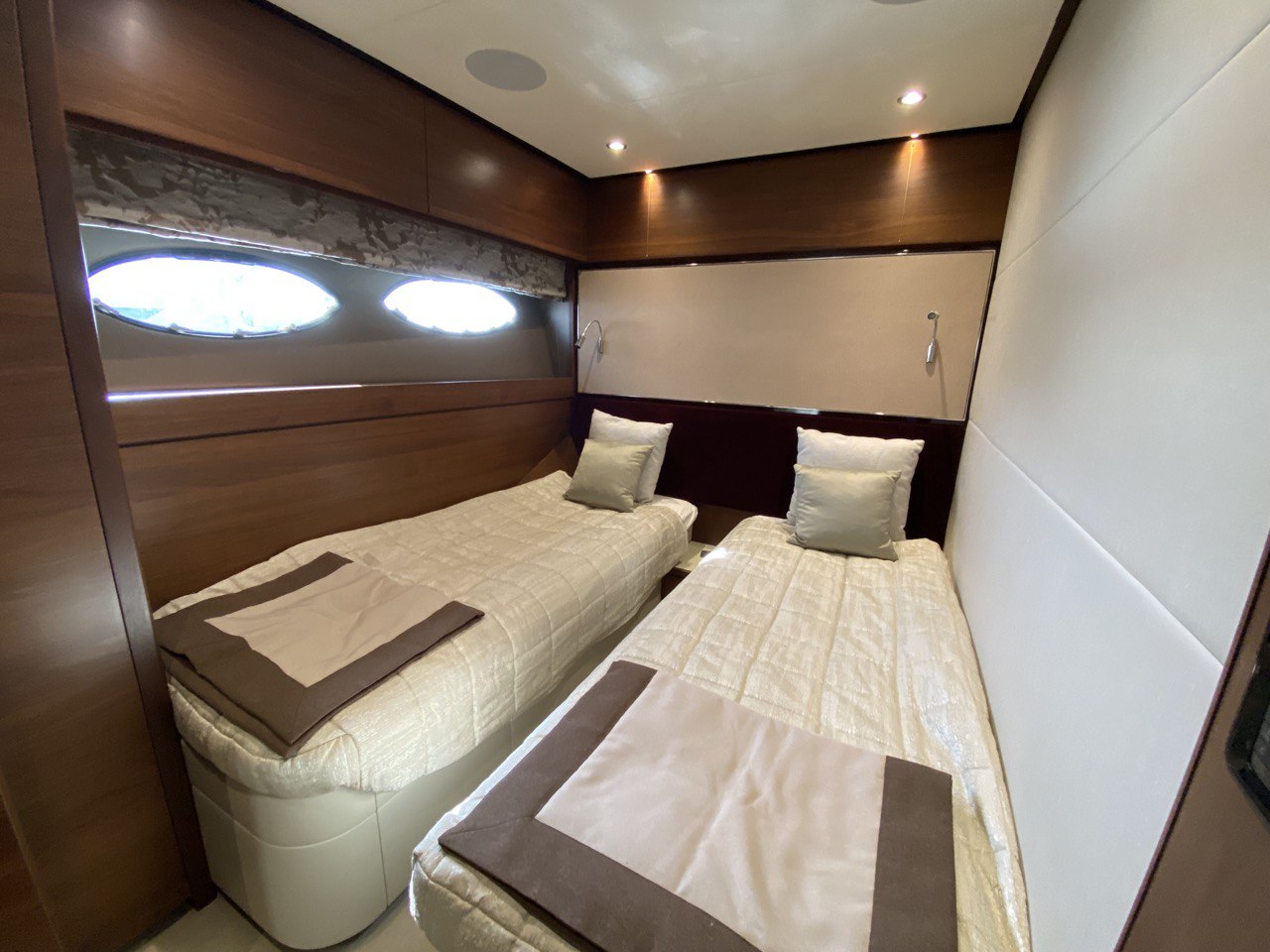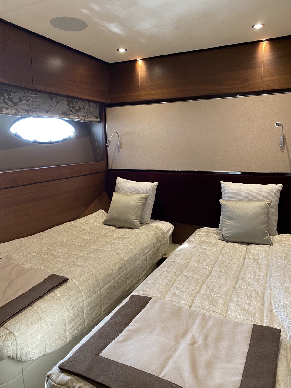 Просторный флайбридж и элегантный салон позволят отправиться в длительное путешествие большой компанией. В хорошую погоду гости смогут насладиться обедом под открытым небом на флайбридже, воспользоваться водными игрушками или позагорать на фордеке. В салоне на главное палубе установлено все для приятного времяпровождения во время морских круизов, включая просторную зону отдыха с П-образным диваном и хорошо оборудованный камбуз. На нижней палубе расположены четыре комфортабельные каюты.