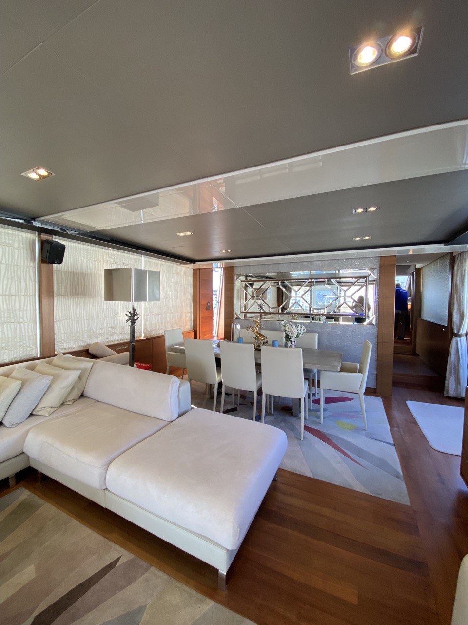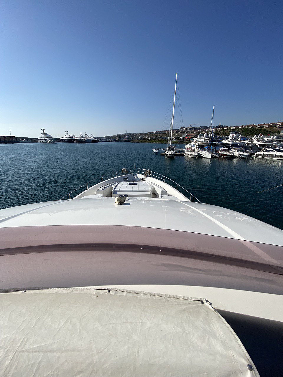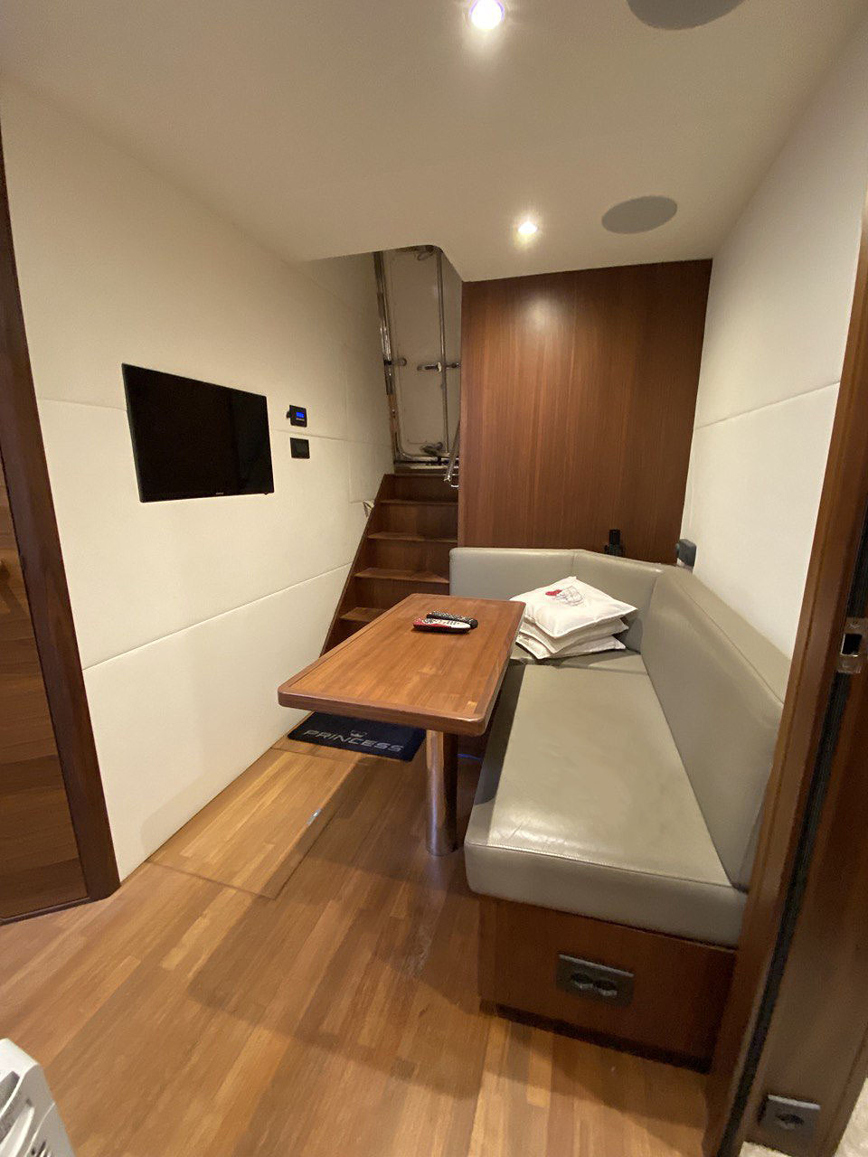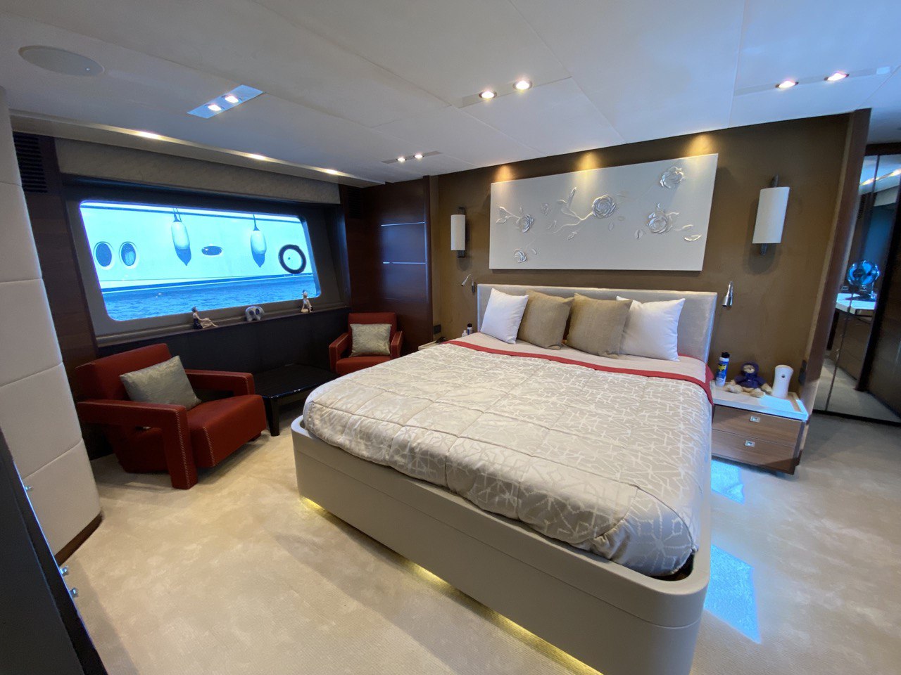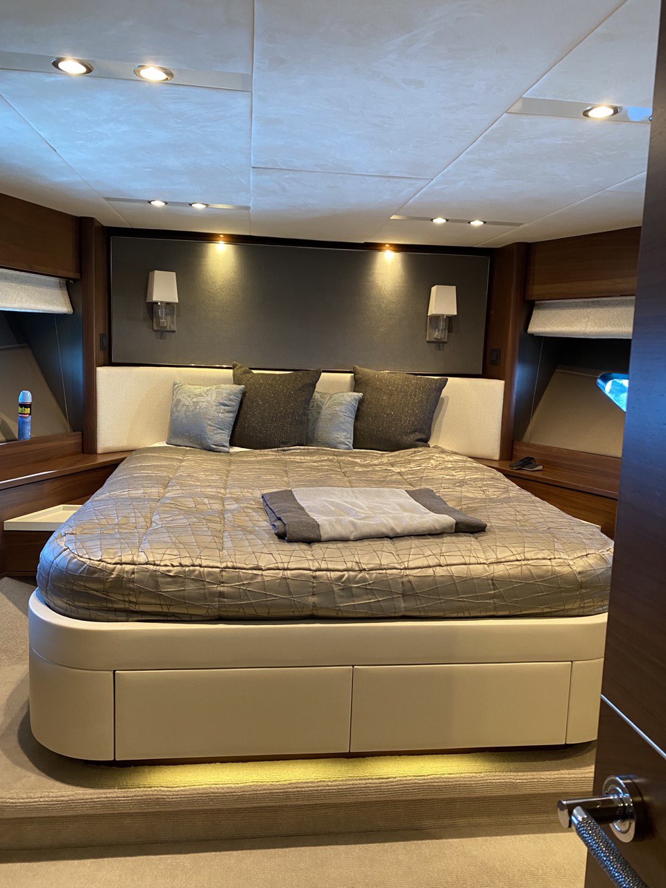 Просторный флайбридж и элегантный салон позволят отправиться в длительное путешествие большой компанией. В хорошую погоду гости смогут насладиться обедом под открытым небом на флайбридже, воспользоваться водными игрушками или позагорать на фордеке. В салоне на главное палубе установлено все для приятного времяпровождения во время морских круизов, включая просторную зону отдыха с П-образным диваном и хорошо оборудованный камбуз. На нижней палубе расположены четыре комфортабельные каюты.