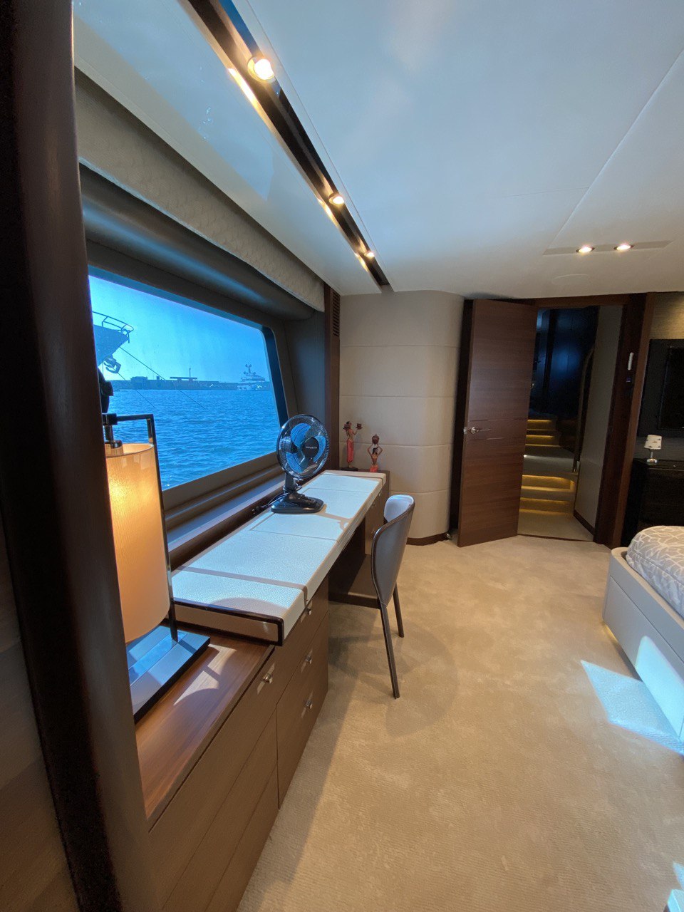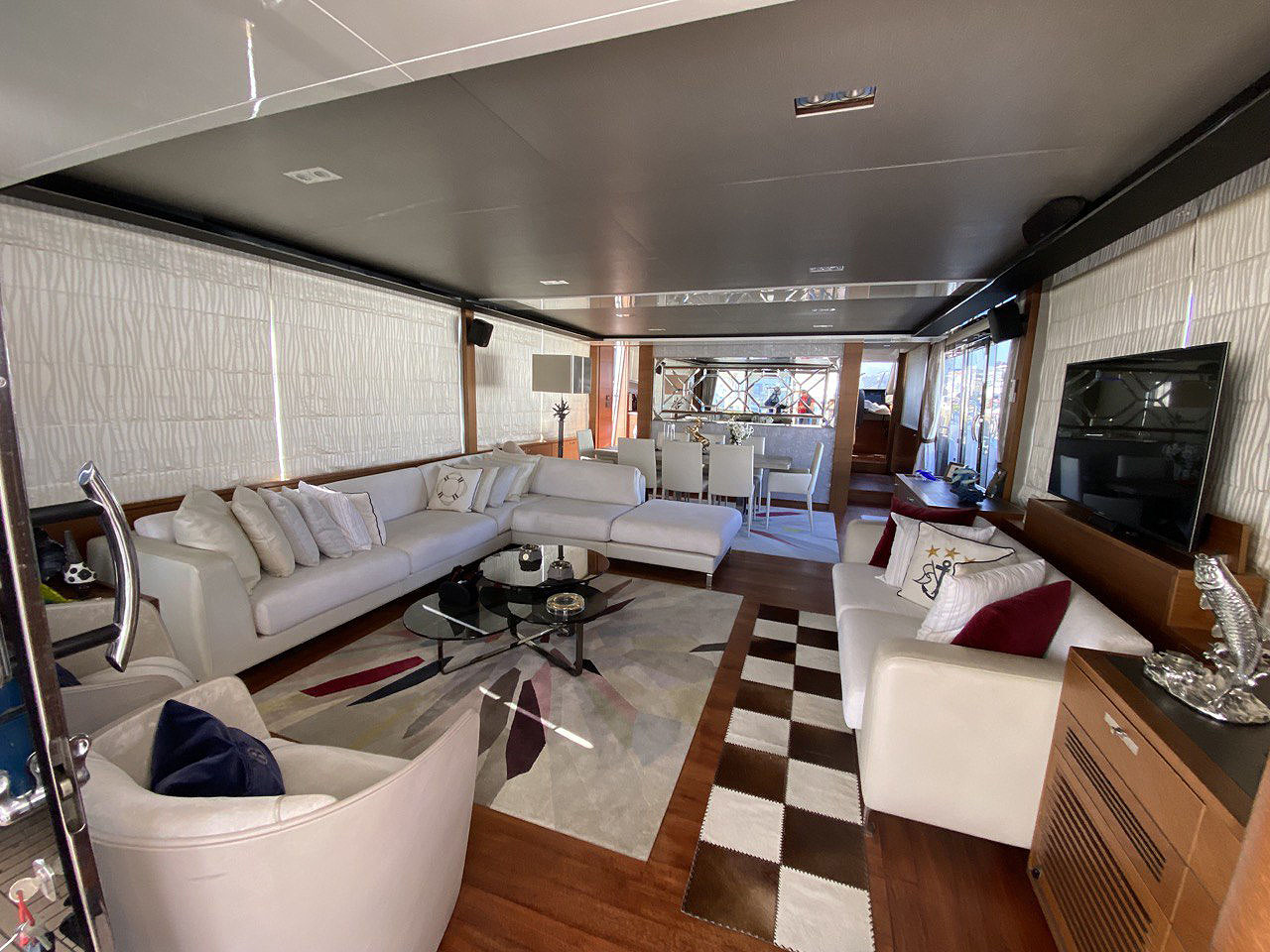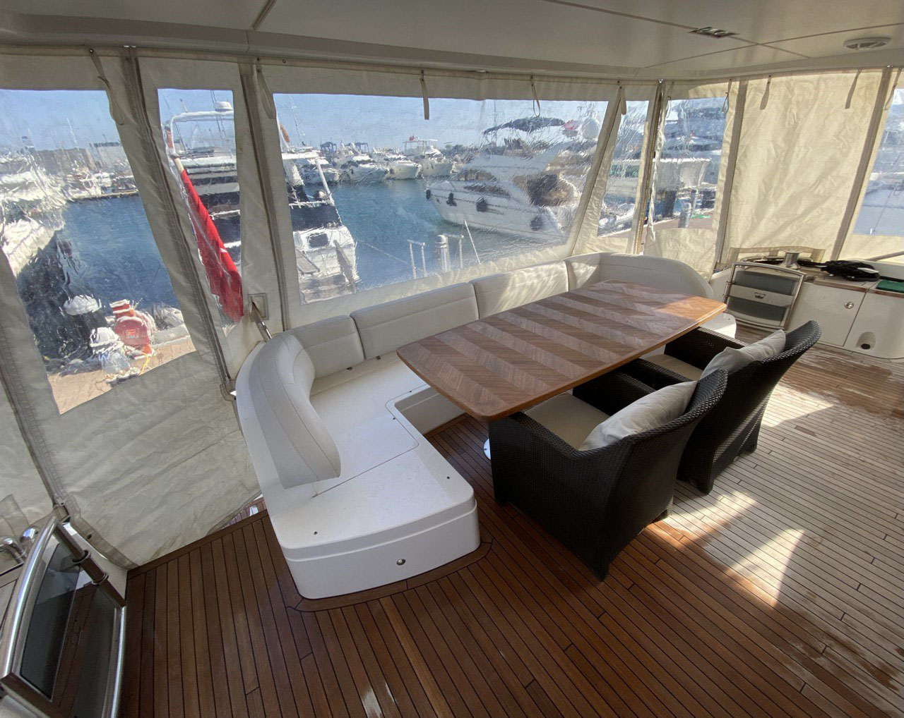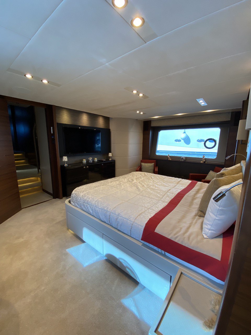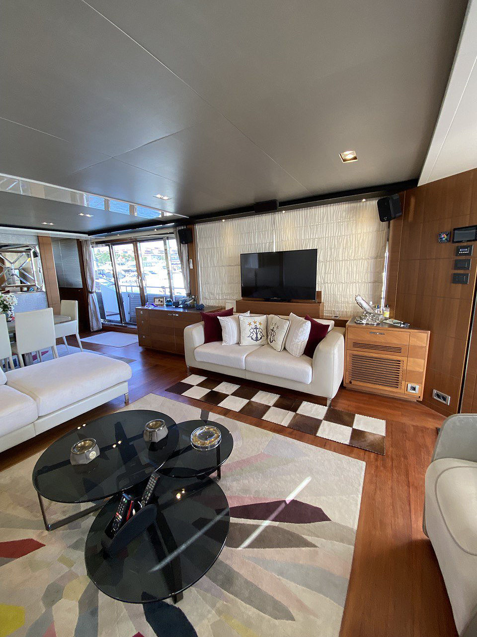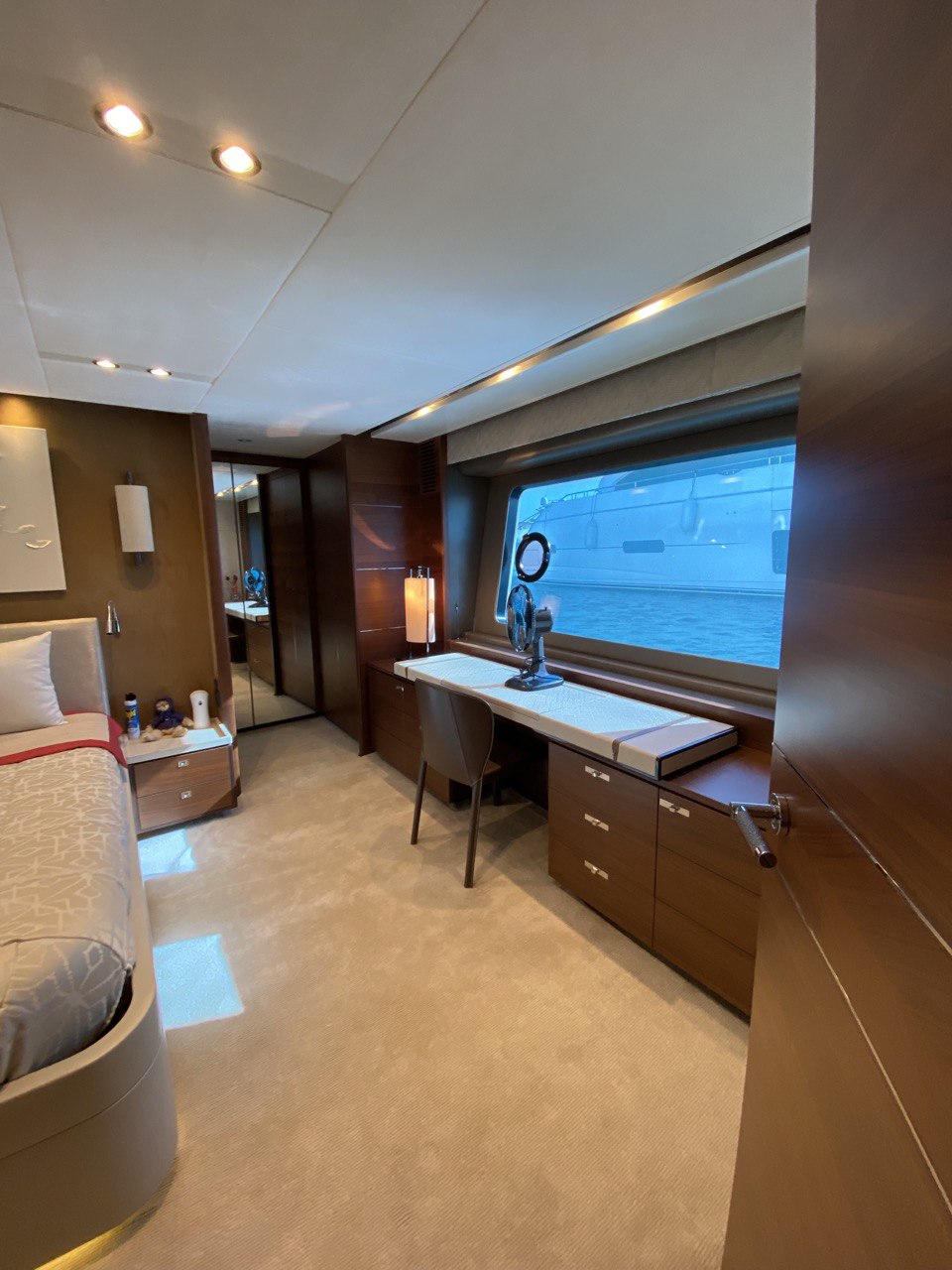 Просторный флайбридж и элегантный салон позволят отправиться в длительное путешествие большой компанией. В хорошую погоду гости смогут насладиться обедом под открытым небом на флайбридже, воспользоваться водными игрушками или позагорать на фордеке. В салоне на главное палубе установлено все для приятного времяпровождения во время морских круизов, включая просторную зону отдыха с П-образным диваном и хорошо оборудованный камбуз. На нижней палубе расположены четыре комфортабельные каюты.