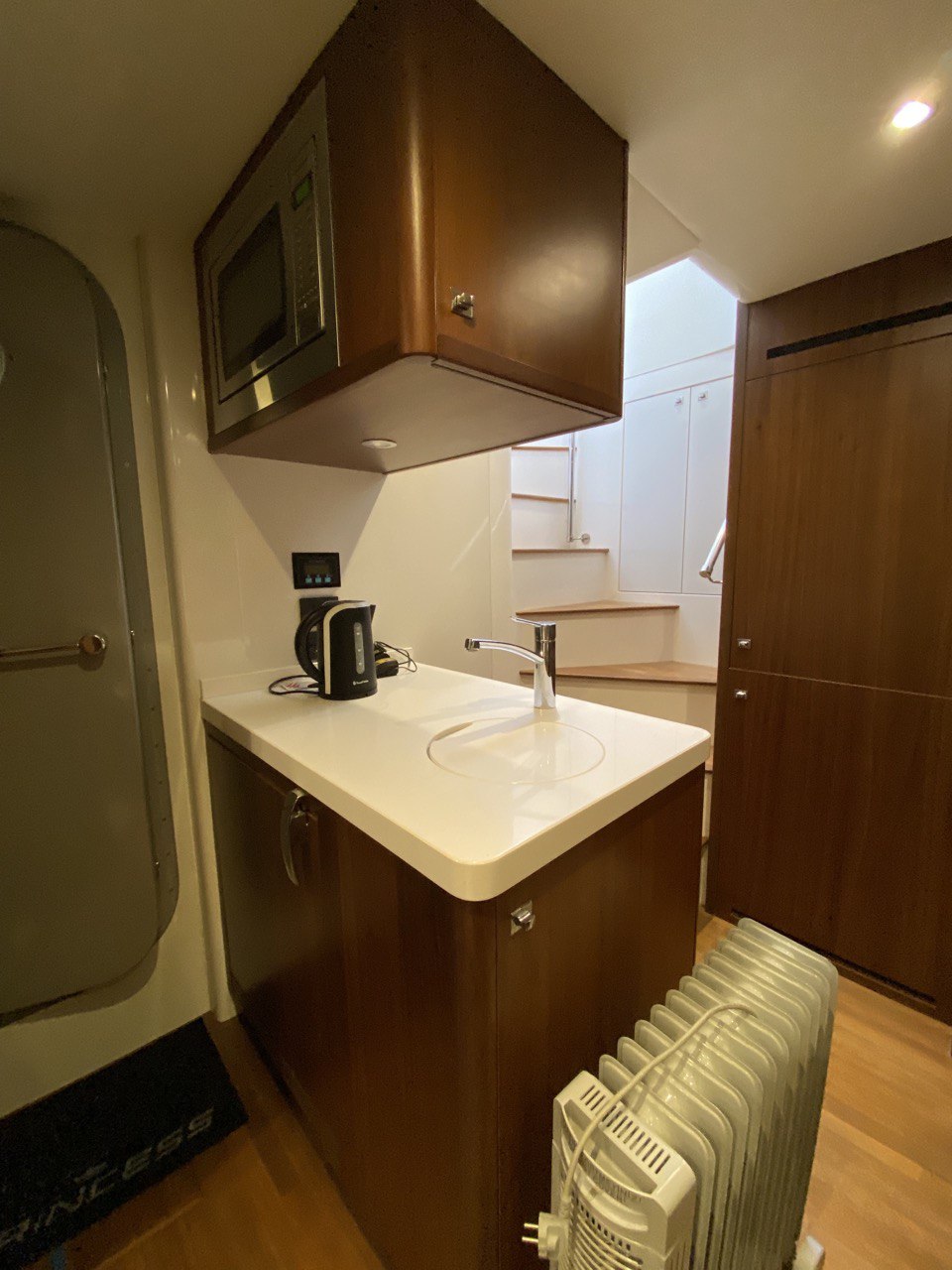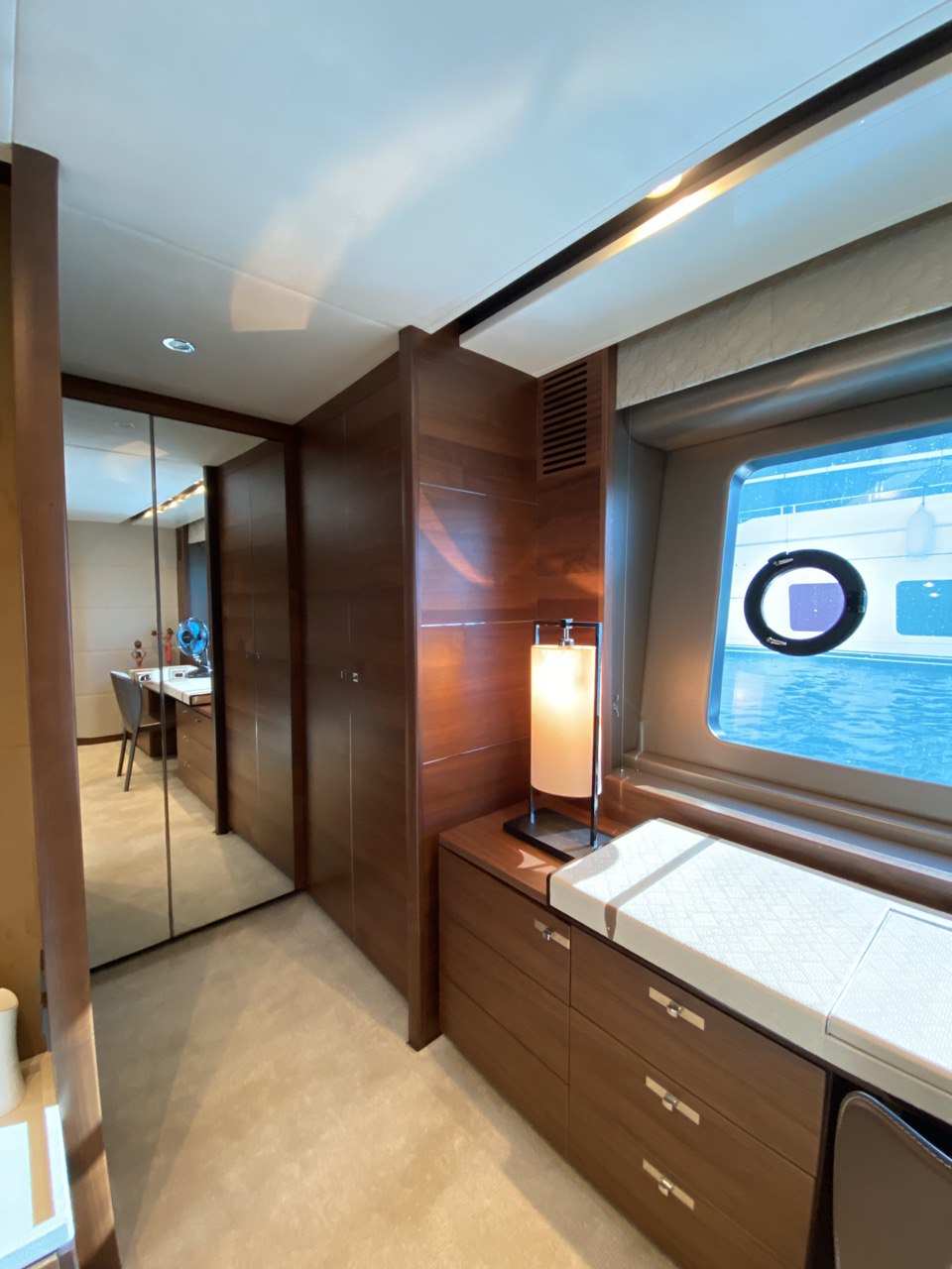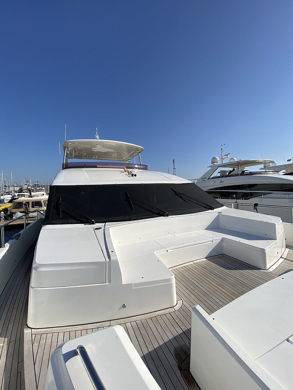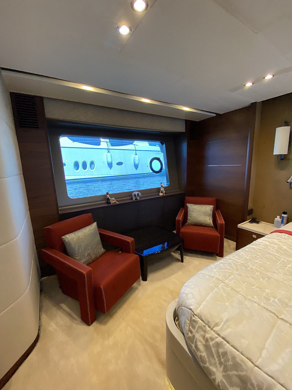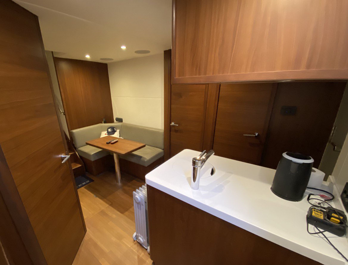 Просторный флайбридж и элегантный салон позволят отправиться в длительное путешествие большой компанией. В хорошую погоду гости смогут насладиться обедом под открытым небом на флайбридже, воспользоваться водными игрушками или позагорать на фордеке. В салоне на главное палубе установлено все для приятного времяпровождения во время морских круизов, включая просторную зону отдыха с П-образным диваном и хорошо оборудованный камбуз. На нижней палубе расположены четыре комфортабельные каюты.