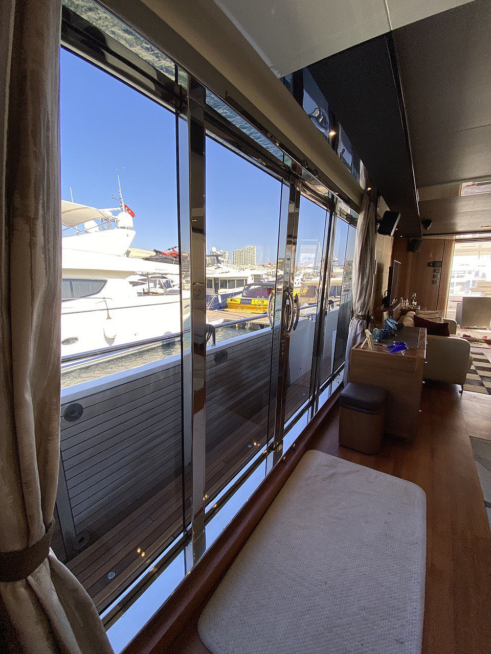 Одна из изюминок дизайна - балкон, который выдвигается из салона всего одним нажатием на кнопку. Большие панорамные окна позволяют любоваться морем из всех помещений на верхней палубе.