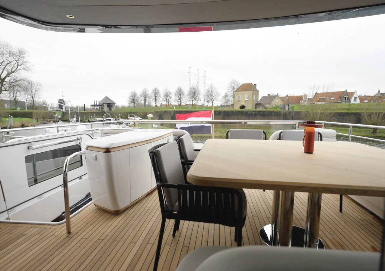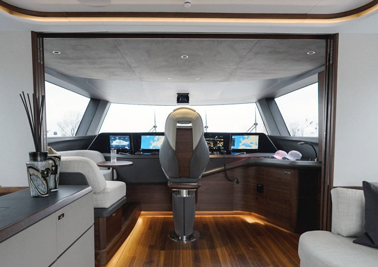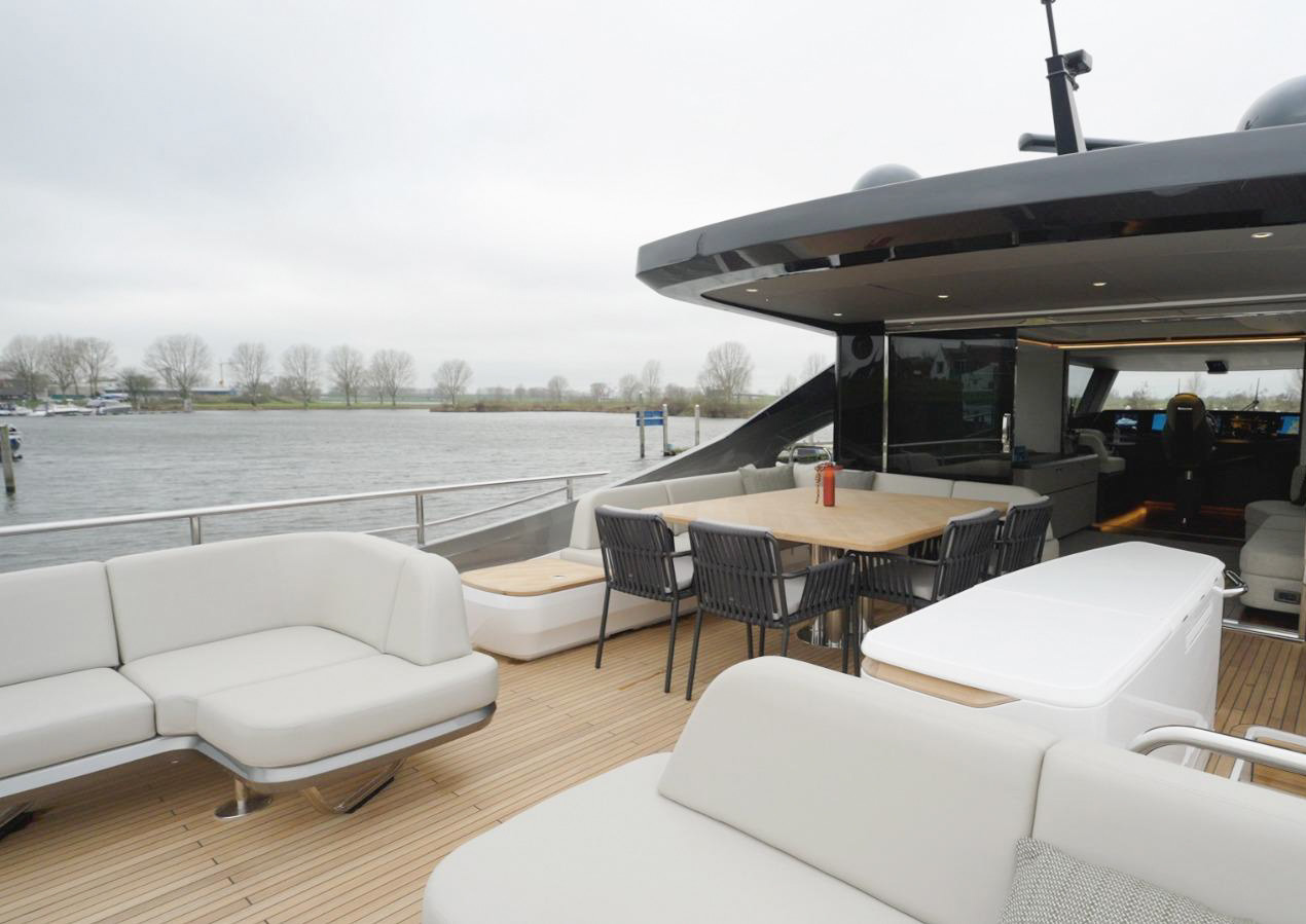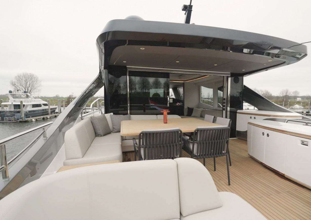 Скай-лаунж во всю ширину корпуса плавно переходит в расширенную палубу «Superfly», а апартаменты владельца на главной палубе с собственной террасой в носовой части создают атмосферу пентхауса в море, обычно встречающуюся на гораздо больших яхтах.