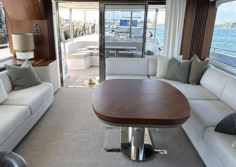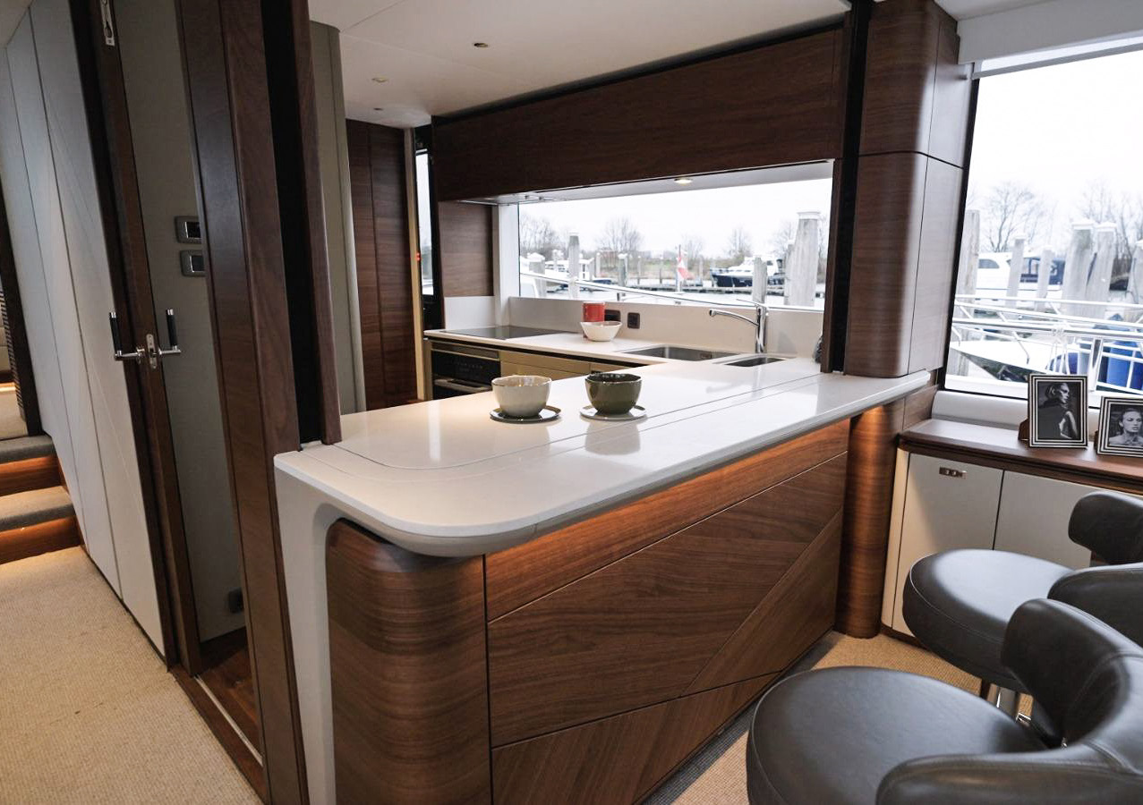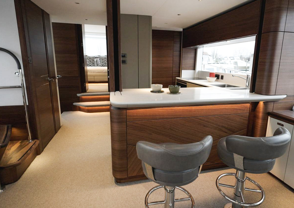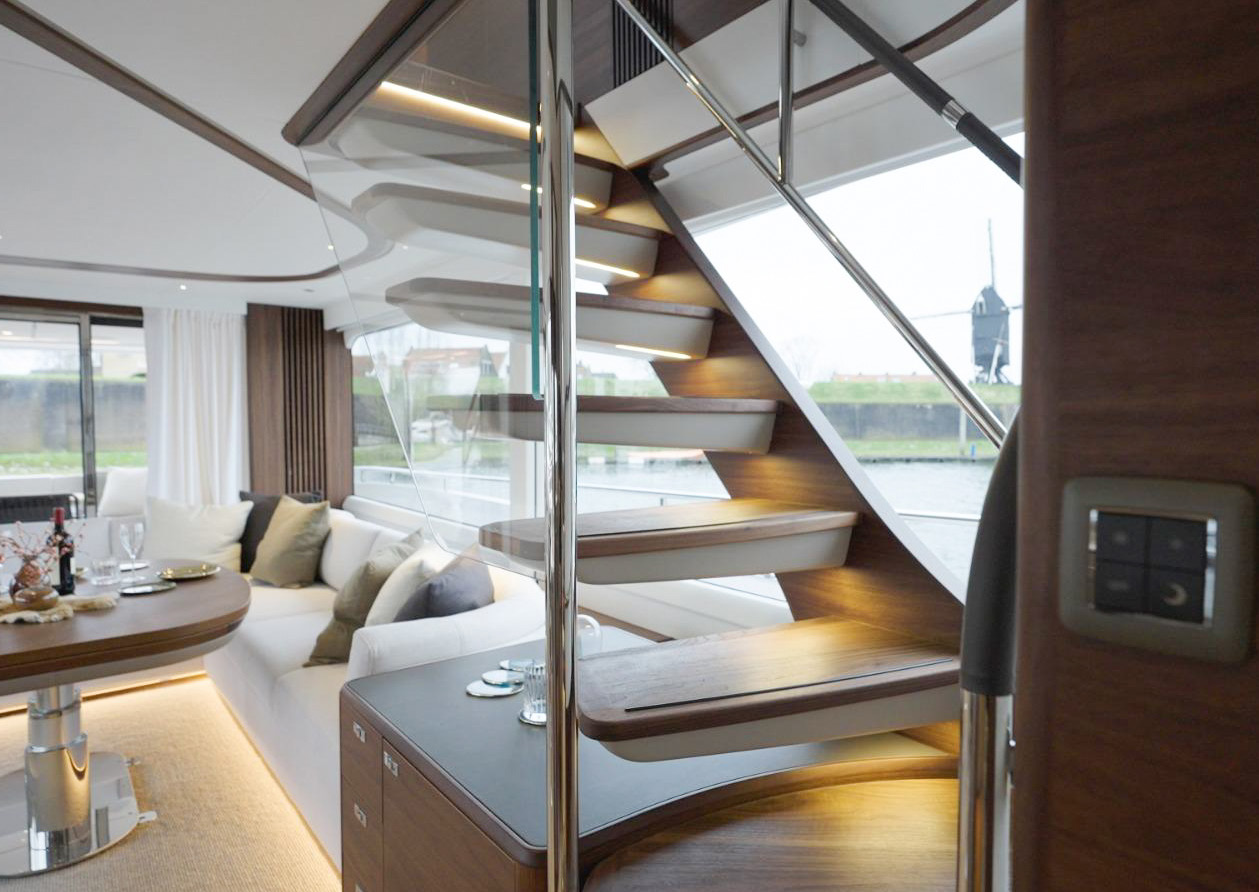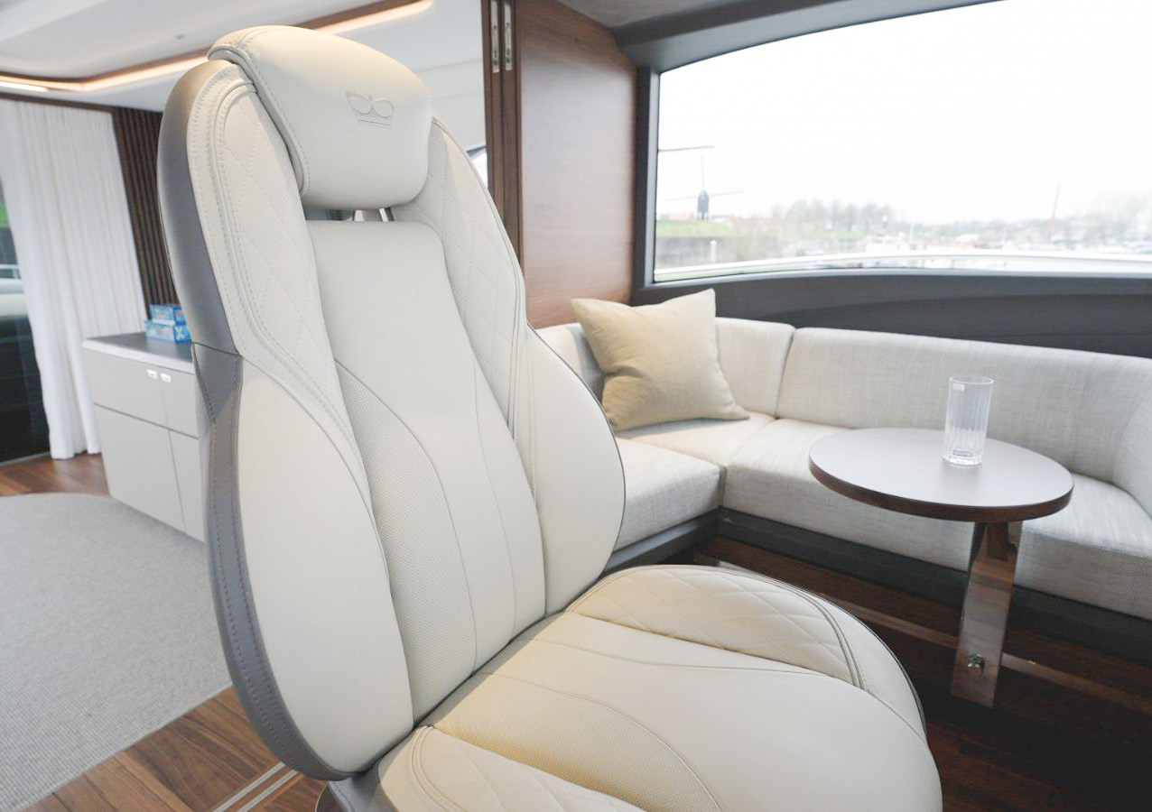 Благодаря увеличенному на 30% внутреннему объему, по сравнению с традиционной яхтой с флайбриджем, простор и объем салона определяют X-Class, и вы чувствуете это, как только входите на борт. Внешний мир открывается через большие окна, которые простираются по обеим сторонам модернизированной главной палубы, охватывая салон, камбуз и переднюю обеденную зону. Использование естественного и искусственного освещения, инновационный дизайн и изысканные материалы сочетаются здесь, чтобы создать идиллическое пространство, в котором можно приятно провести время.
