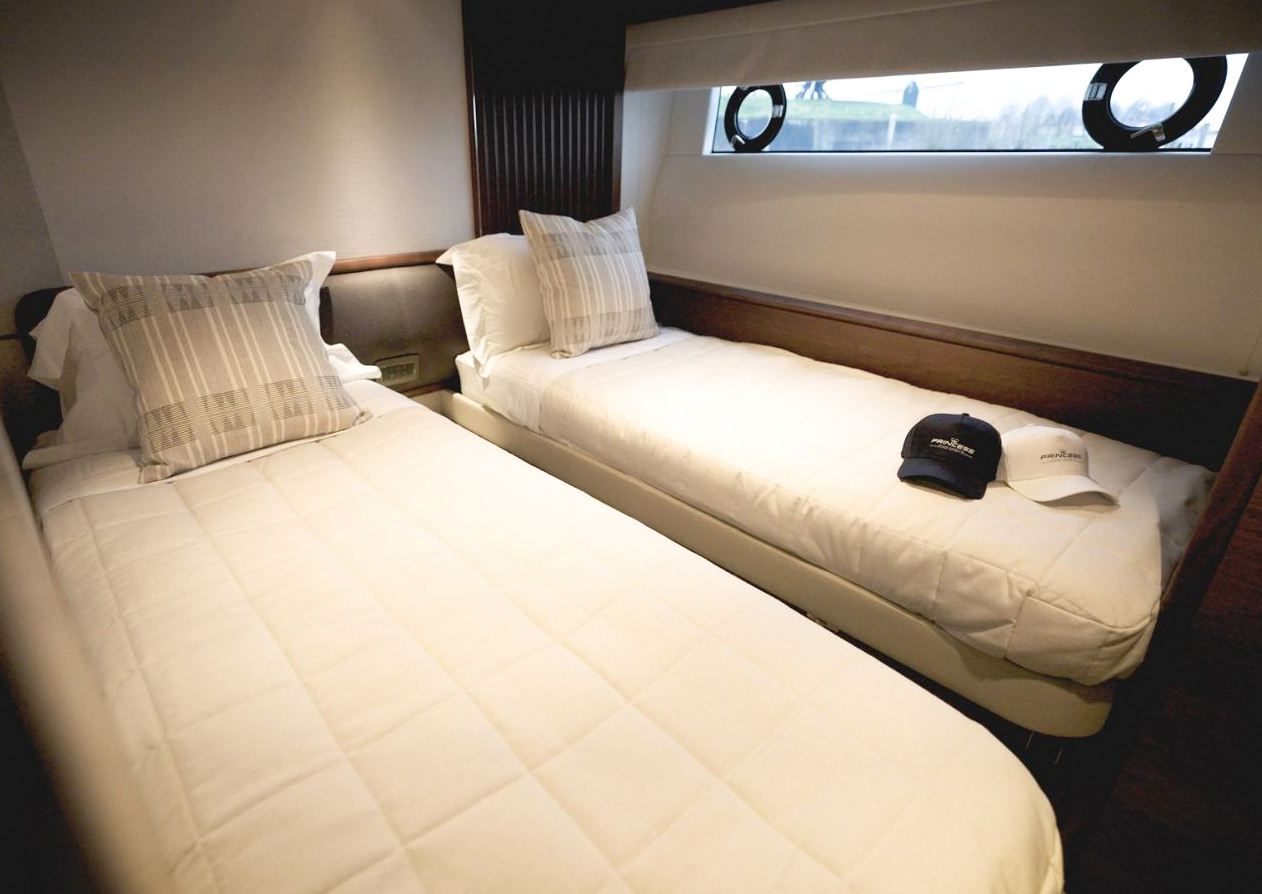 Два дизельных двигателя MAN V12-1900 вырабатывают суммарную мощность 3800 л.с., разгоняя яхту до захватывающей максимальной скорости в 31 узел, при этом сохраняя крейсерскую скорость в 25 узлов, при расходе топлива всего 498 литров в час. Добавьте опциональные 8800-литровые топливные баки с системой мореходности Princess, и вы получите поистине выигрышную комбинацию. Стабилизаторы Sleipner Vector-Fin успокаивают качку и на ходу, и на якоре, а пропорциональные носовые и кормовые подруливающие устройства, а также кормовой швартовочный узел делают тесные марины простыми для одиночного пребывания.