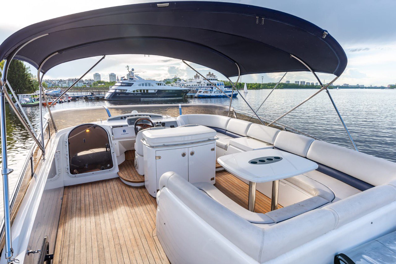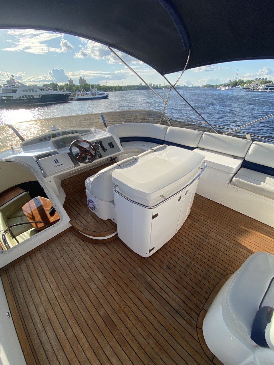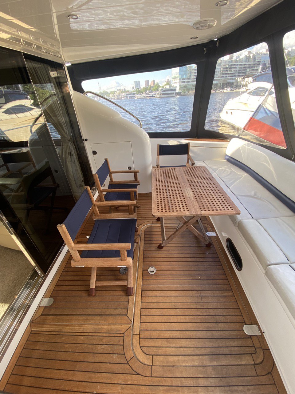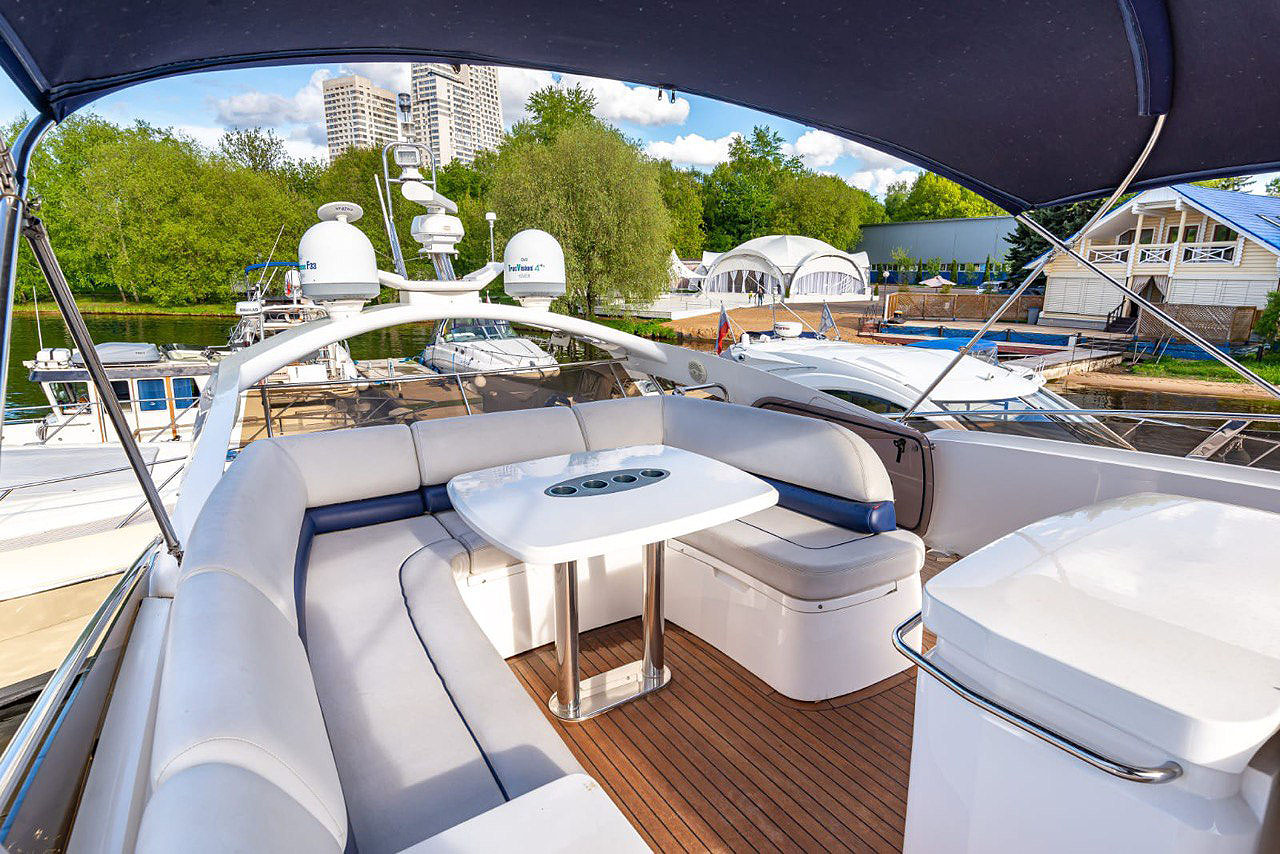 Для удобства был установлен ходовой тент с возможностью быстрой уборки, обеденная зона на флайбридже увеличена, установлена качественная музыкательная и развлекательная системы.