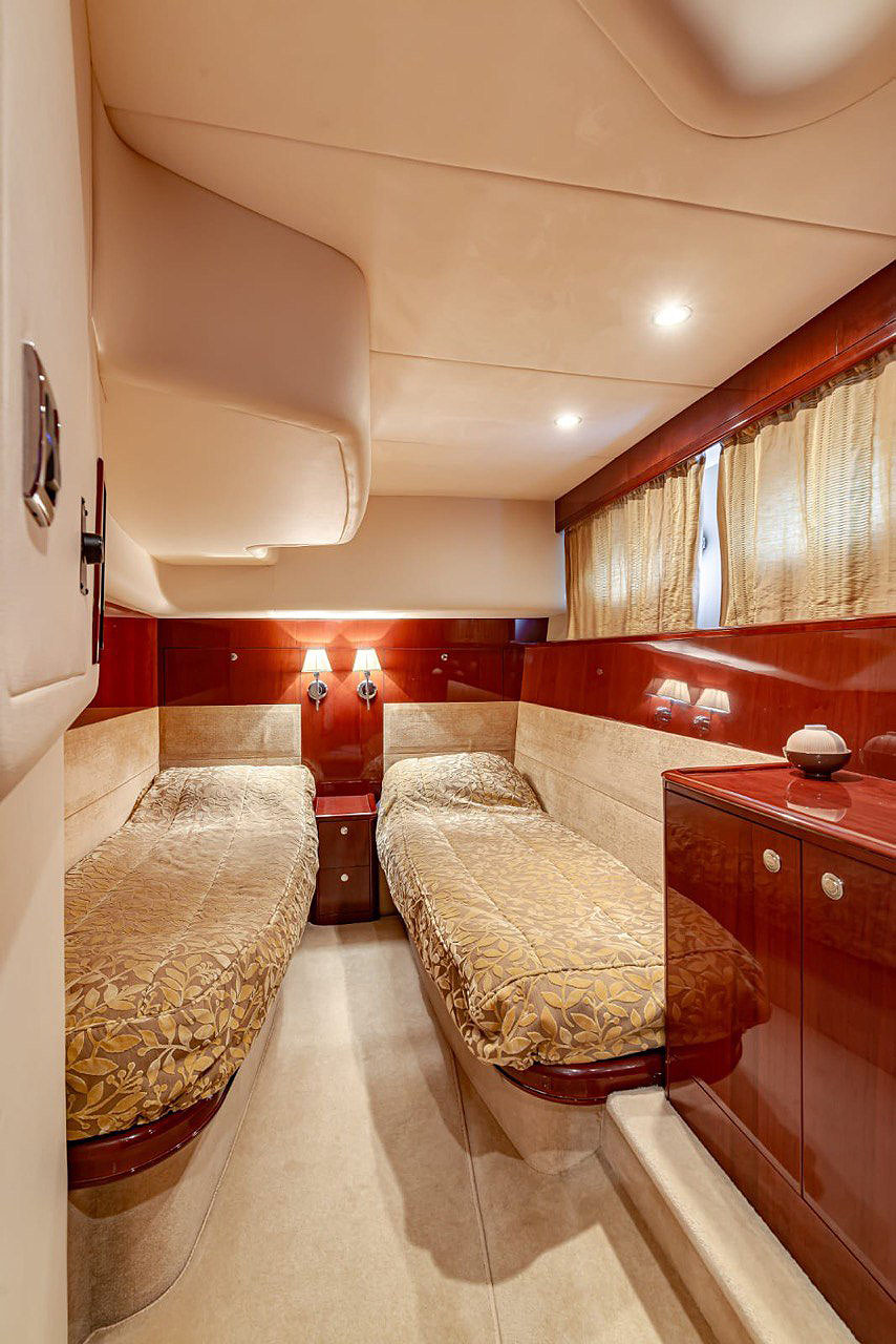 На борту 3 каюты с 2 санузлами и раскладывающийся диван в салоне, что позволяет разместить на борту на ночь до 8 человек. Каюта капитана с собственным санузлом расположена отдельно.
