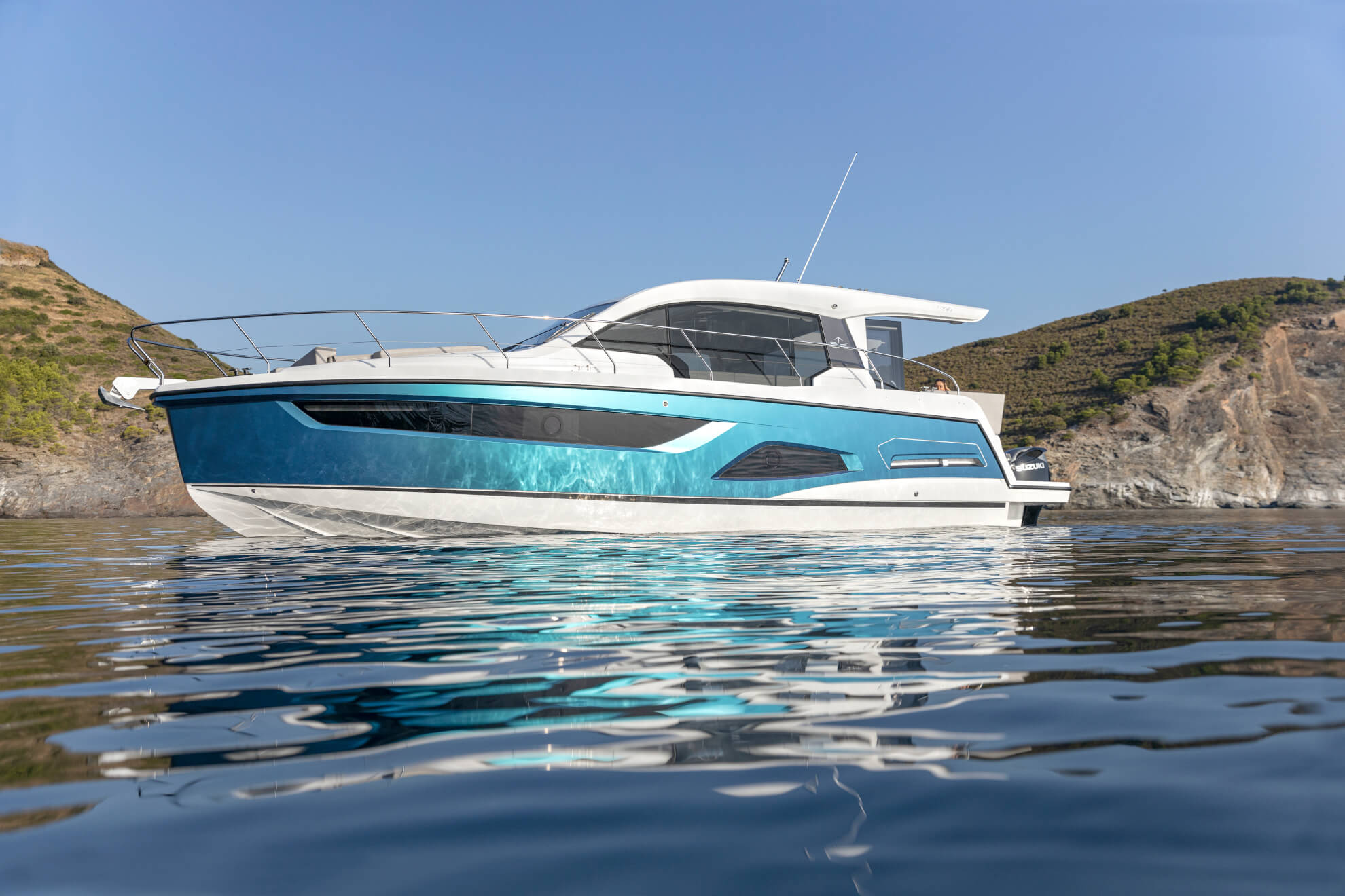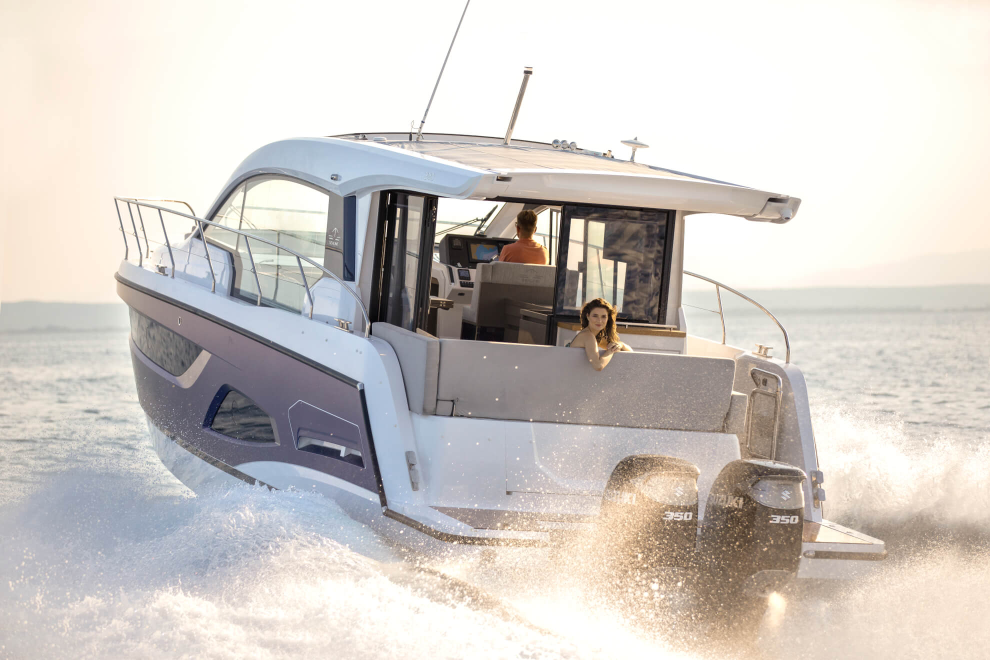 - 2 боковые платформы для купания из стеклопластика, лестница для купания с поручнями, душ с горячей и холодной водой и открывающиеся ворота из нержавеющей стали на корме