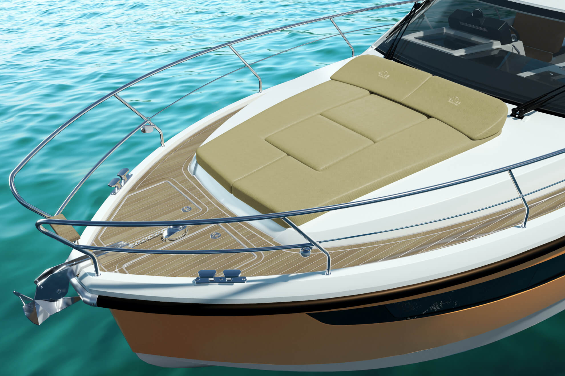 - Палуба из стеклопластика с нескользящим покрытием: изофталевый гелькоут, цвет: STAR WHITE (1-й слой - винилэфирная смола), двойной самоотливной якорный отсек, якорная направляющая из нержавеющей стали