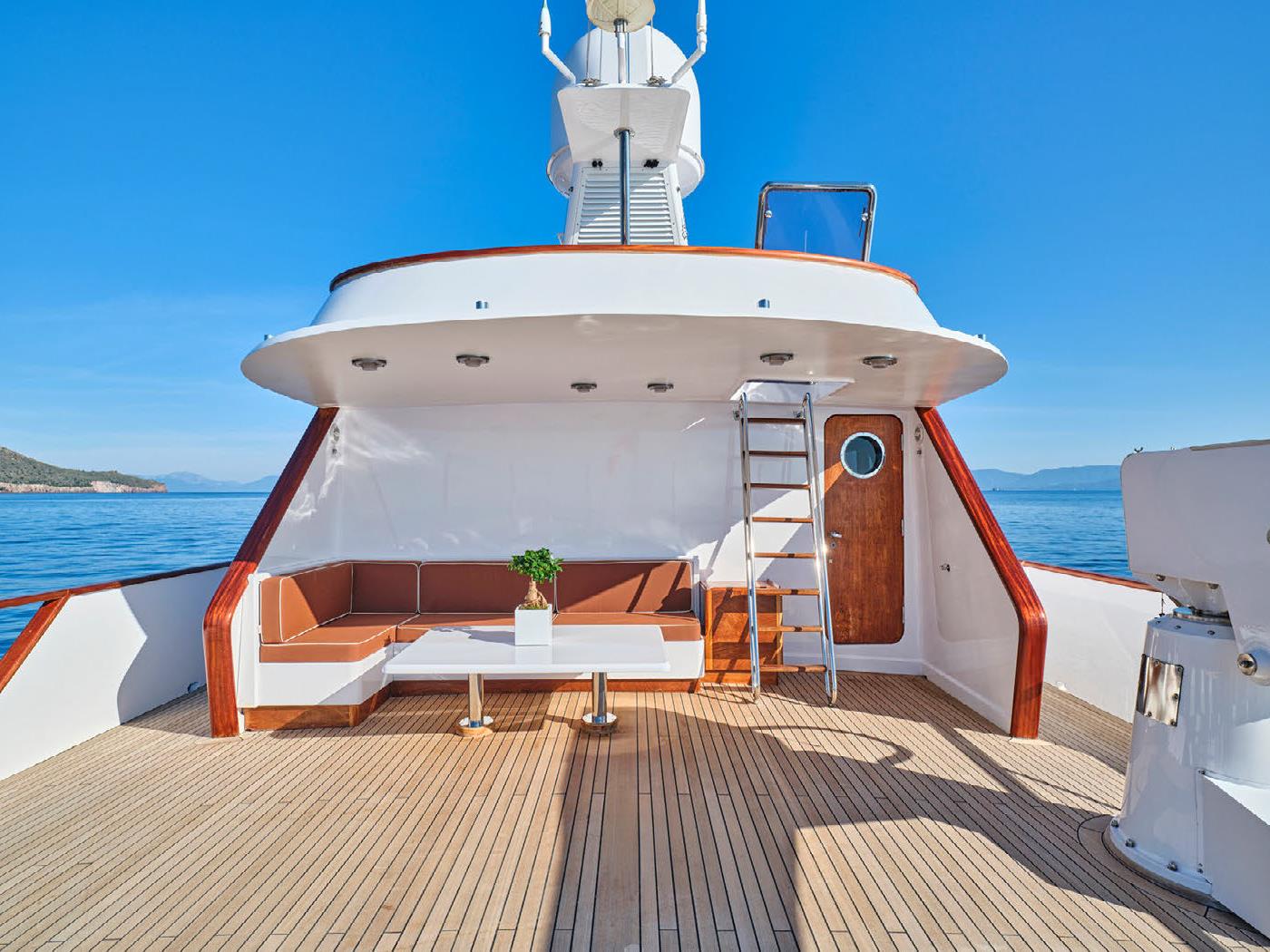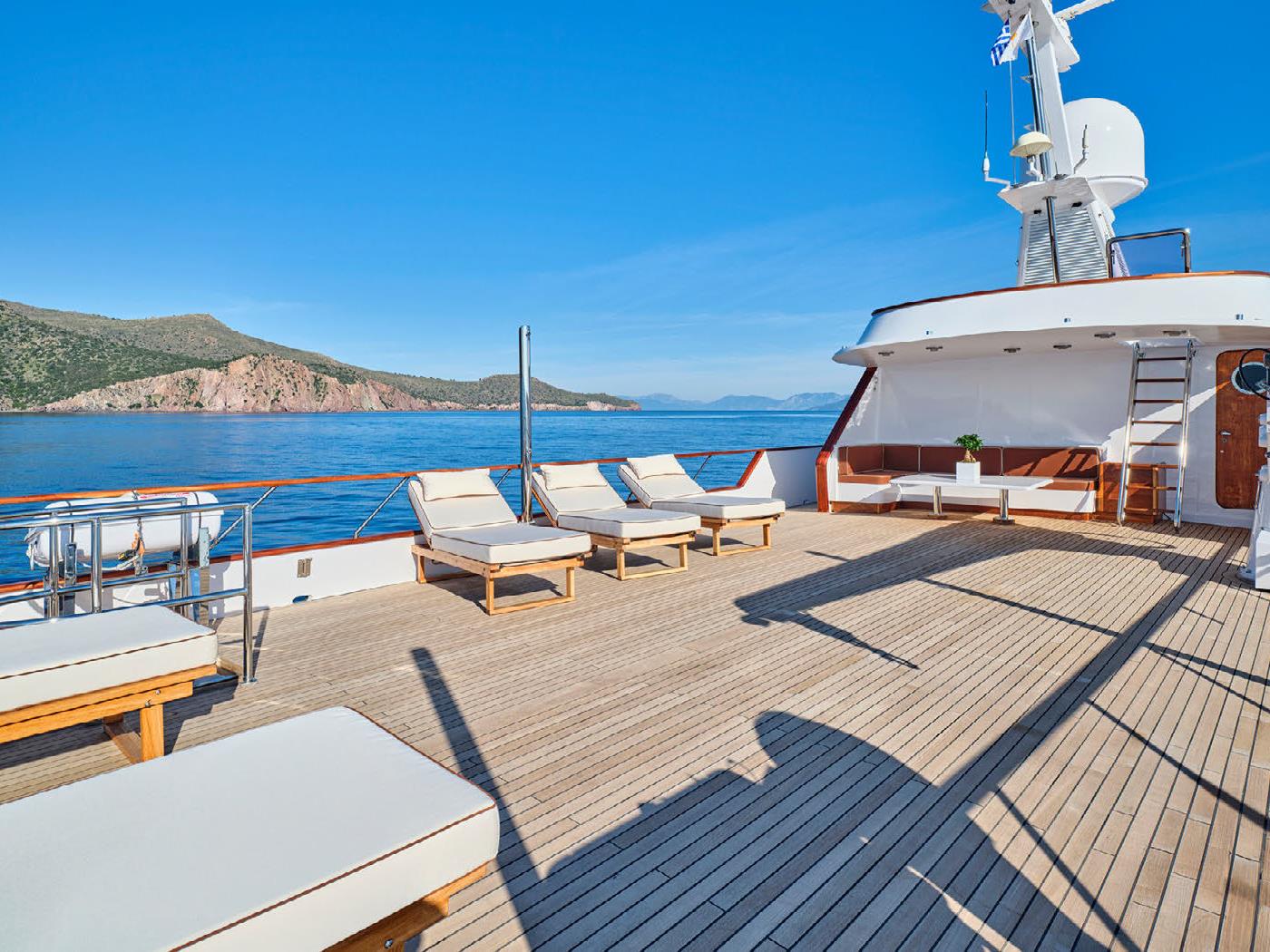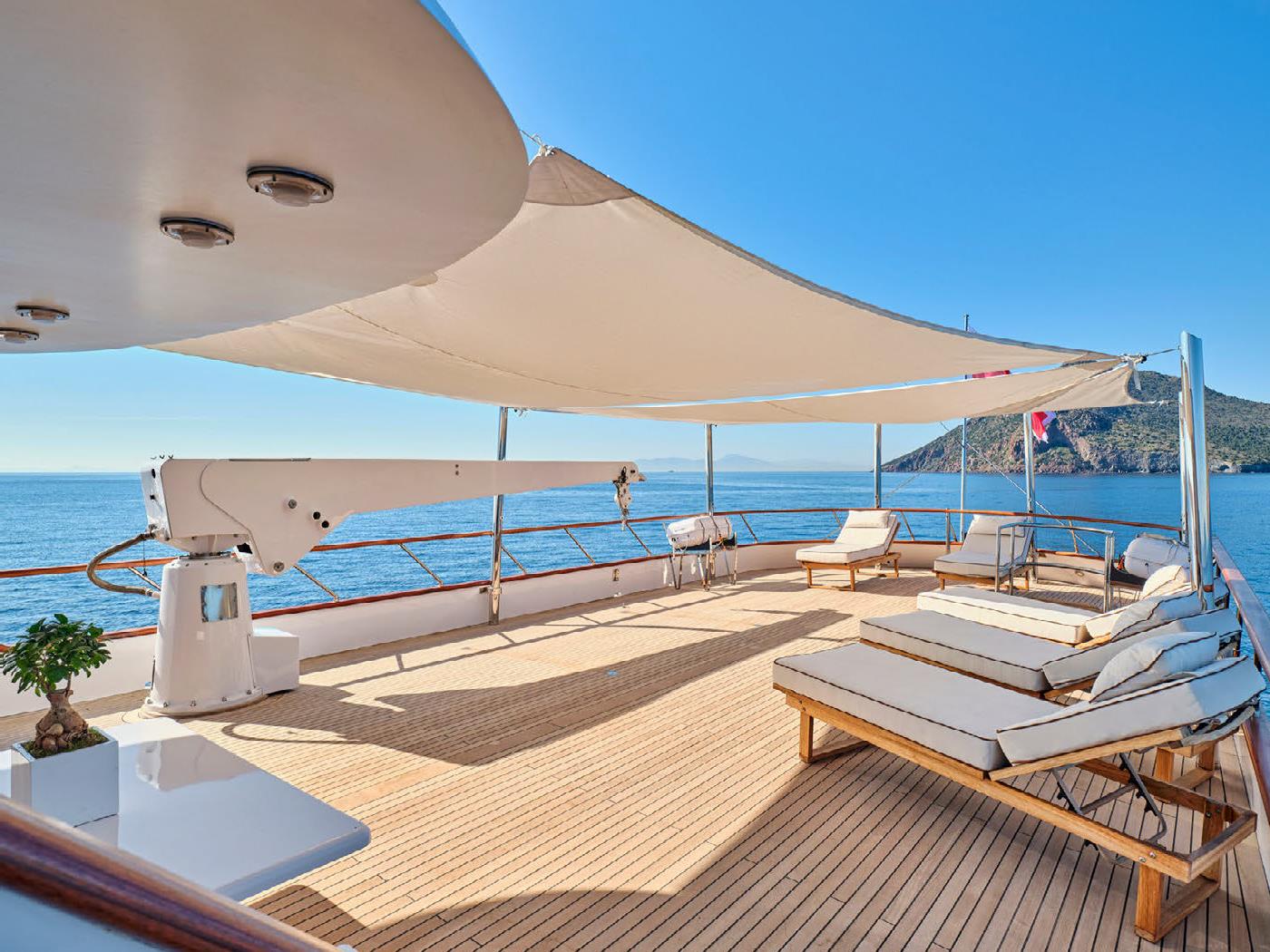 Помимо уютных внутренних помещений, яхта предлагает множество удобств на открытом воздухе, от просторной кормовой верхней палубы до открытых шезлонгов и зон для принятия солнечных ванн, обеспечивая гостям возможность наслаждаться морем при каждой возможности.