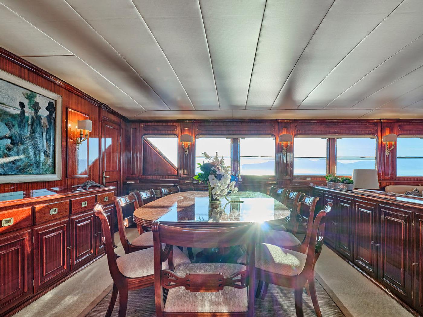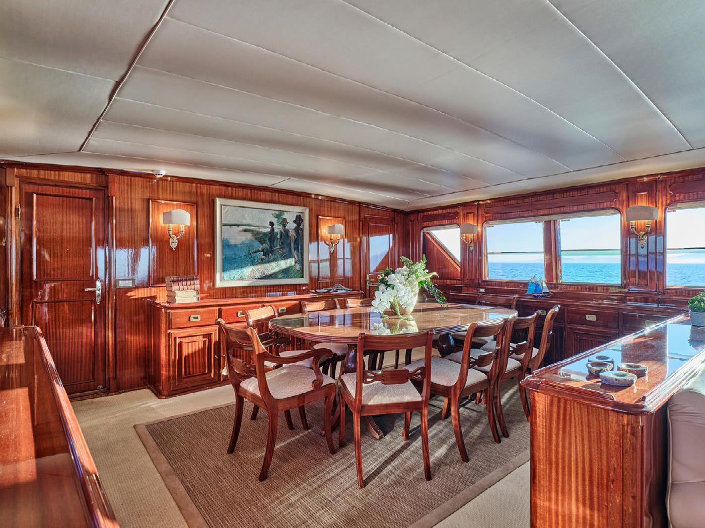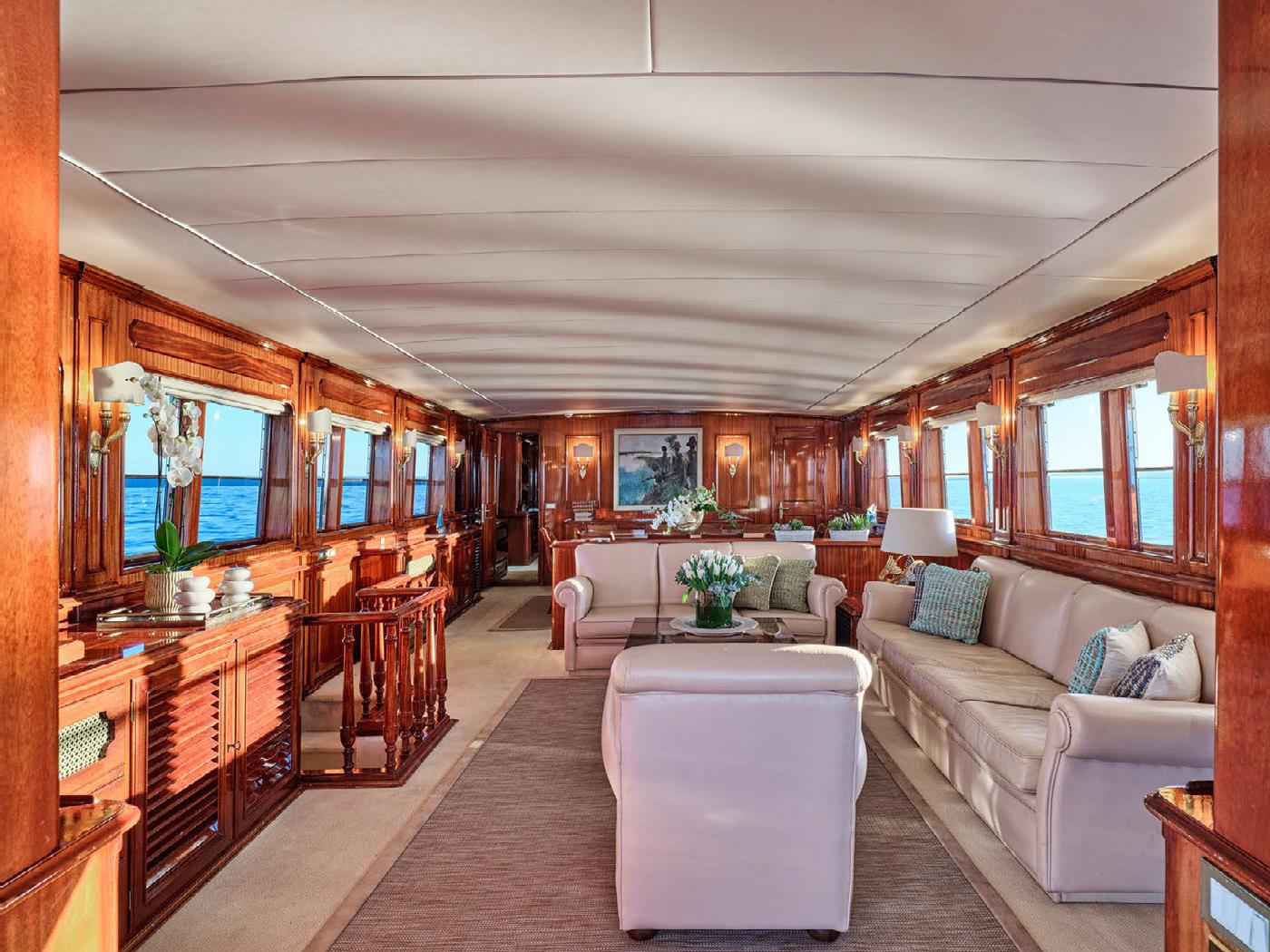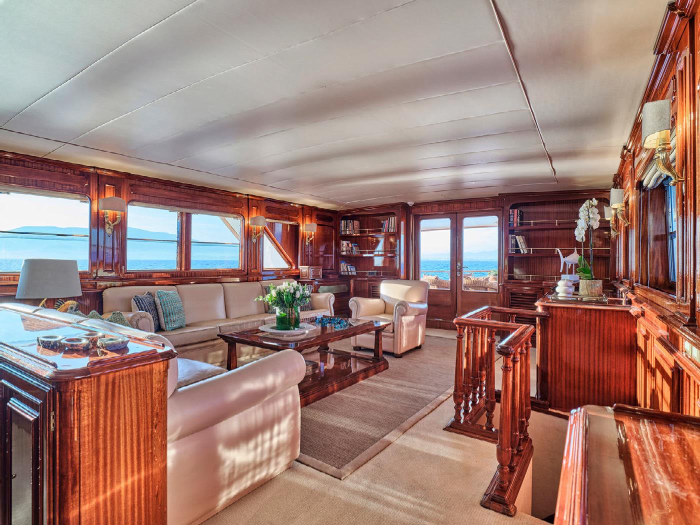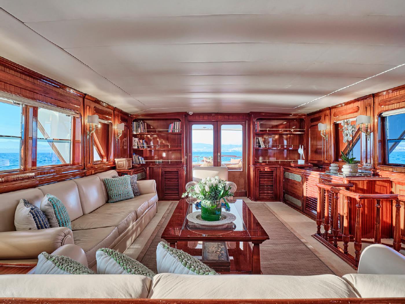 Отделка из красного дерева по всей яхте, обеденная зона в носовой части, вмещающая 10 человек. Зона отдыха с удобными диванами и 55-дюймовым телевизором Sony с прямым выходом на открытую кормовую палубу.