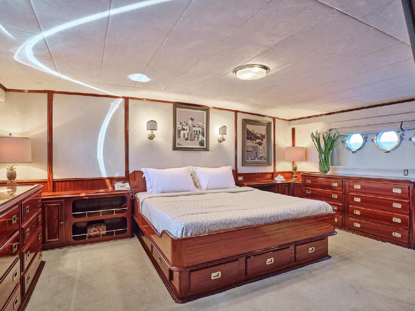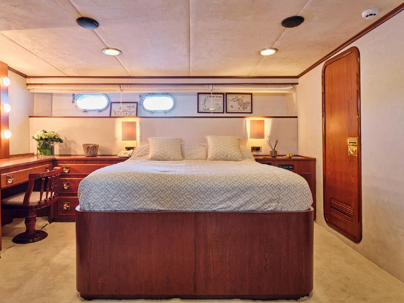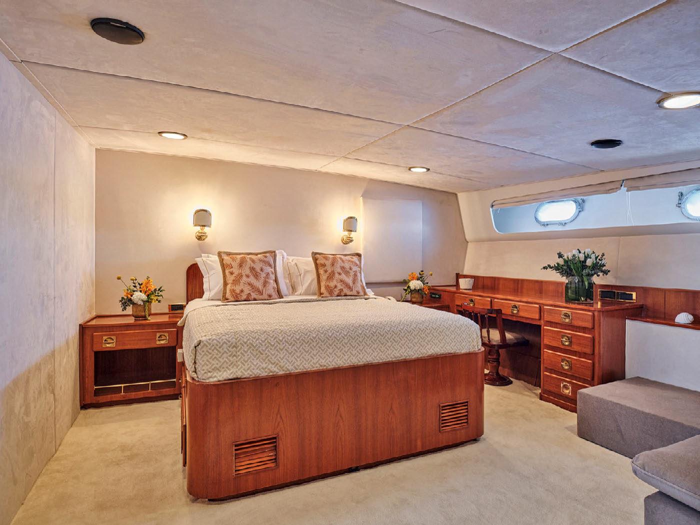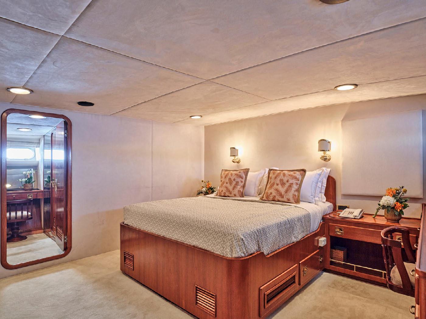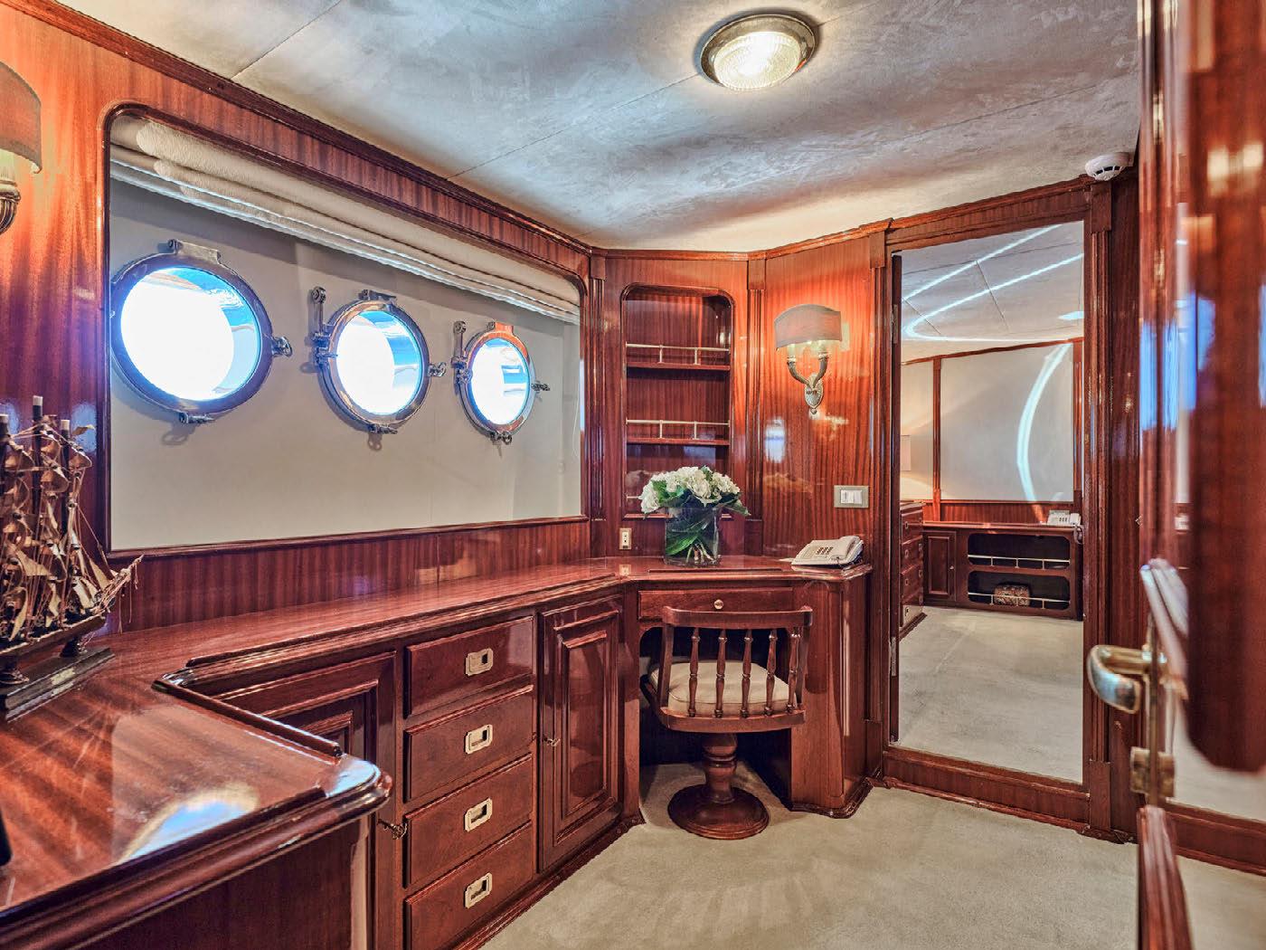 На главной палубе яхты расположена просторная каюта владельца с отдельным кабинетом/офисом, обеспечивающая комфорт и уединение. Отделанная по всему корпусу красным деревом, каюта отличается элегантными деталями и наполнена естественным светом благодаря большим окнам.
