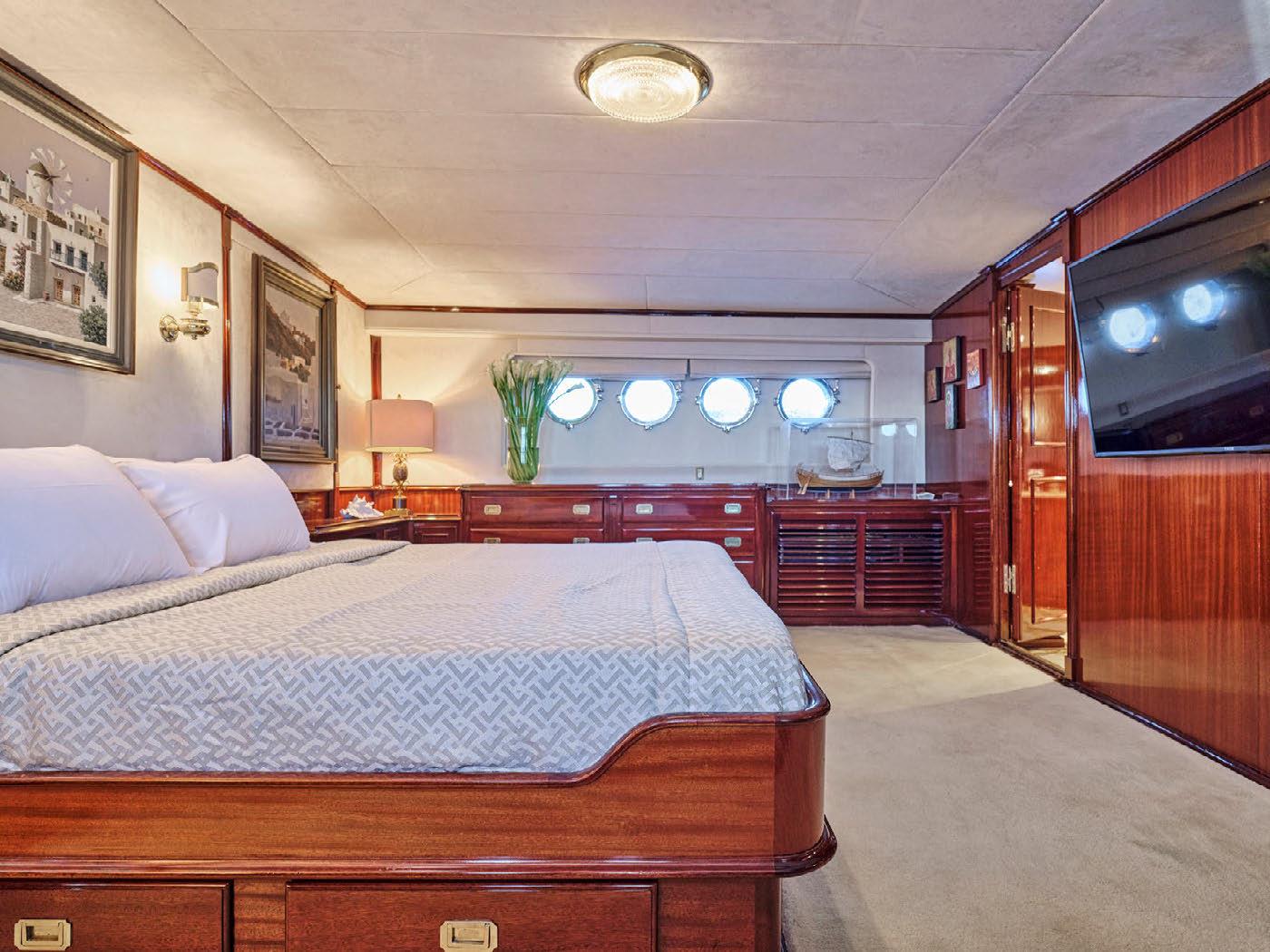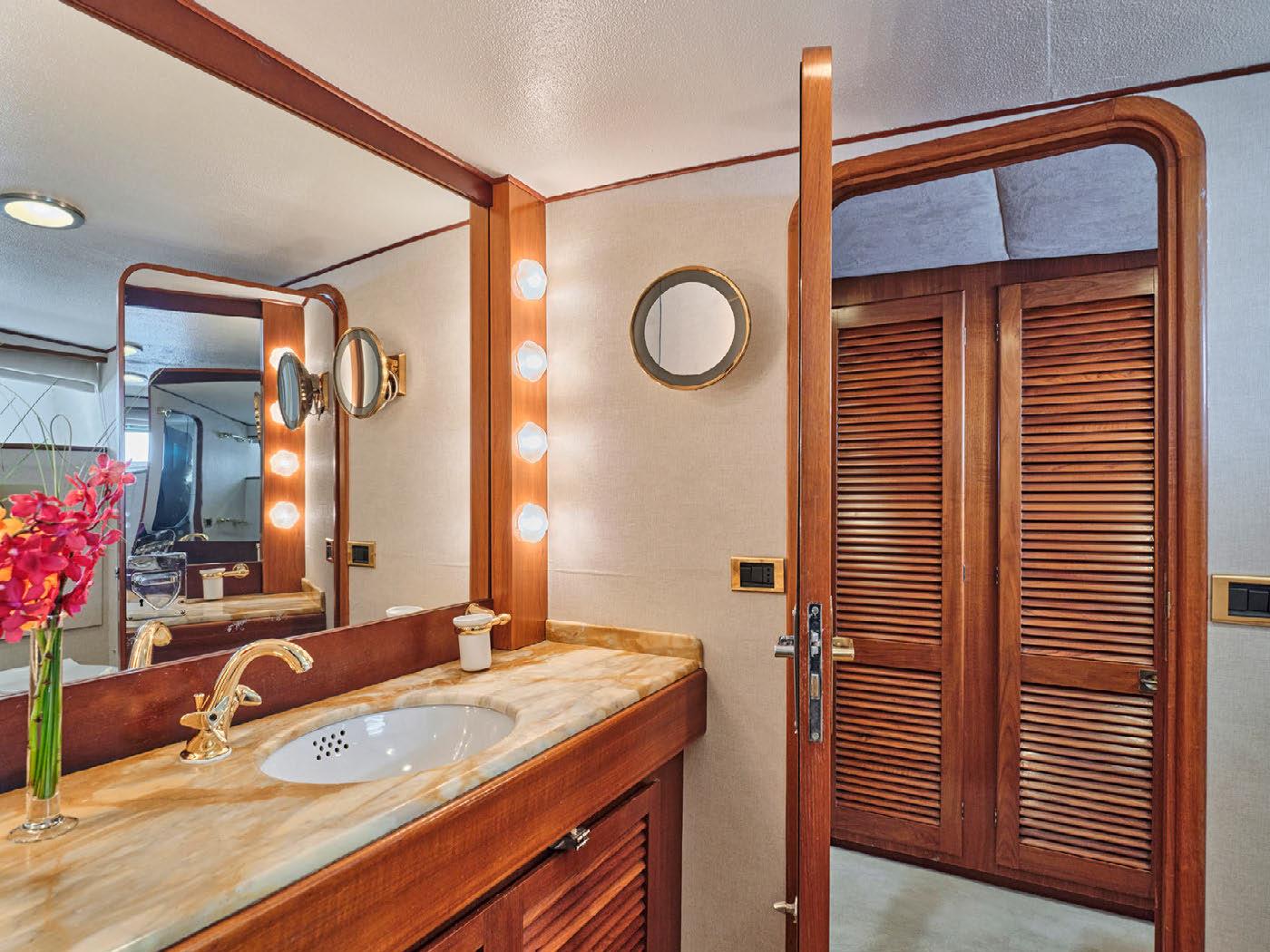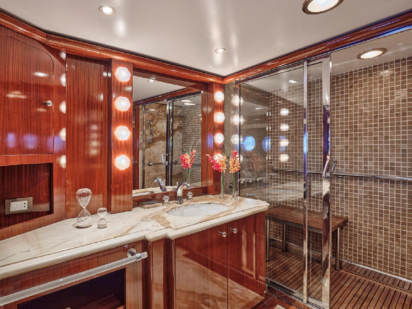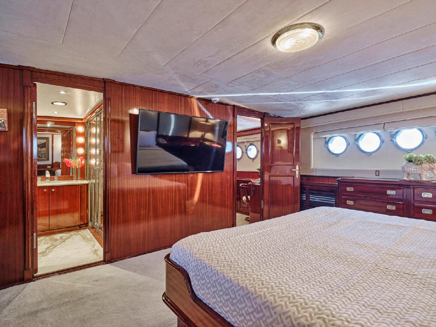 На главной палубе яхты расположена просторная каюта владельца с отдельным кабинетом/офисом, обеспечивающая комфорт и уединение. Отделанная по всему корпусу красным деревом, каюта отличается элегантными деталями и наполнена естественным светом благодаря большим окнам.