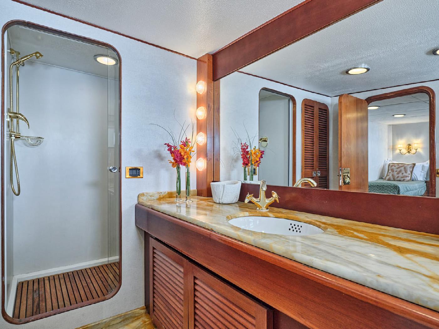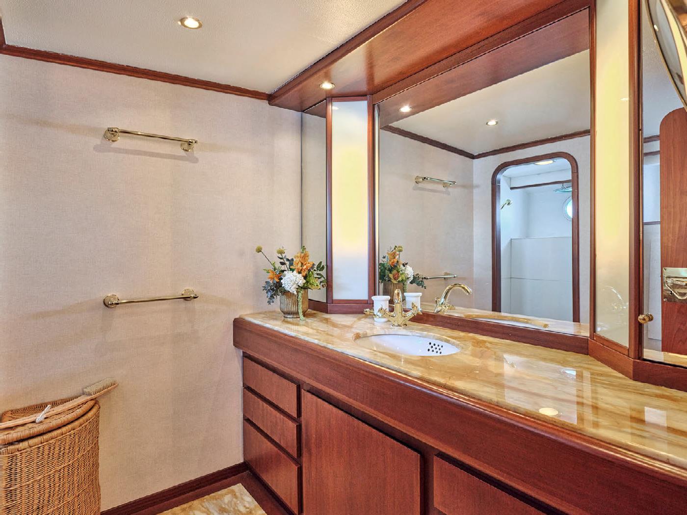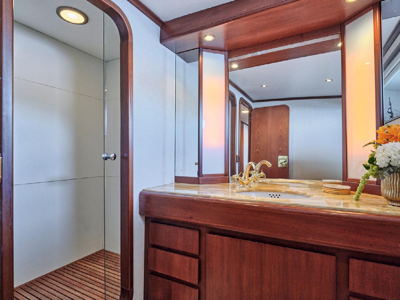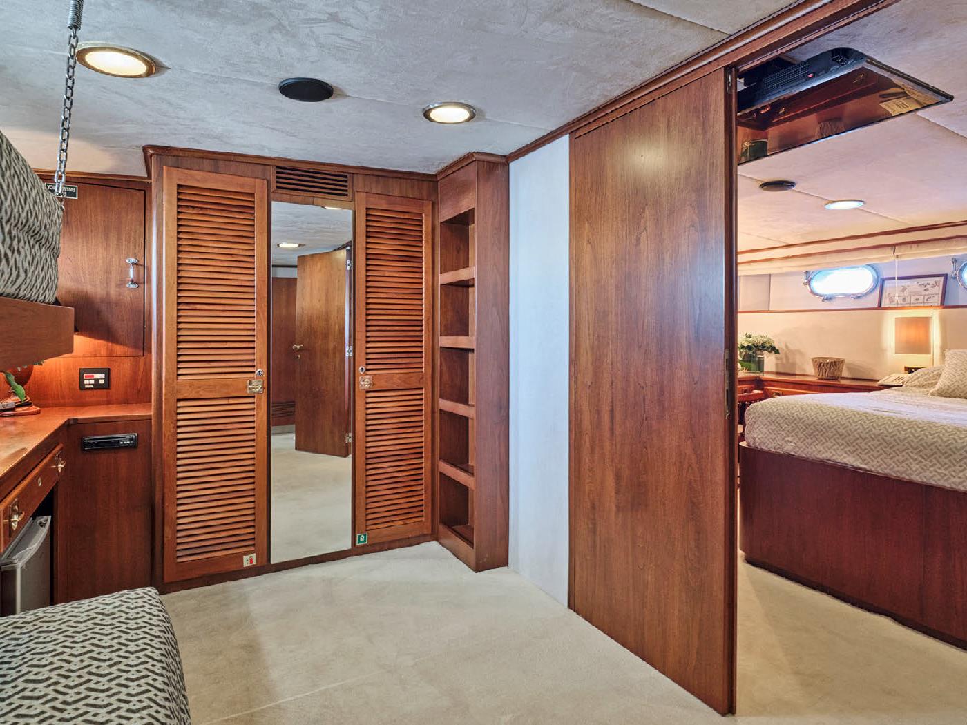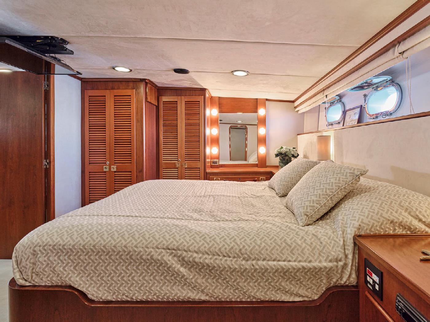 На главной палубе яхты расположена просторная каюта владельца с отдельным кабинетом/офисом, обеспечивающая комфорт и уединение. Отделанная по всему корпусу красным деревом, каюта отличается элегантными деталями и наполнена естественным светом благодаря большим окнам.