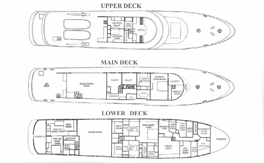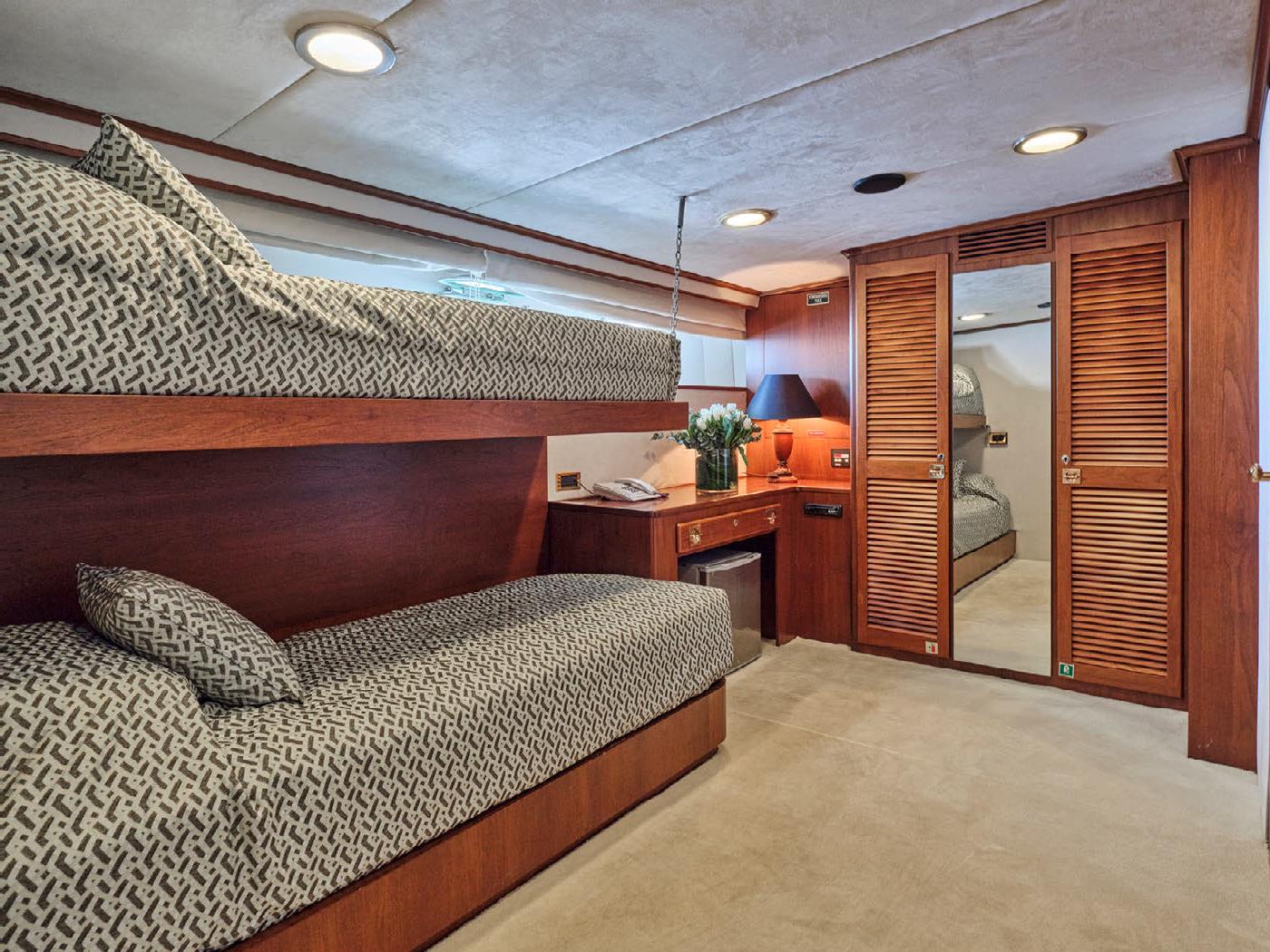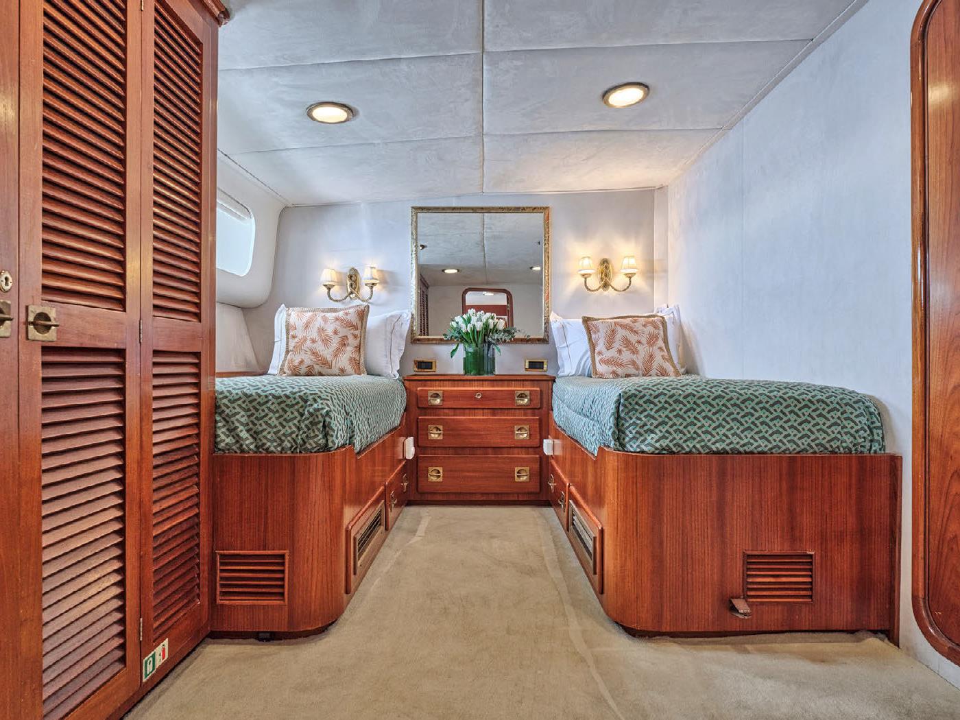 Четыре каюты расположены в носовой части нижней палубы, рядом с просторной кают-компанией и камбузом. Отдельный доступ на палубу обеспечивает конфиденциальность и уединение для гостей. Каюта капитана стратегически расположена на верхней палубе рядом с мостиком, обеспечивая прямой и удобный доступ к навигационной зоне.
