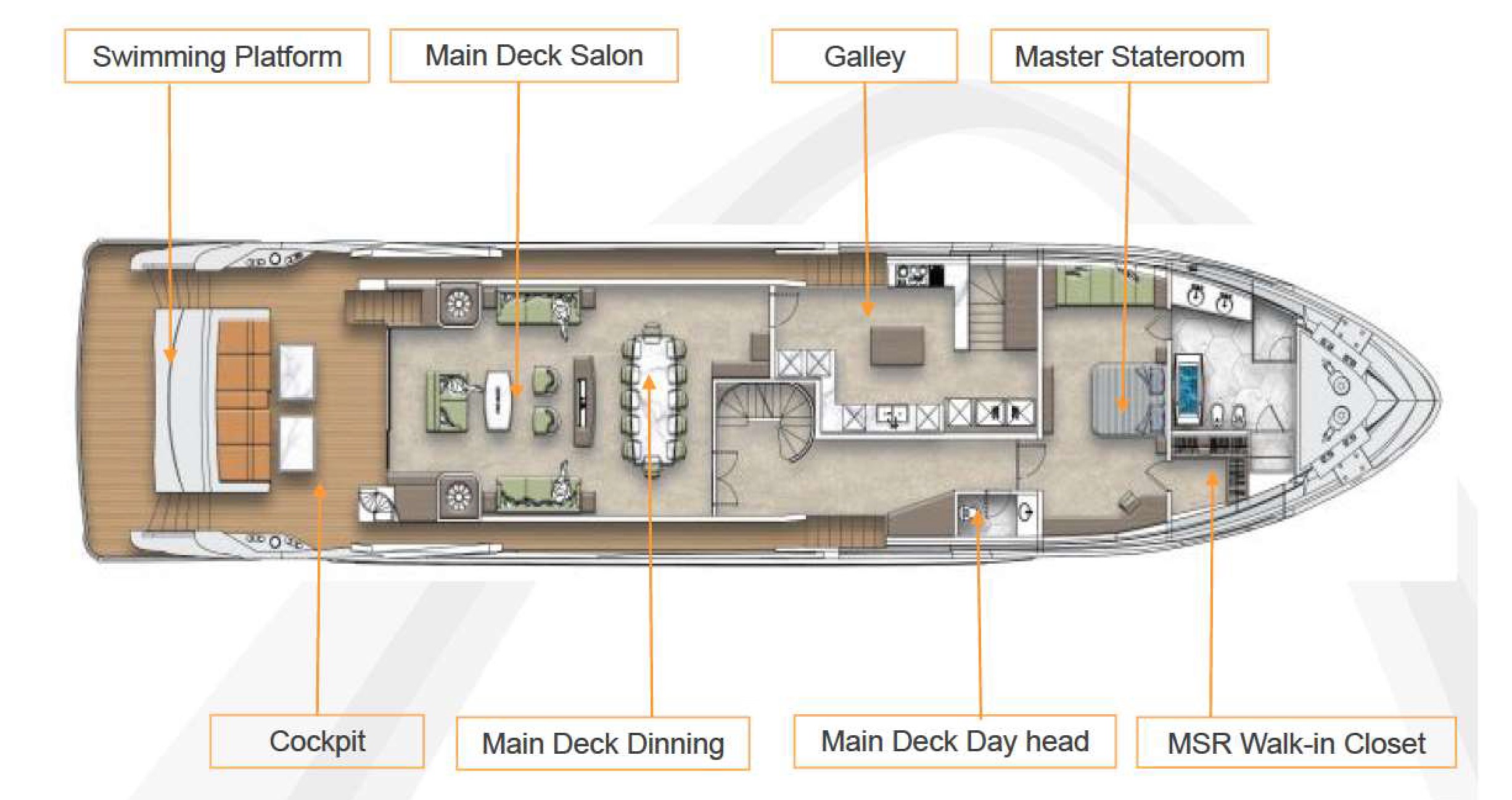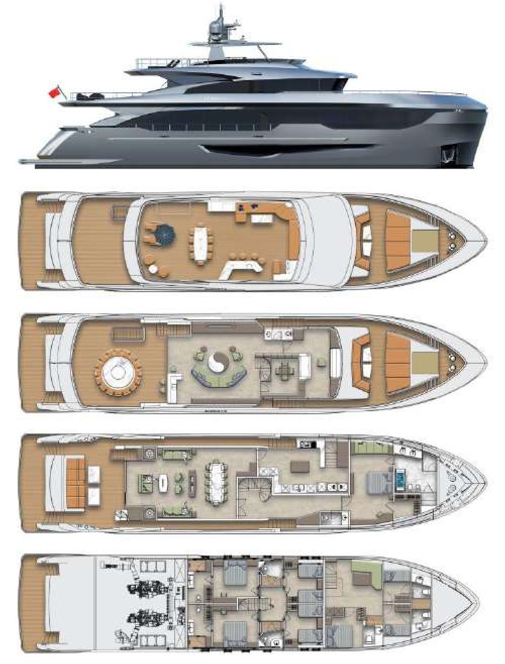 Клиенты могут выбрать для своей яхты цвет и фактуру оформления интерьеров из палитры предложенных видов дерева и материалов для мебели, один из трех вариантов двигателей и генераторов, а также ряд дополнительных технических устройств.
