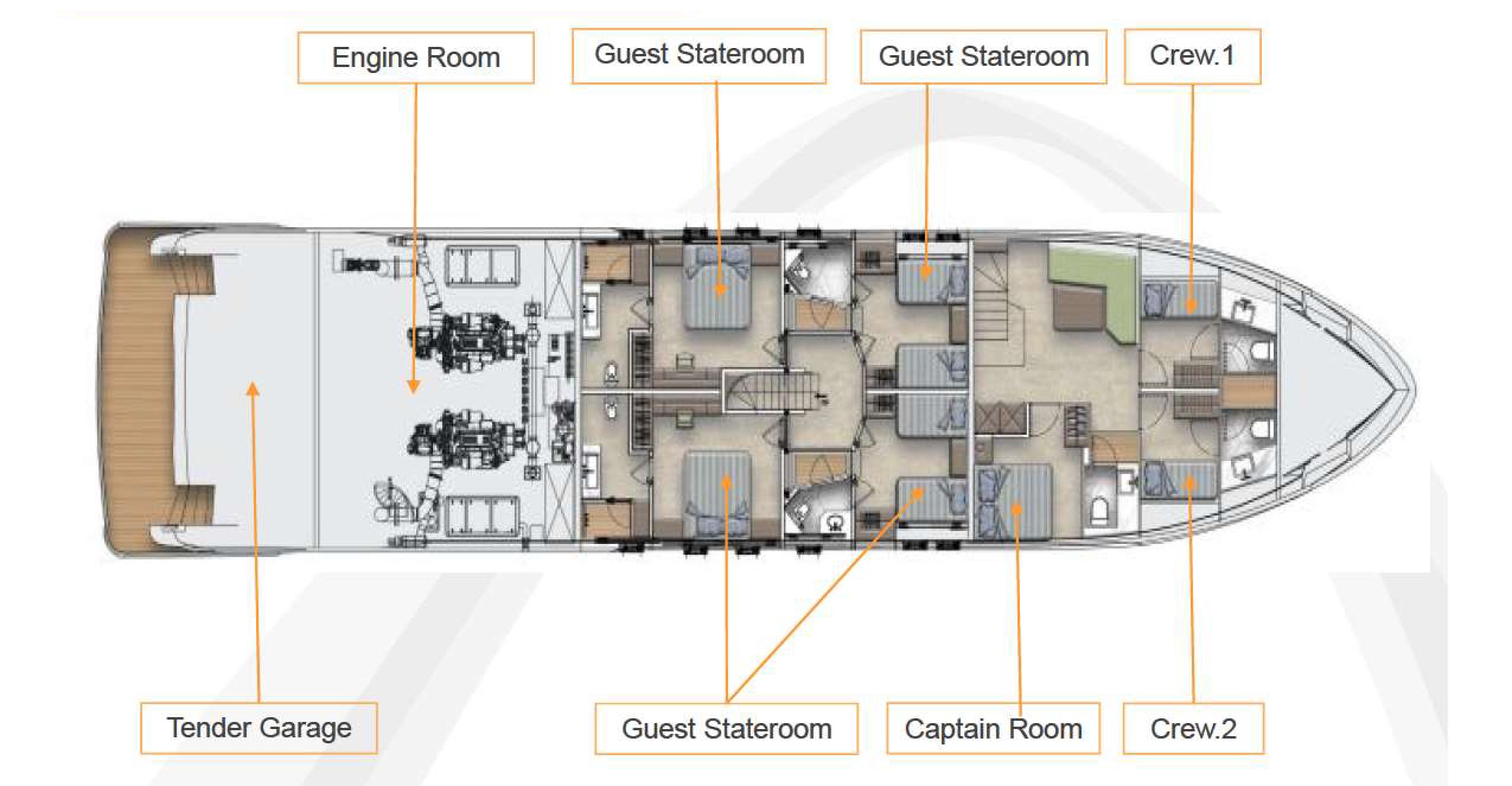Главная палуба яхты включает салон и главную каюту, которые предлагают захватывающие виды на 360 градусов. Флайбридж оборудован полной системой развлечений, джакузи и барной стойкой для непревзойденных впечатлений. Яхта также включает гараж с достаточным пространством для размещения одного 6-метрового тендера, расположенного в транце. С оптимальной крейсерской скоростью 11 узлов TY116 уделяет первостепенное внимание энергоэффективности и экологической эффективности, в то время как ее два двигателя CAT 1920 л.с. позволяют развивать максимальную скорость 18 узлов. Мы предлагаем обширные возможности настройки, позволяющие вам адаптировать как интерьер, так и экстерьер TY116, включая возможность установки джакузи на флайбридже.